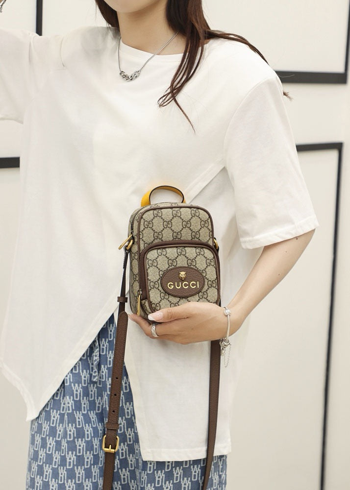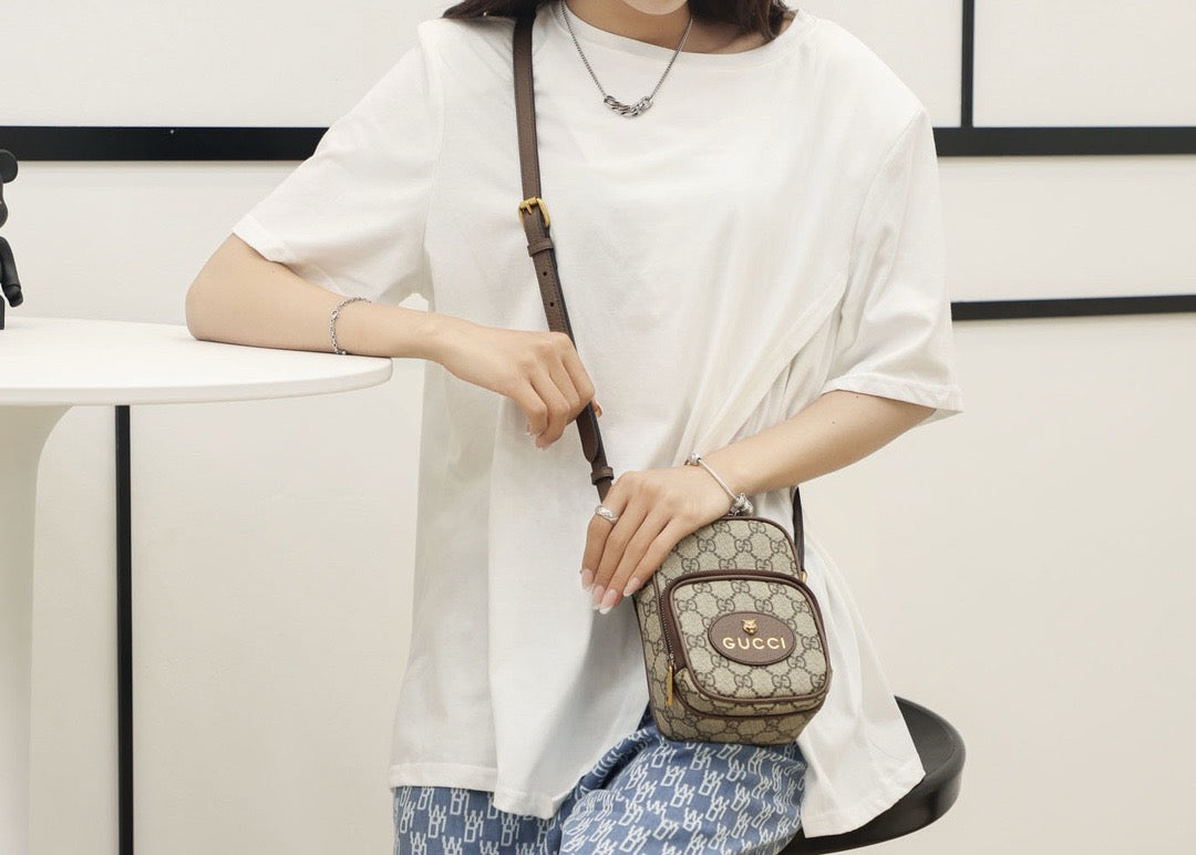 이 미니 크로스백은 구찌의 시그니처 GG 슈프림 캔버스를 바탕으로, 전면에는 고풍스러운 브라운 가죽 라벨이 부착되어 브랜드 감성을 강조합니다. 조절 가능한 웹 스트랩이 있어 숄더 또는 크로스 스타일로 착용할 수 있으며, 가볍고 간편하게 휴대하기 좋은 디자인입니다.