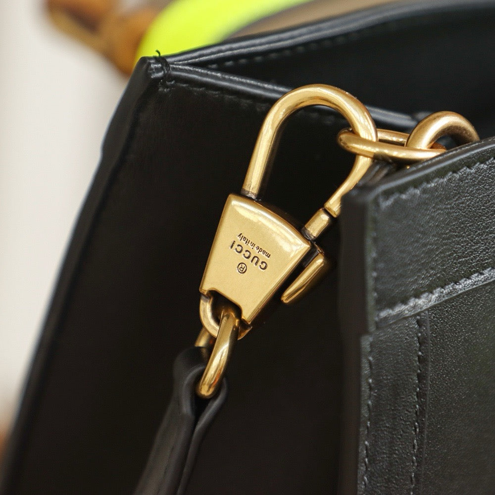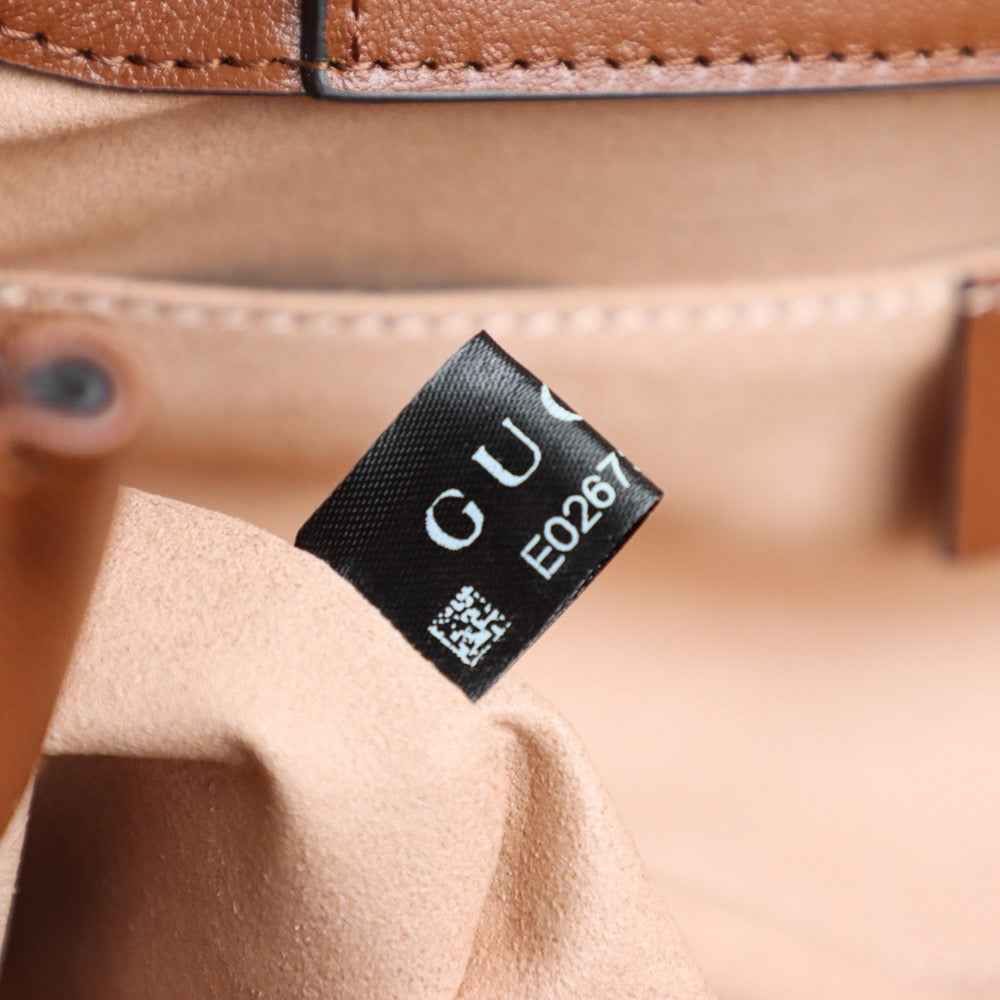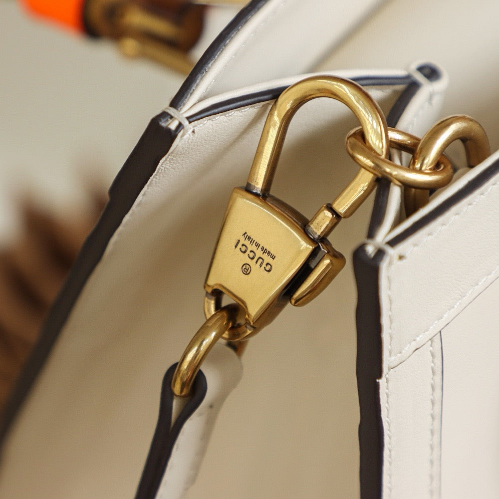 구조감 있는 실루엣에 유연한 가죽 바디가 조화를 이루며, 내부는 넓은 수납 공간과 지퍼 포켓, 슬립 포켓 등으로 구성되어 실용성을 높였습니다. 색상과 디자인에 따라 스트랩의 가죽 벨트 색상이 포인트가 되며, 구찌의 장인정신이 고스란히 반영된 디테일이 인상적입니다.