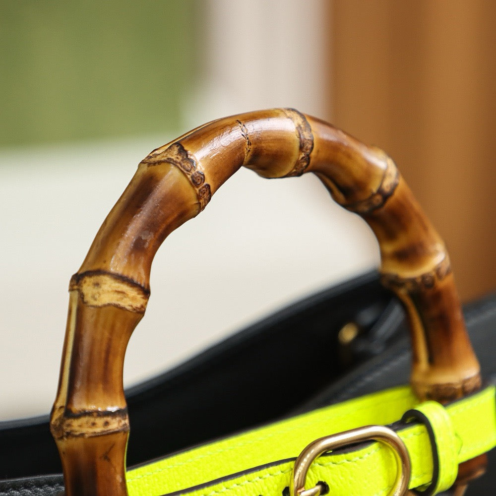 대나무 탑 핸들을 활용한 토트 스타일 외에도, 탈부착 가능한 스트랩을 통해 숄더 또는 크로스백 형태로도 착용 가능합니다.