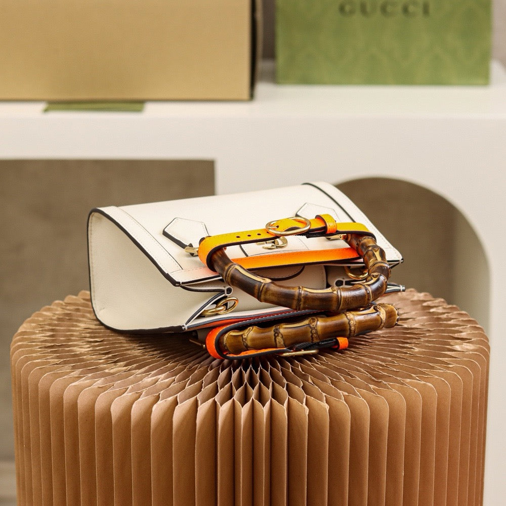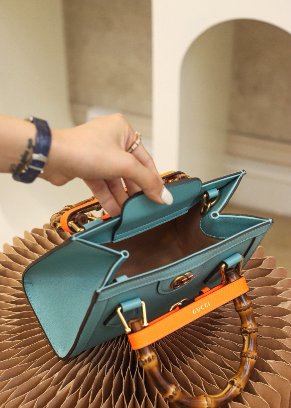 스몰 사이즈의 다이애나 백은 부드러운 가죽과 상징적인 대나무 핸들이 조화를 이루며, 가죽 벨트 디테일로 포인트를 줍니다. 탈부착 가능한 숄더 스트랩이 포함되어 있어 숄더 또는 크로스백으로 다양하게 연출할 수 있습니다.