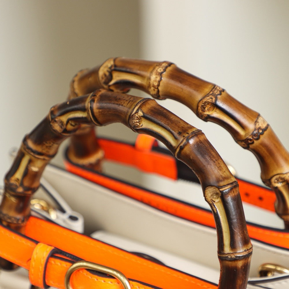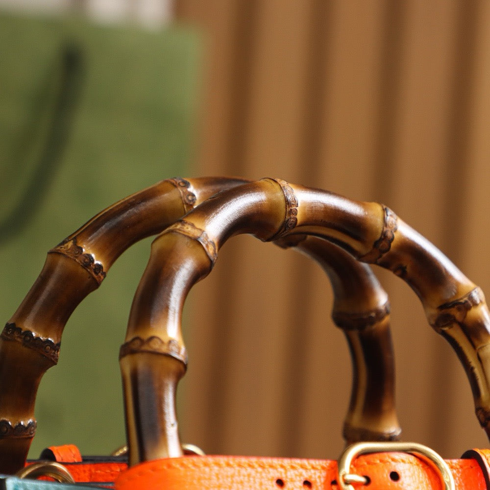 정제된 직사각형 실루엣과 매끄러운 가죽 마감, 그리고 대나무 핸들과 벨트 루프가 어우러져 유니크한 매력을 자아냅니다. 내부는 스웨이드 마감으로 처리되어 있으며, 슬립 포켓과 지퍼 포켓으로 구성되어 실용적인 수납이 가능합니다.