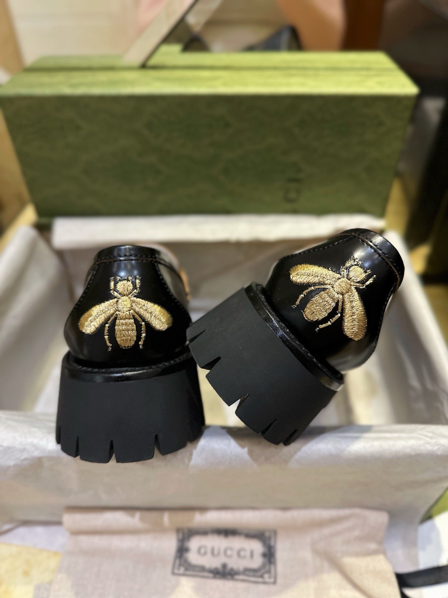 이 로퍼는 구찌를 상징하는 골드 톤 홀스빗 디테일과 두꺼운 러그 솔이 조화를 이루며, 정제된 클래식 룩과 캐주얼한 스트리트 감성을 동시에 아우릅니다. 무게감 있는 밑창은 착화 시 안정감을 더해주며, 날씨에 구애받지 않고 착용할 수 있는 실용성이 돋보입니다.