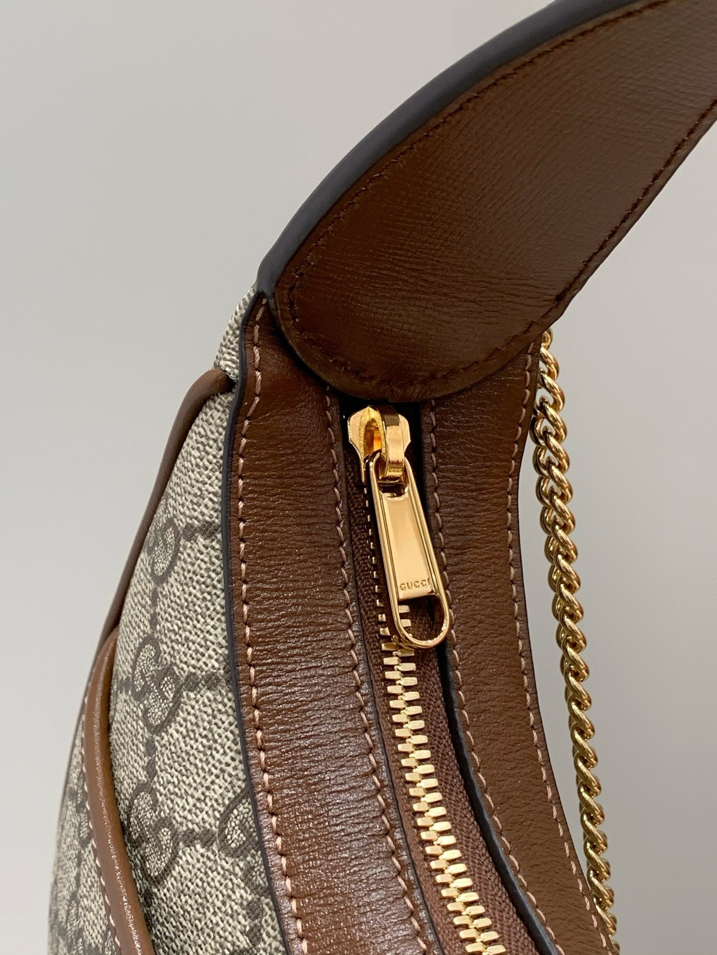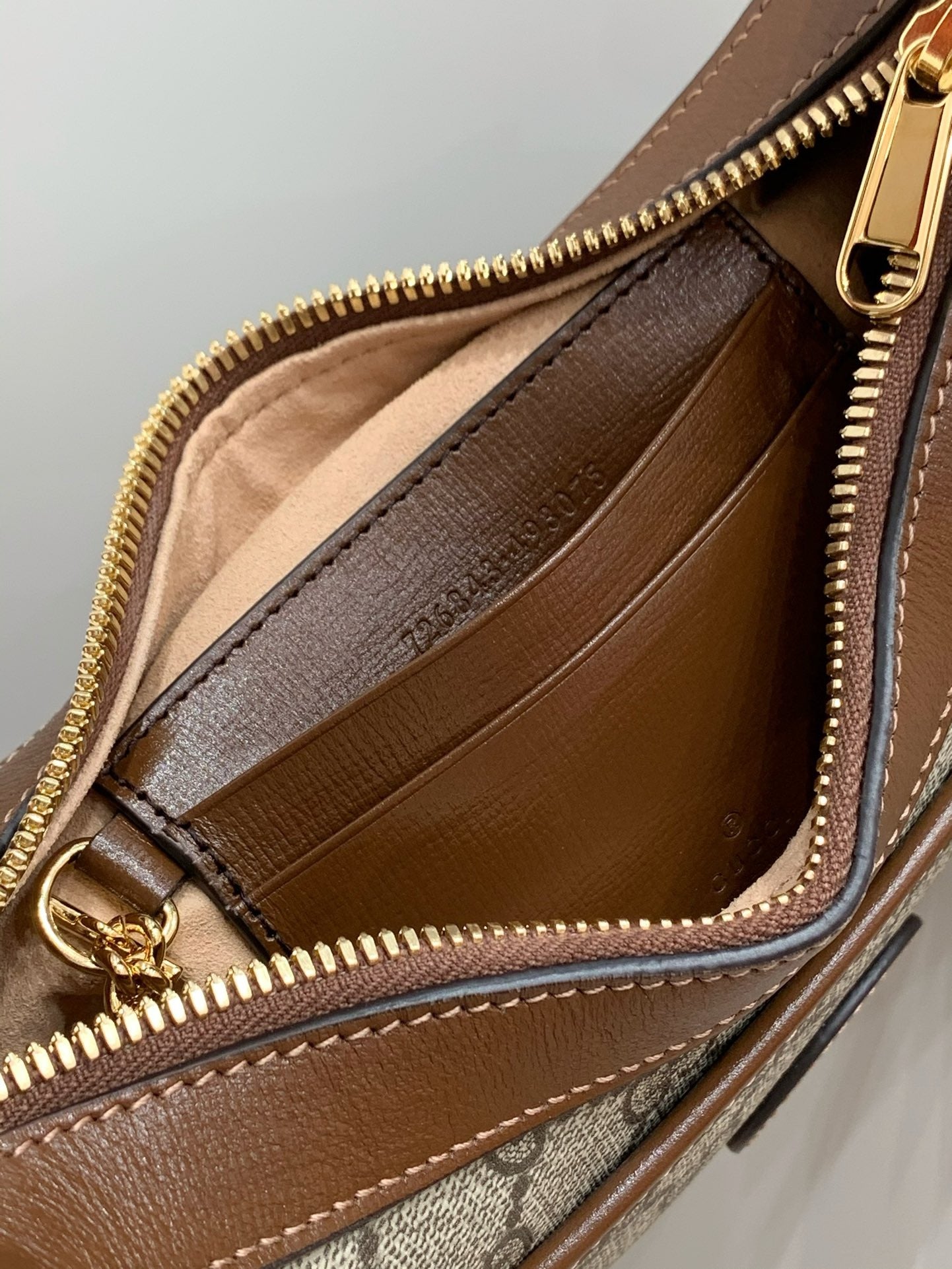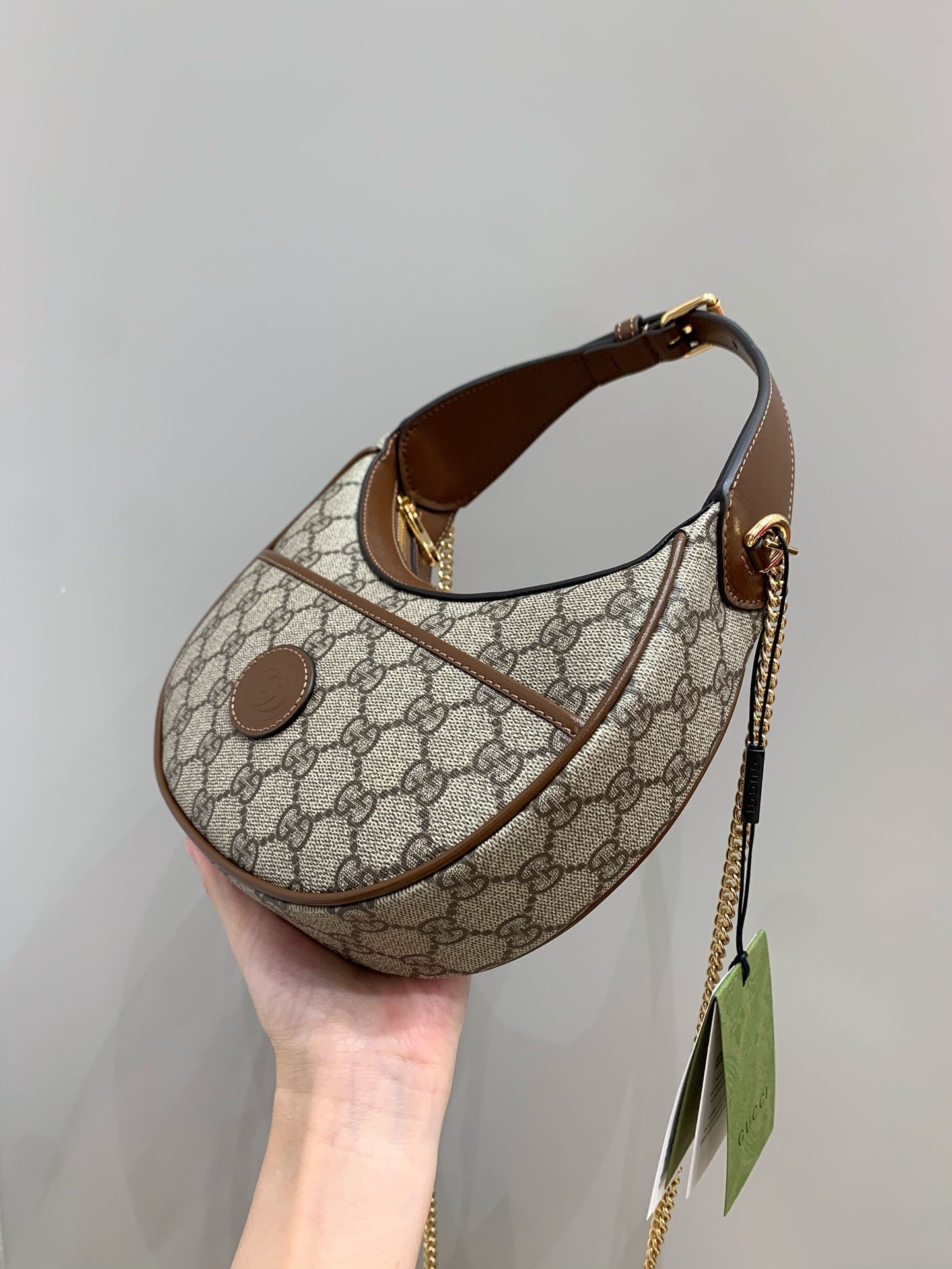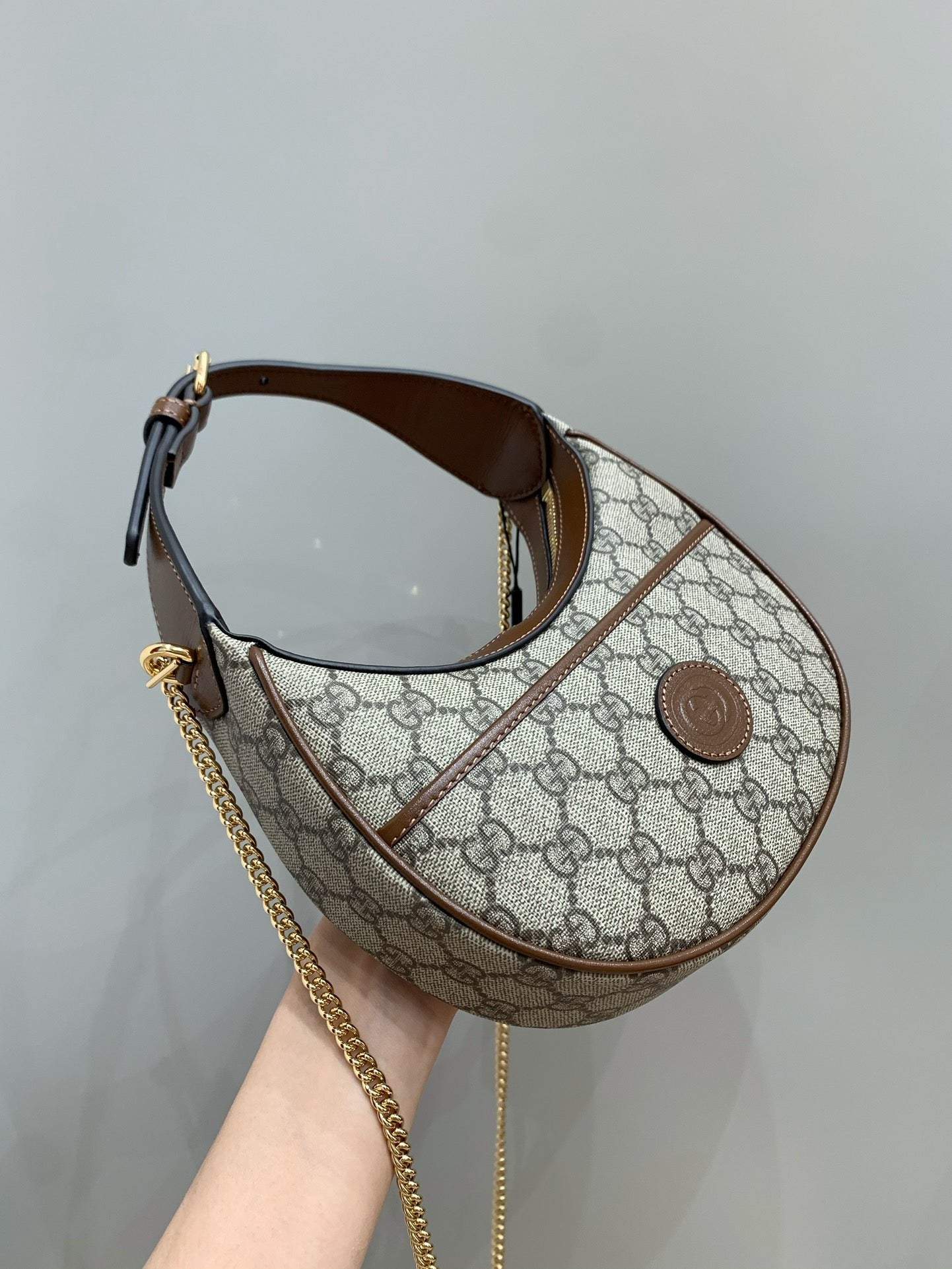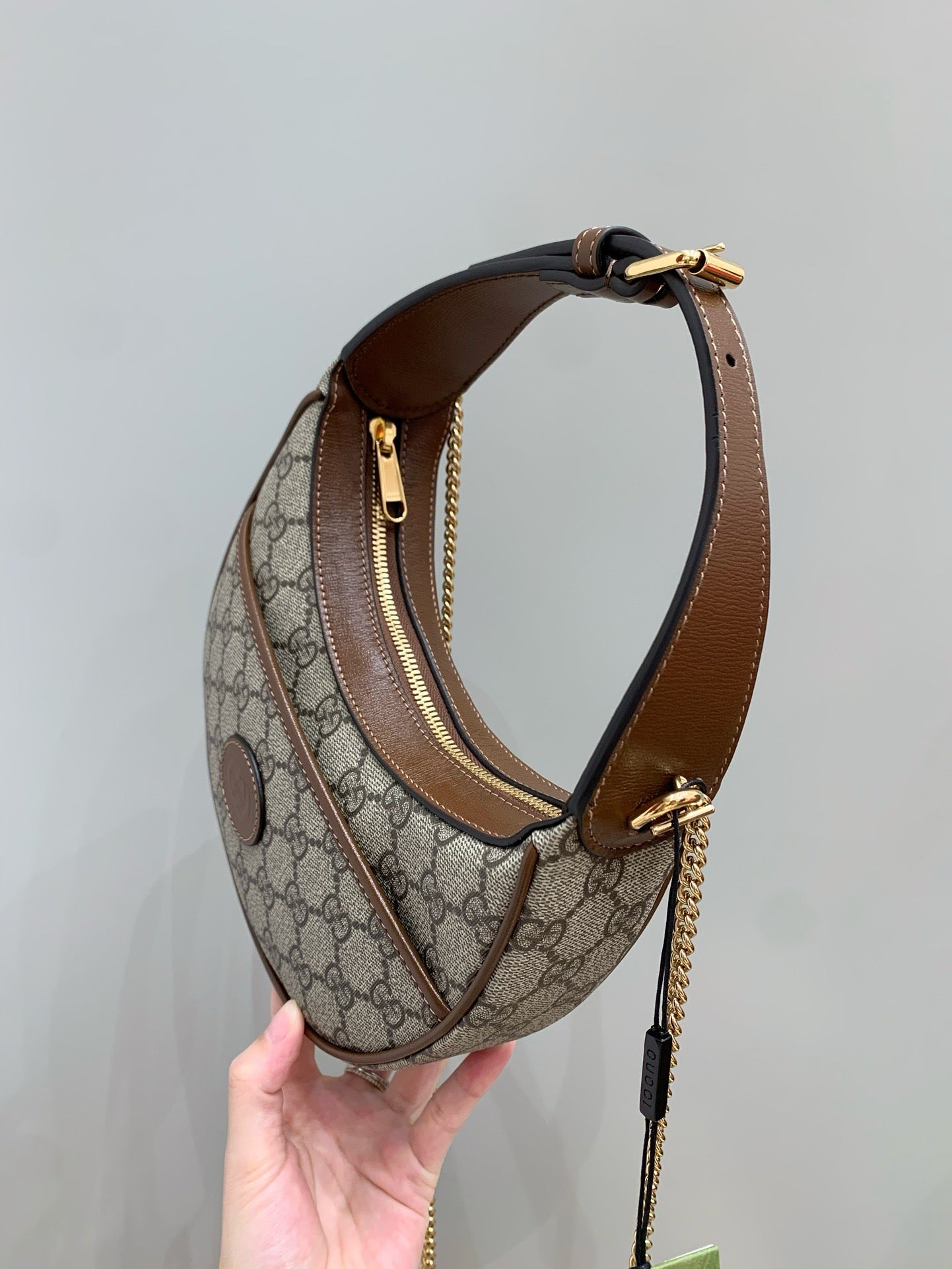 하프문 형태의 유선형 실루엣이 특징이며, GG 베이지/에보니 슈프림 캔버스와 브라운 레더 트리밍이 조화를 이룹니다. 전면 GG 오벌 로고와 중앙의 웹 스트라이프 디테일이 구찌만의 클래식한 감성을 담아냅니다.