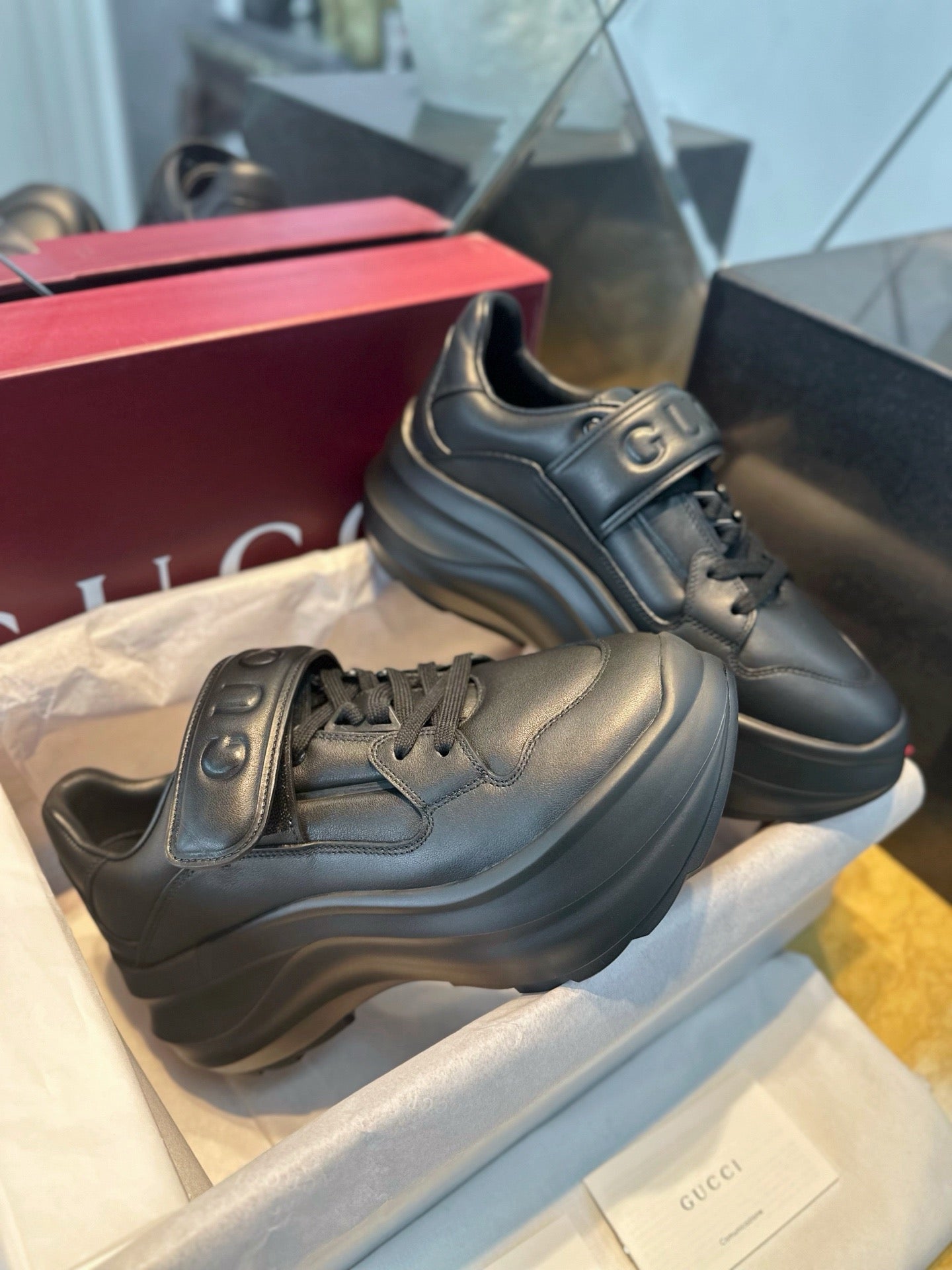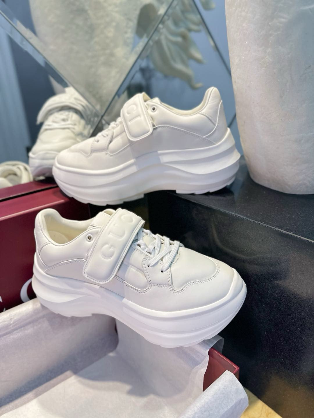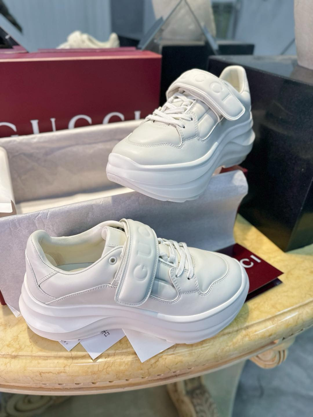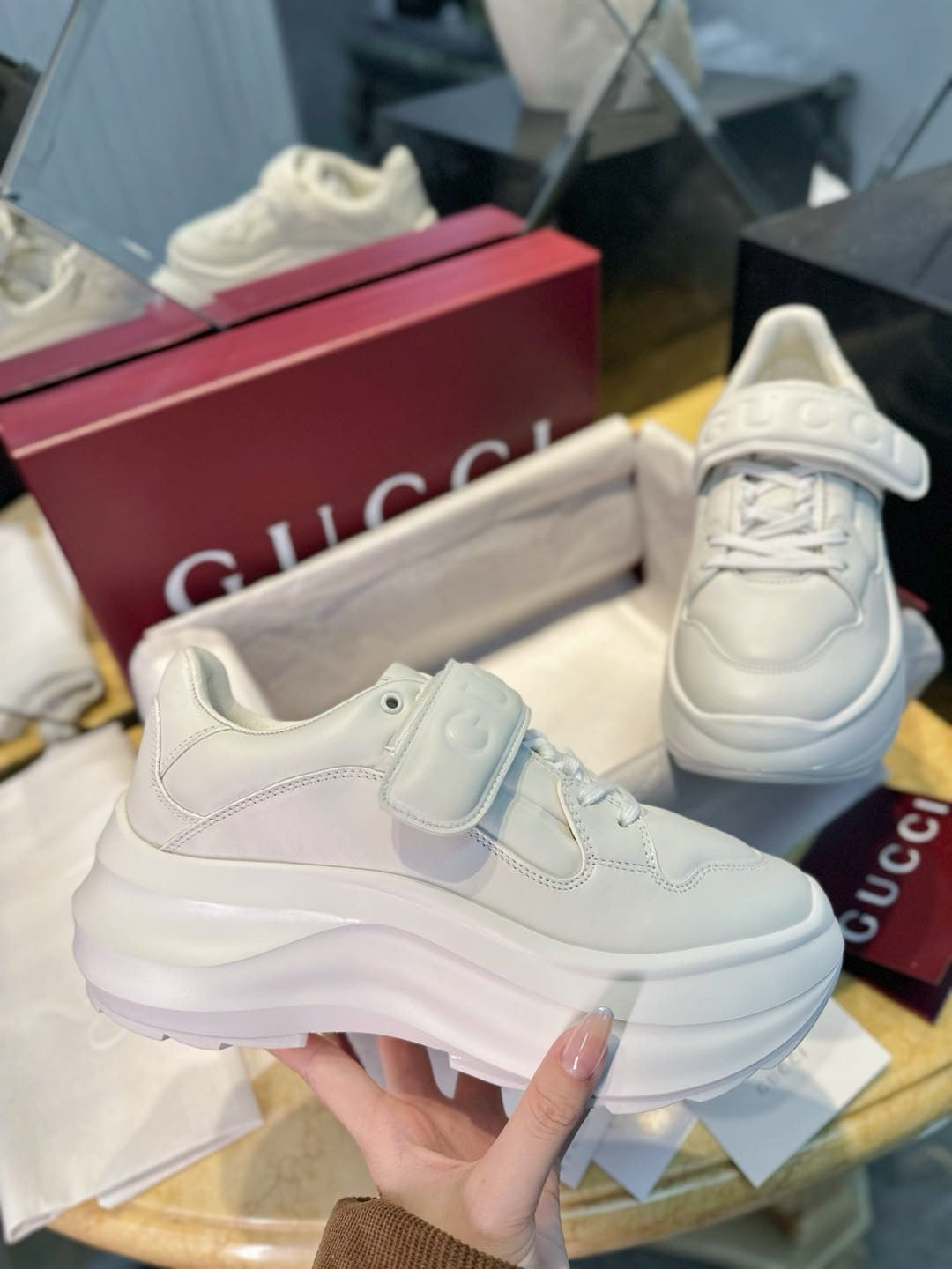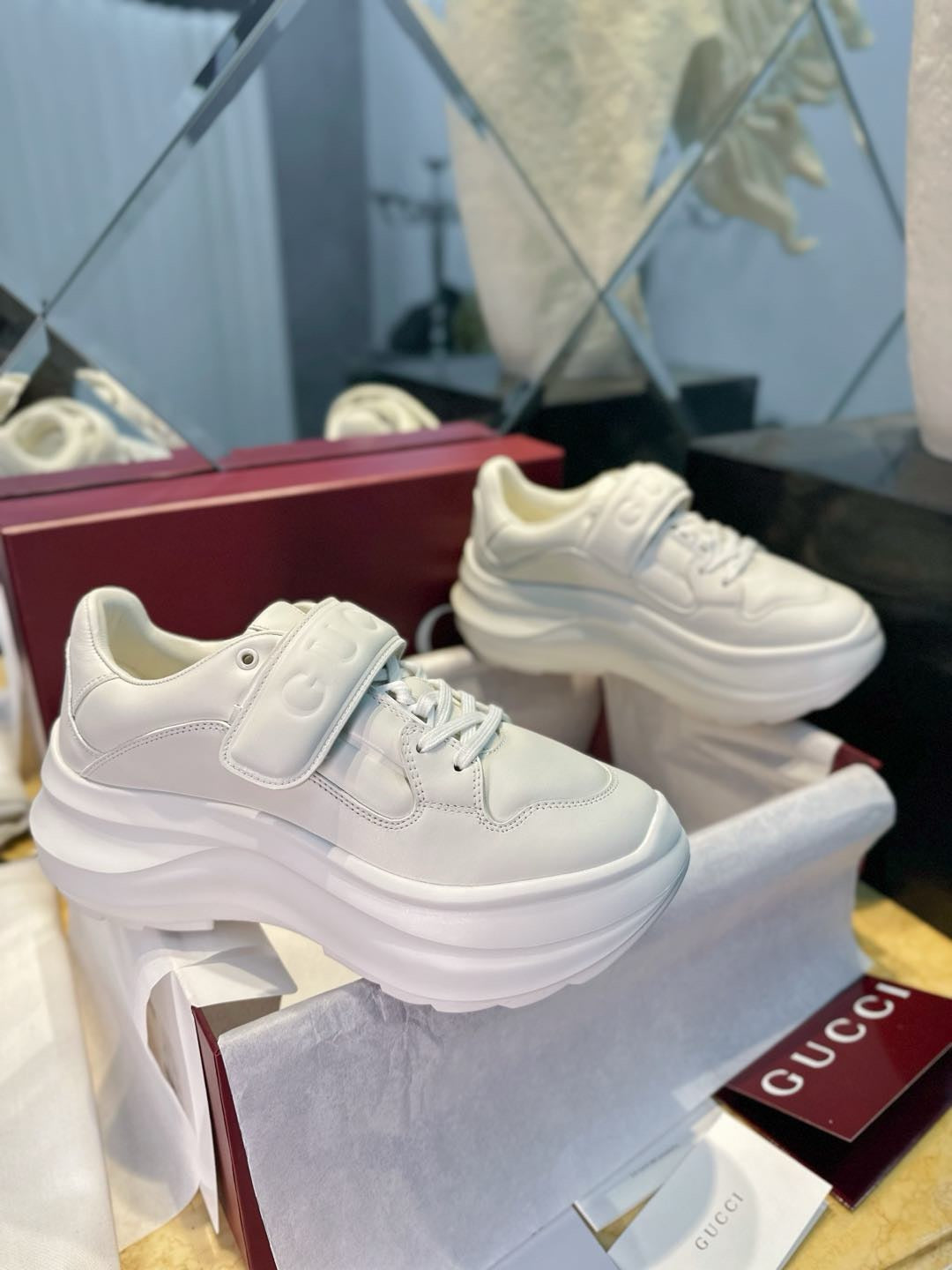 이 스니커즈는 숨겨진 웨지힐이 내장되어 있어 자연스럽게 키 높이 효과를 주며, 전체적인 실루엣에 우아한 곡선을 더합니다. 어퍼는 프리미엄 가죽 또는 메시 소재로 제작되며, 브랜드의 시그니처 스트라이프 디테일이나 GG 로고 패턴이 더해져 구찌만의 감각을 보여줍니다. 청키한 아웃솔은 안정적인 착화감을 제공하며, 트렌디한 애슬레저 룩과도 잘 어울립니다.