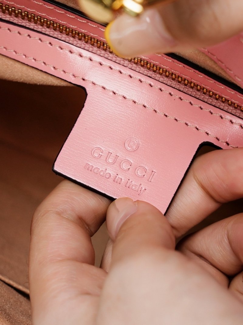 구찌의 전통적인 디자인 요소인 피스톤 클로저와 프리미엄 가죽 소재가 만나 우아하면서도 실용적인 매력을 지닌 것이 특징입니다.