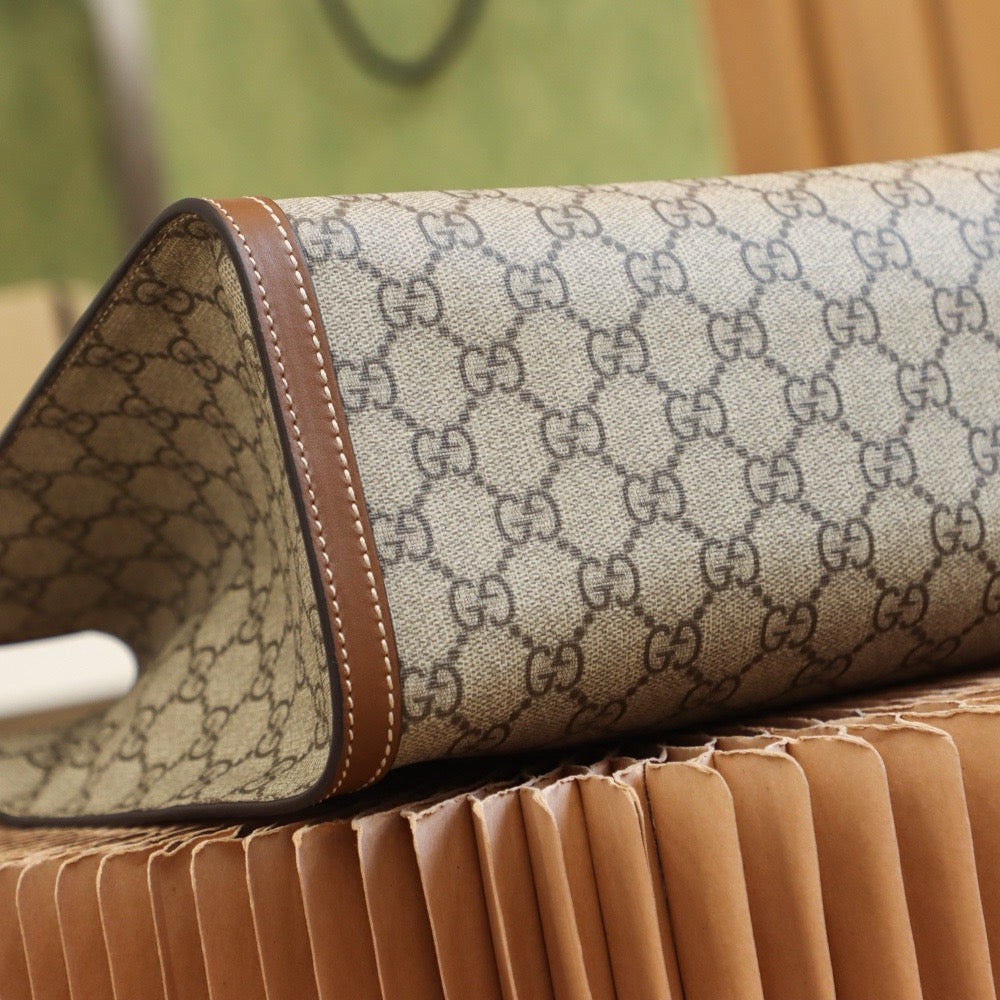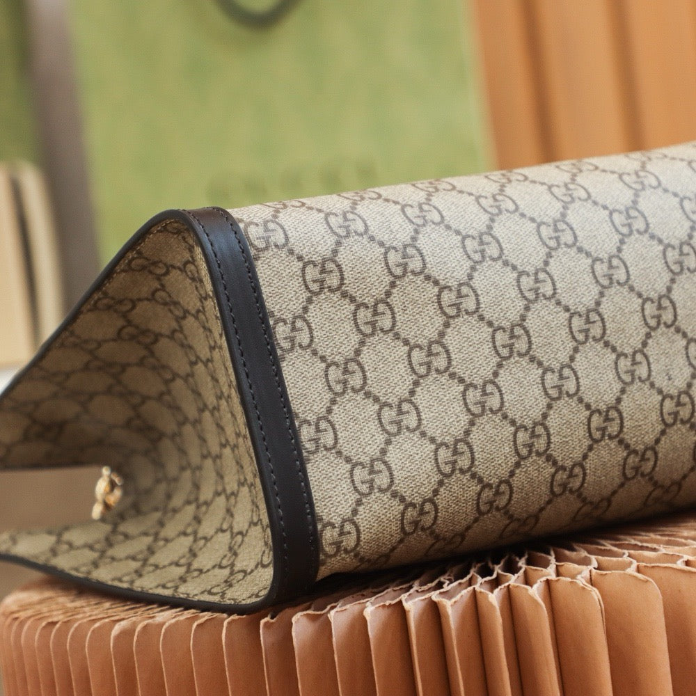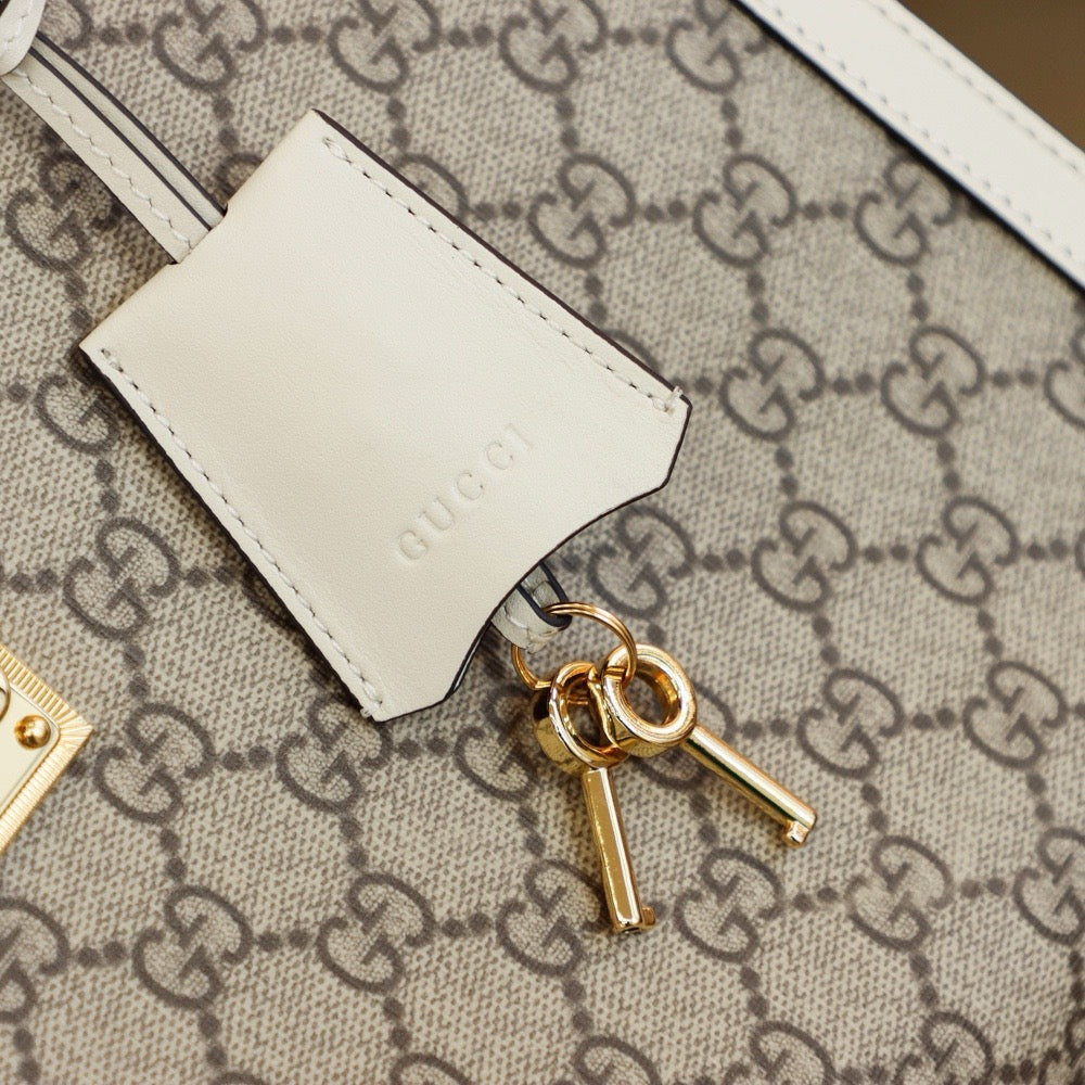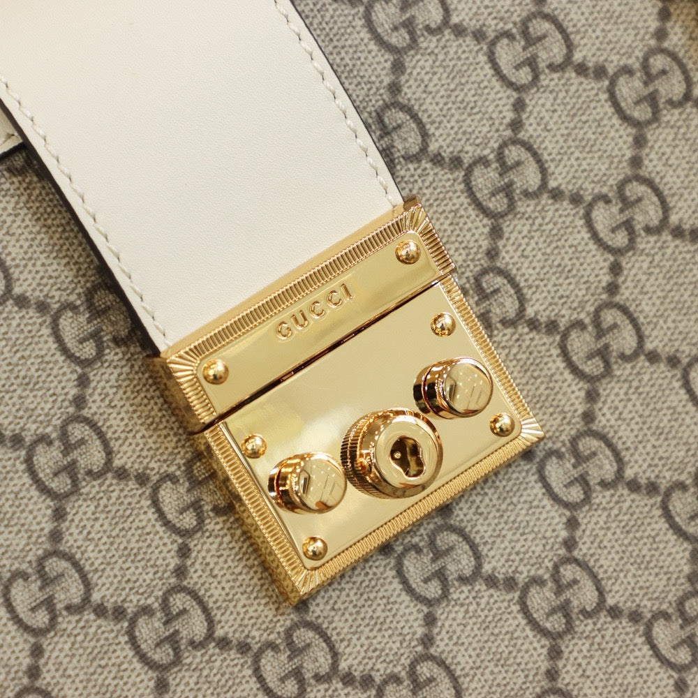 프론트에 장착된 골드 패드락 클로저가 이 가방의 가장 큰 특징으로, 보안성과 장식적 아름다움을 동시에 제공합니다. GG 슈프림 캔버스와 스무스 가죽 트리밍이 조화를 이루며, 클래식한 구찌 감성을 현대적으로 표현한 디자인입니다.