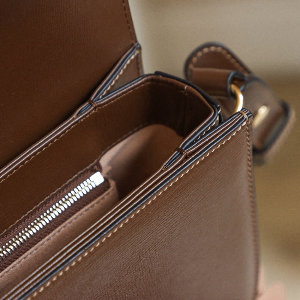 플랩 클로저는 마그네틱 또는 메탈 스냅 방식으로 여닫기 간편하며, 내부는 지퍼 포켓과 슬립 포켓으로 구성되어 실용성을 더했습니다. 스트랩은 탈부착 및 길이 조절이 가능해 숄더백, 크로스백, 핸드캐리 등 다양한 연출이 가능합니다.