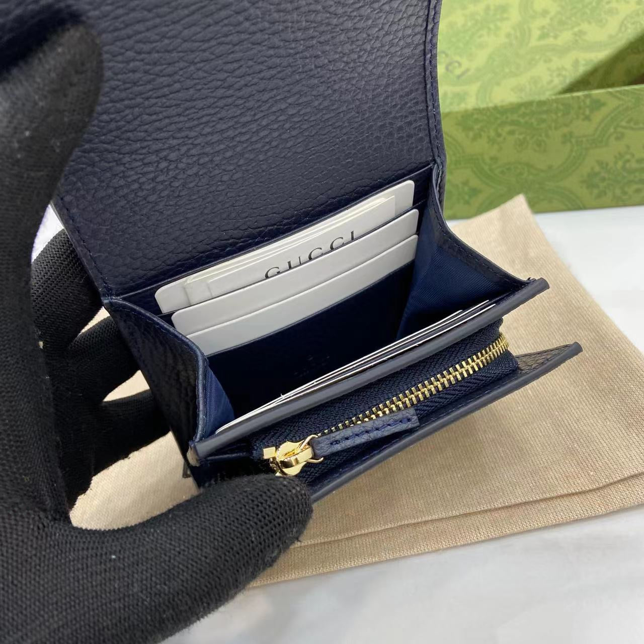슬림하면서도 정제된 실루엣을 자랑하는 이 지갑은 전면에 GG 마몽트 라인의 상징인 골드 GG 로고가 돋보이며, 마틀라세 가죽이 시각적 깊이를 더해줍니다. 카드, 지폐, 동전 등 일상 소지품을 효율적으로 정리할 수 있는 내부 구성으로 데일리 사용에 적합합니다.