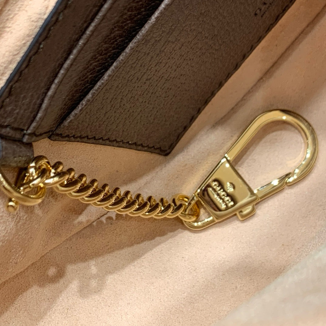 오벌 GG 로고 메탈 디테일과 부드러운 브라운 레더 트리밍, 지퍼 클로저가 어우러진 디자인으로 고급스러움을 극대화합니다. 내부는 소프트 패브릭 안감으로 처리되어 있으며, 작지만 정돈된 수납이 가능하도록 설계되어 있습니다.