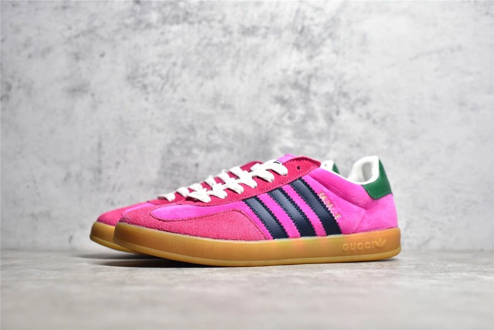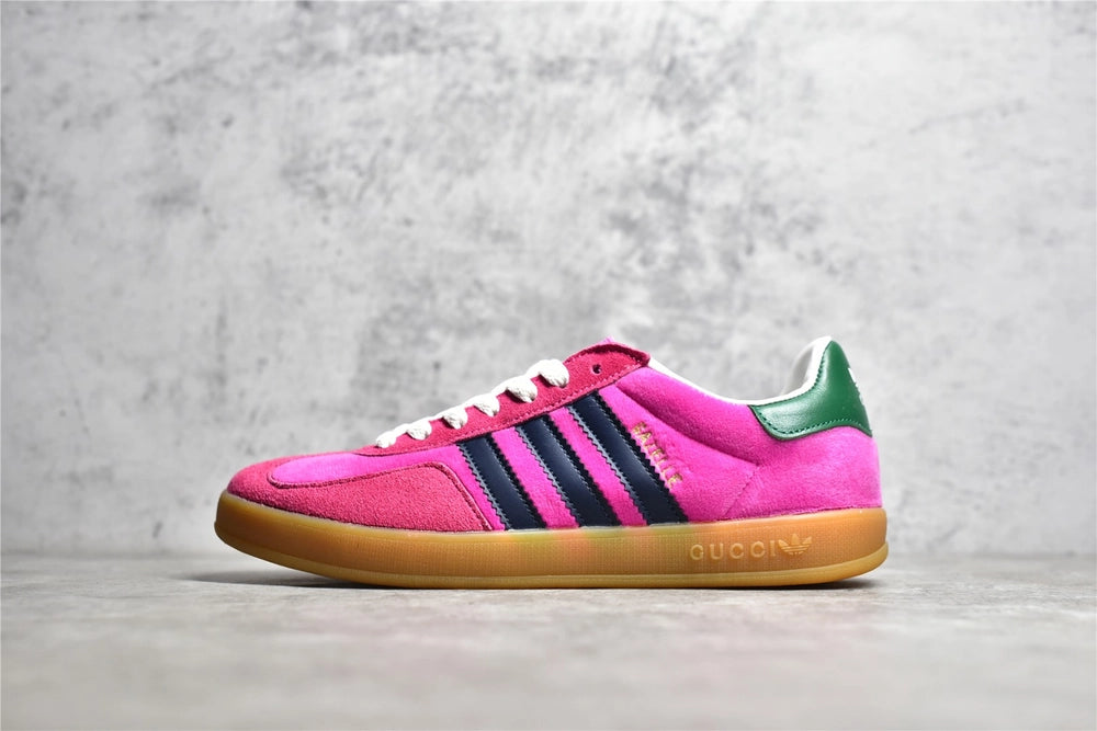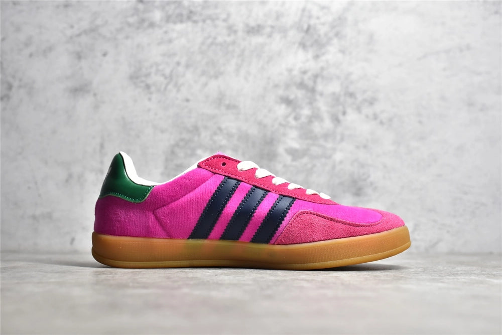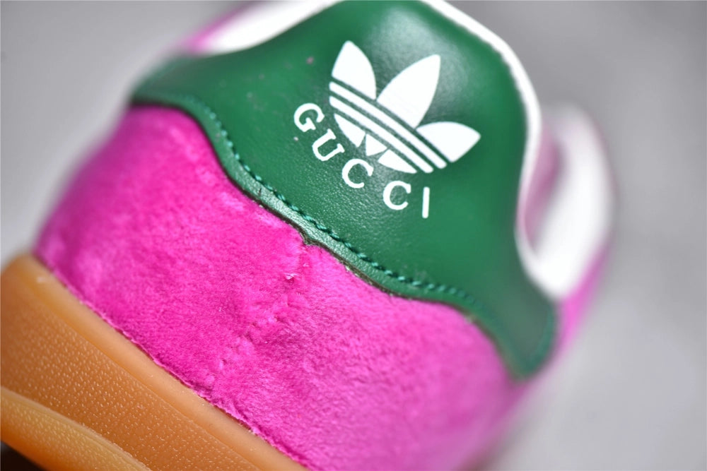 구찌 x 아디다스 가젤 스니커즈 핑크 벨벳(Adidas x Gucci Gazelle Pink Velvet)은 아디다스의 클래식 모델인 가젤을 기반으로 구찌의 화려하면서도 고급스러운 감각이 더해진 프리미엄 협업 스니커즈입니다. 벨벳 소재의 독특한 질감과 핑크 컬러의 감각적인 조합이 돋보이는 아이템입니다.
