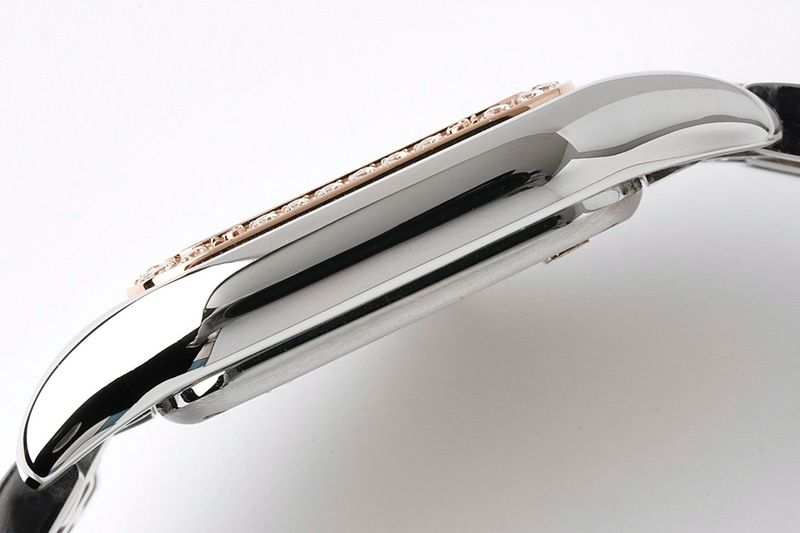 팬더 워치 특유의 정사각형 케이스와 부드러운 모서리 라인은 손목 위에서 우아한 존재감을 발산합니다. 스테인리스 스틸과 18K 로즈골드가 번갈아 구성된 투톤 브레이슬릿은 따뜻한 컬러감으로 피부 톤을 밝혀주며, 베젤에 촘촘히 세팅된 다이아몬드는 우아함을 극대화합니다.
