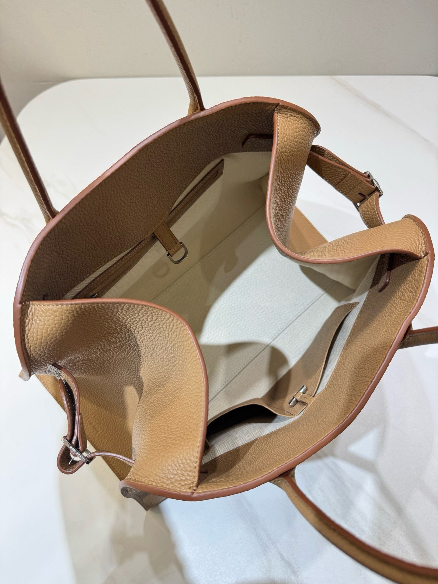 내구성 높은 텍스처드 가죽과 구조적인 디자인이 어우러져 고급스럽고 실용적인 토트백으로 활용도 높은 아이템입니다.