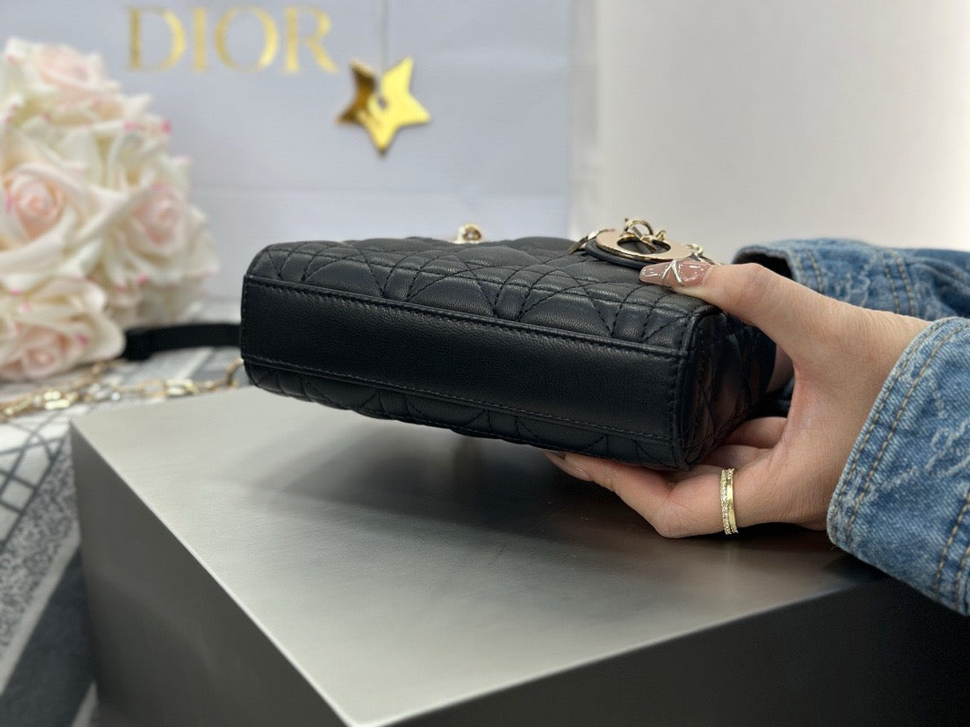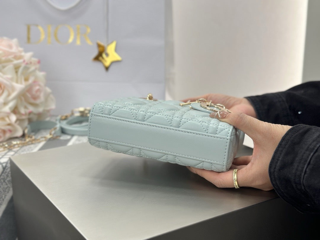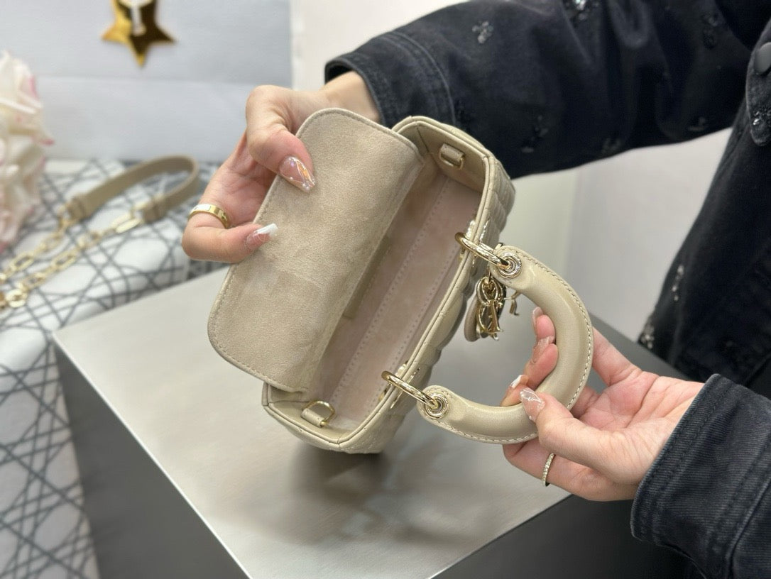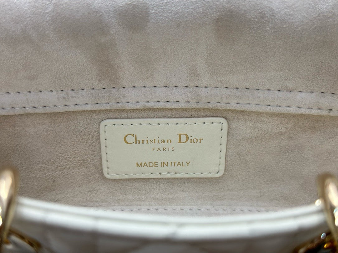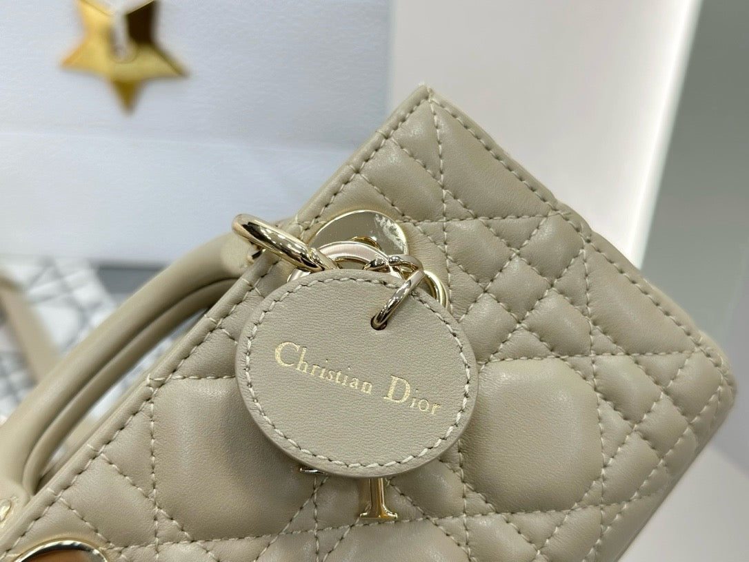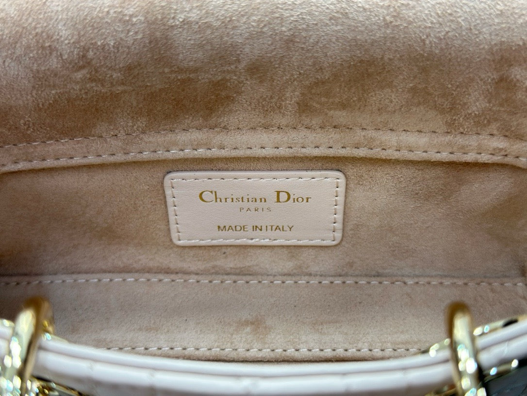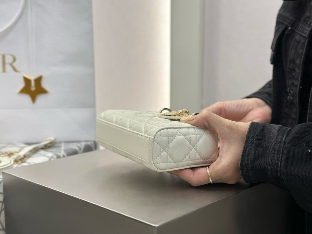 디 조이백은 디올의 대표 퀼팅 패턴인 카나주(Cannage)를 그대로 유지하면서, 가로로 길게 늘어난 직사각형 형태로 디자인되었습니다. 미니 사이즈는 클래식한 우아함에 발랄함을 더해주며, 앤틱 골드 피니시의 'D.I.O.R.' 참 장식이 디올의 정체성을 상징적으로 드러냅니다.