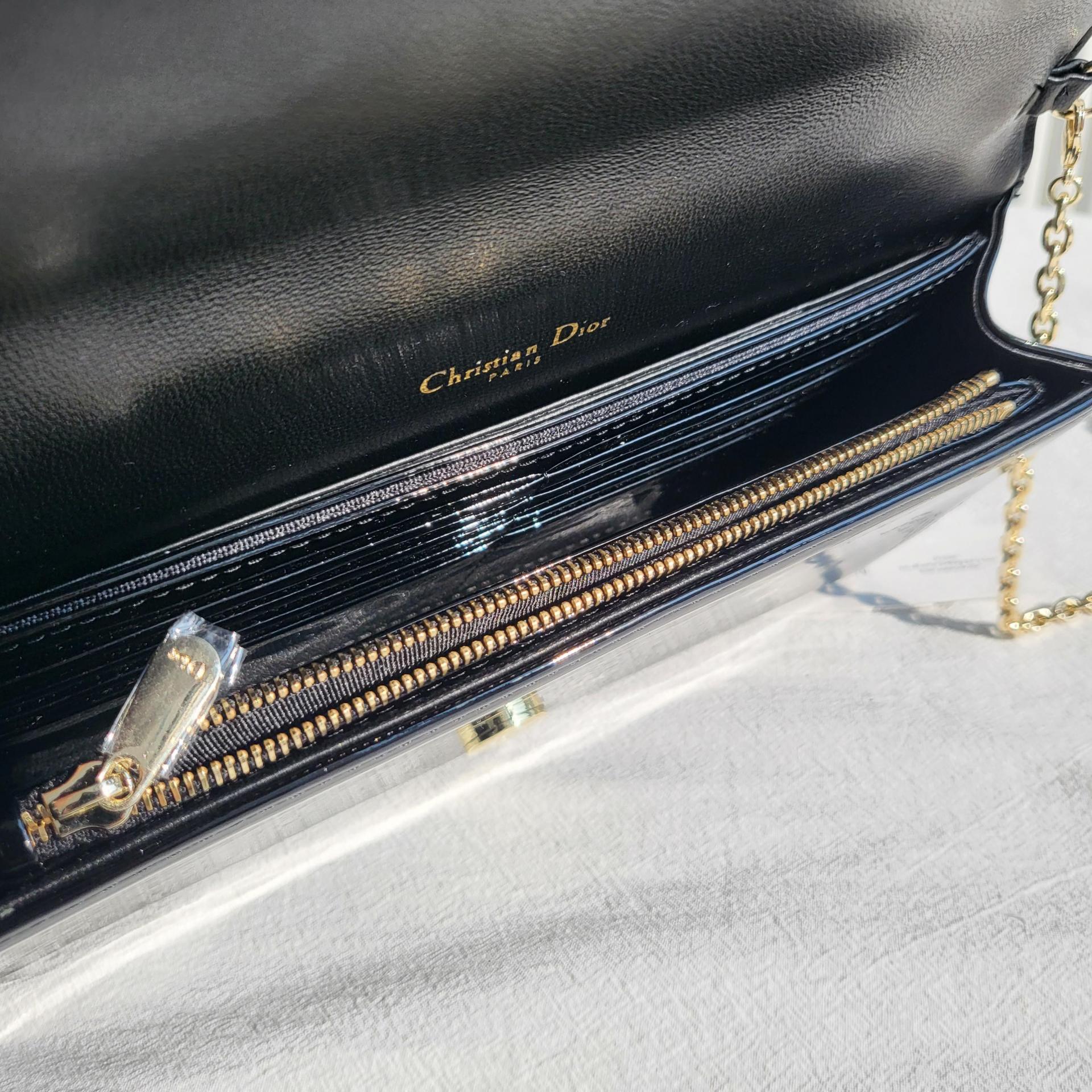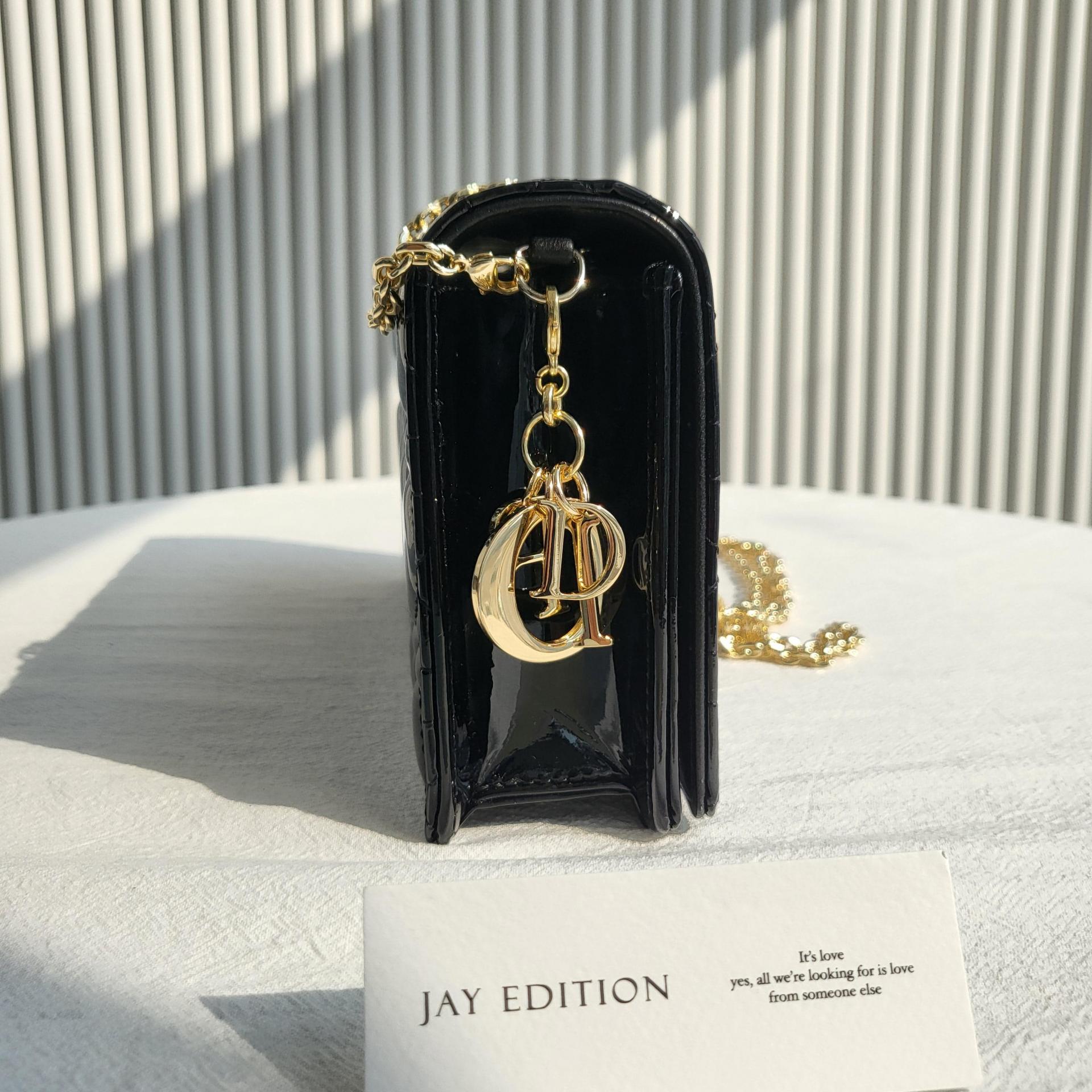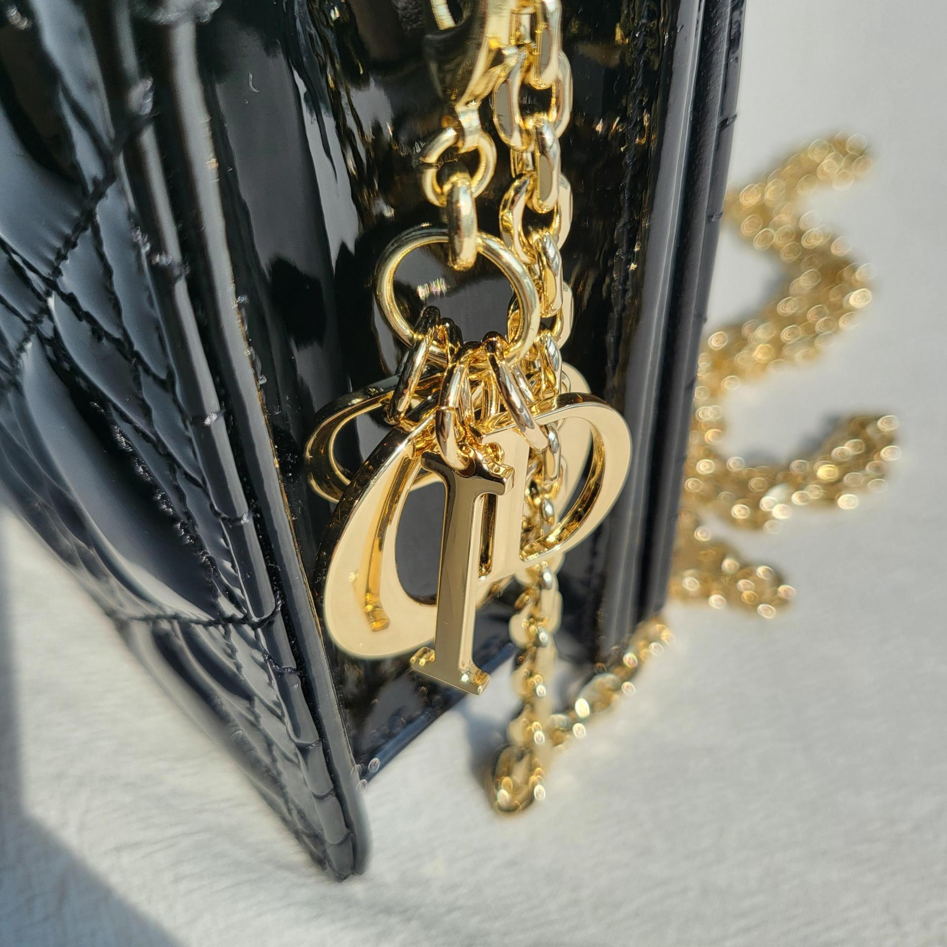 디테일: D.I.O.R. 메탈 참, 내부 Dior 로고 각인, 유광 마감 하드웨어
