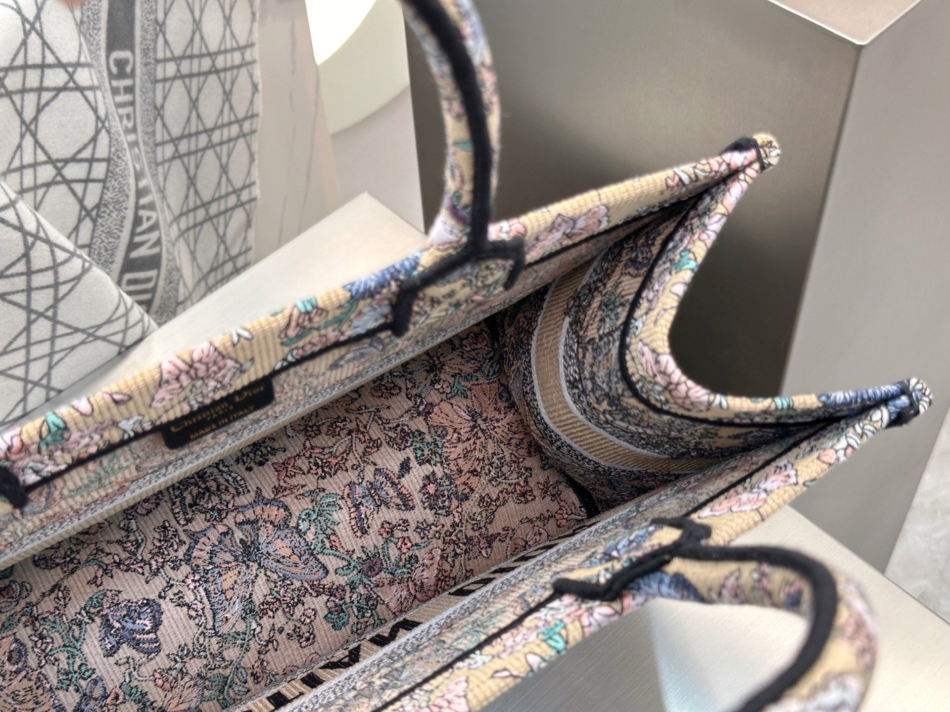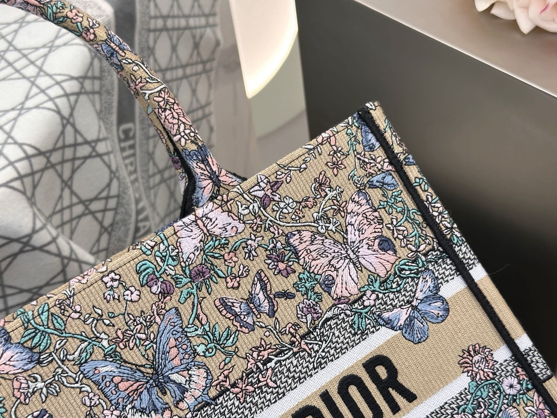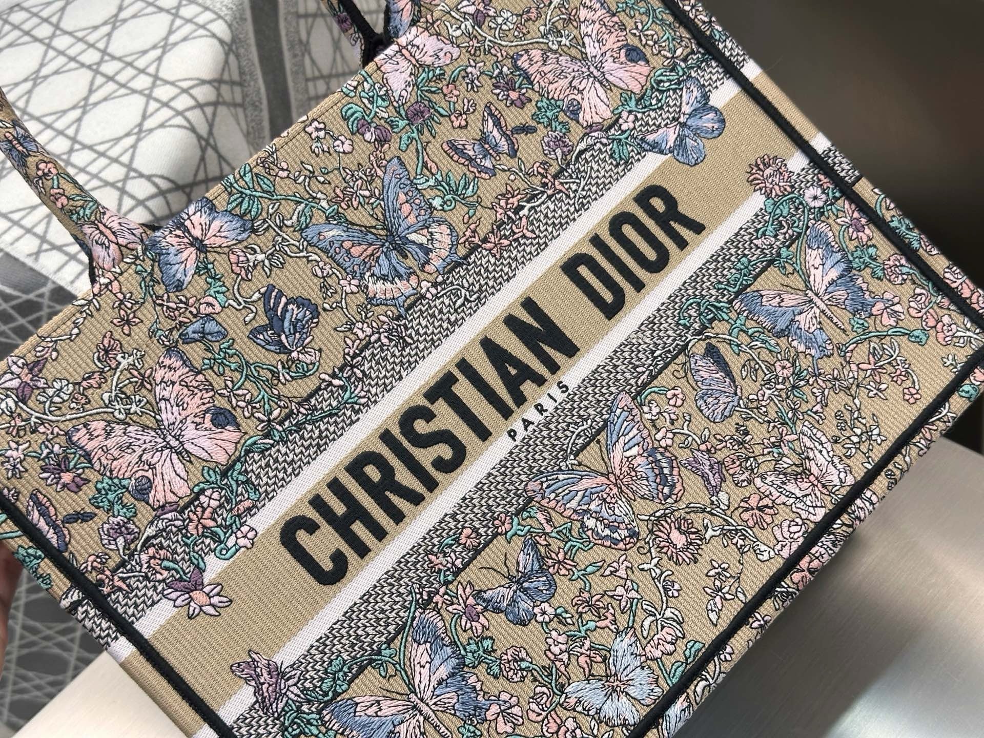 디올 트왈 드 주이 빠비용 북 토트백 미디움(Dior Toile de Jouy Papillon Book Tote Bag Medium)은 디올 하우스의 상징적인 북 토트 디자인에 우아한 나비와 식물 모티프가 조화를 이루는 리미티드 에디션 백입니다. 프랑스 전통 직물 패턴인 트왈 드 주이를 현대적으로 재해석해, 아티스틱한 감성과 고급스러운 분위기를 동시에 선사합니다.