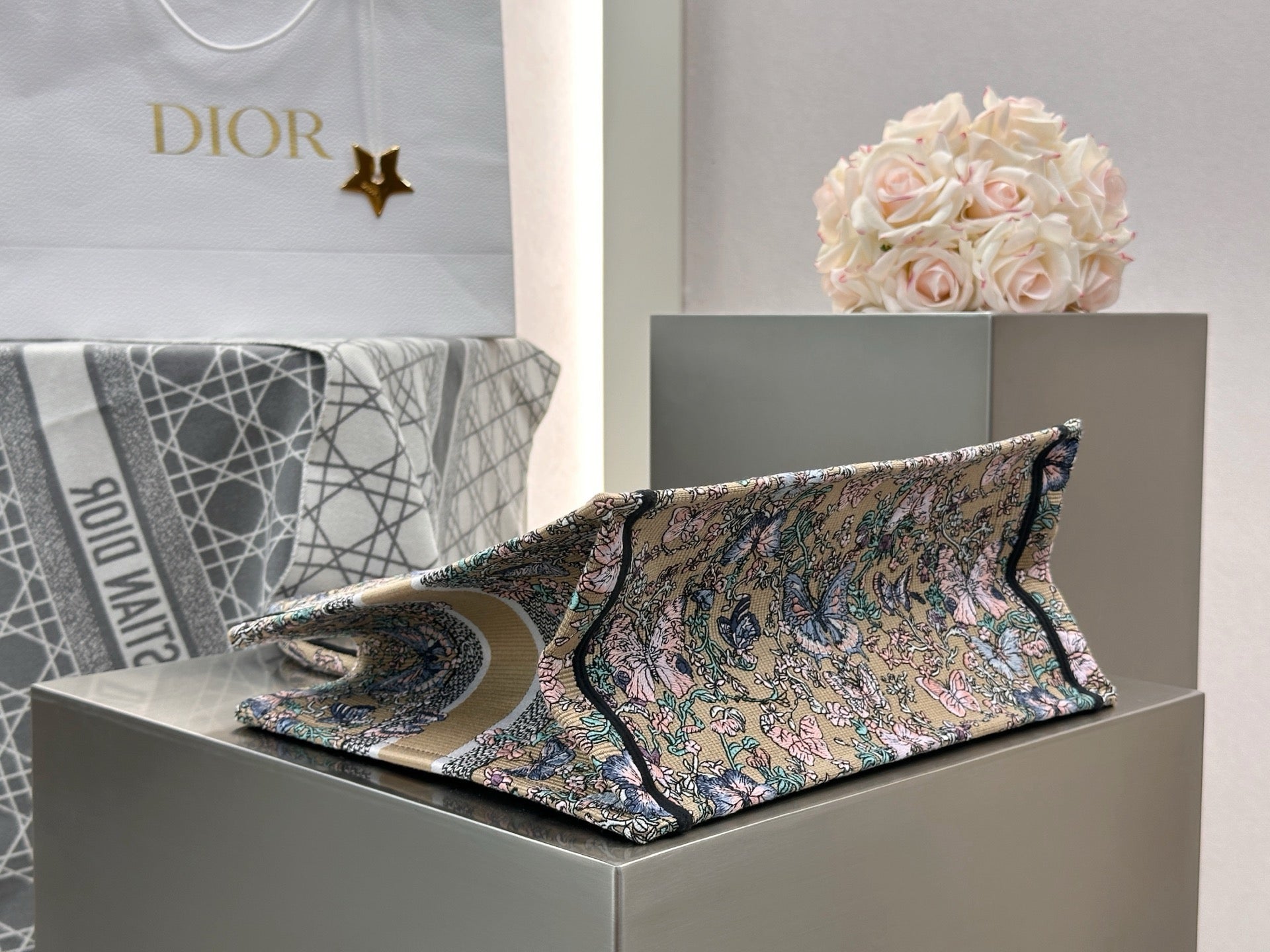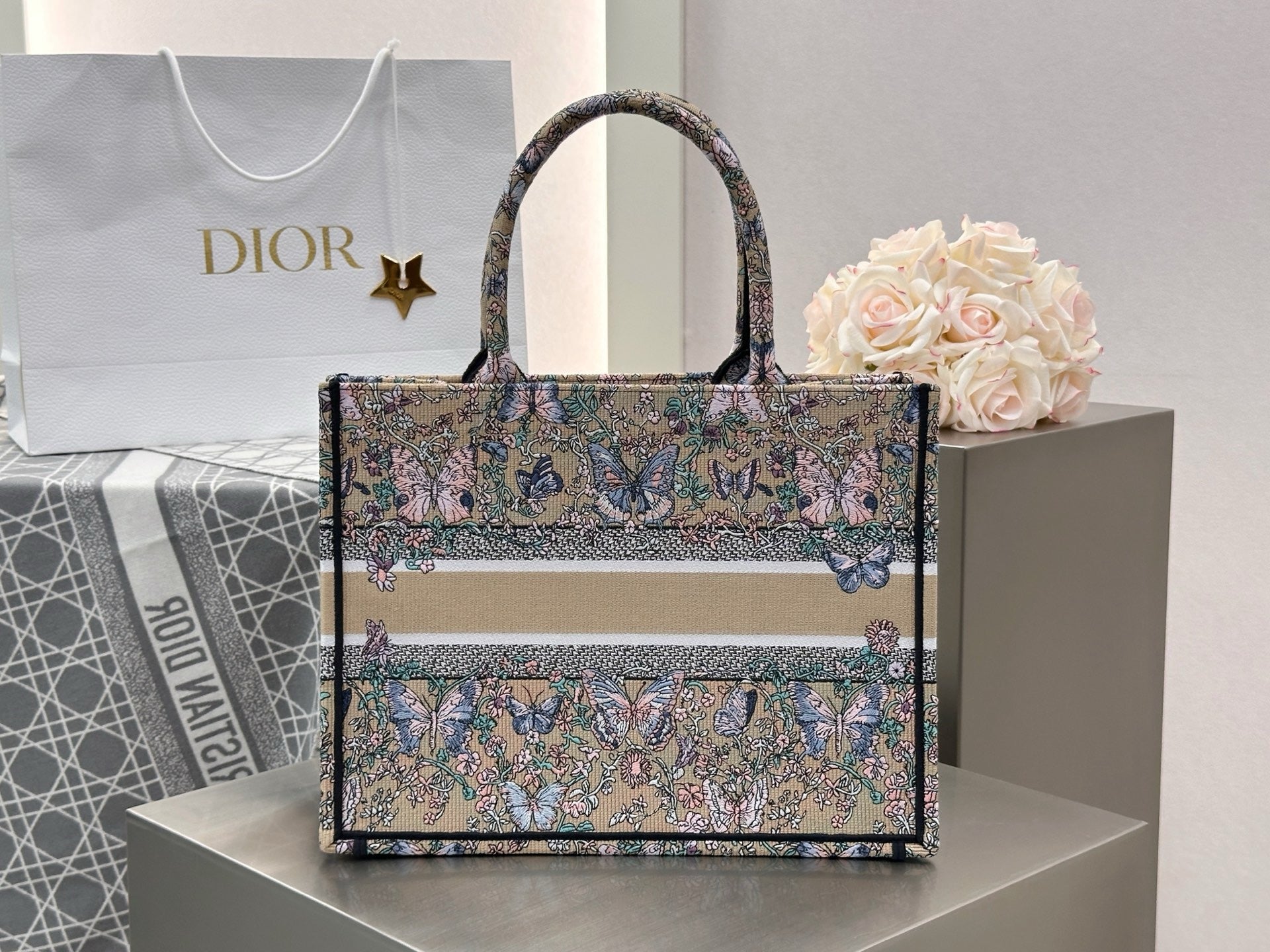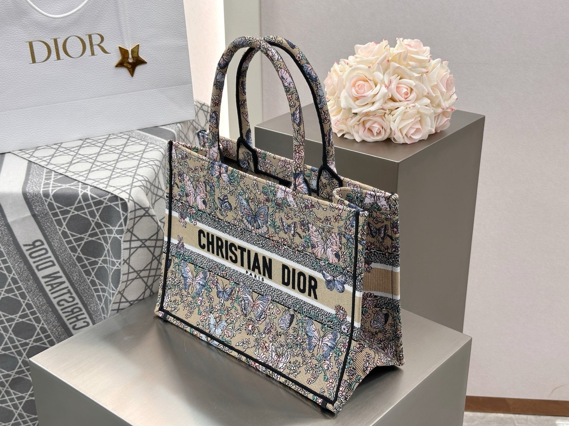 디올 트왈 드 주이 빠비용 북 토트백 미디움(Dior Toile de Jouy Papillon Book Tote Bag Medium)은 디올 하우스의 상징적인 북 토트 디자인에 우아한 나비와 식물 모티프가 조화를 이루는 리미티드 에디션 백입니다. 프랑스 전통 직물 패턴인 트왈 드 주이를 현대적으로 재해석해, 아티스틱한 감성과 고급스러운 분위기를 동시에 선사합니다.