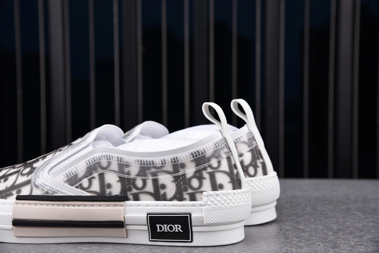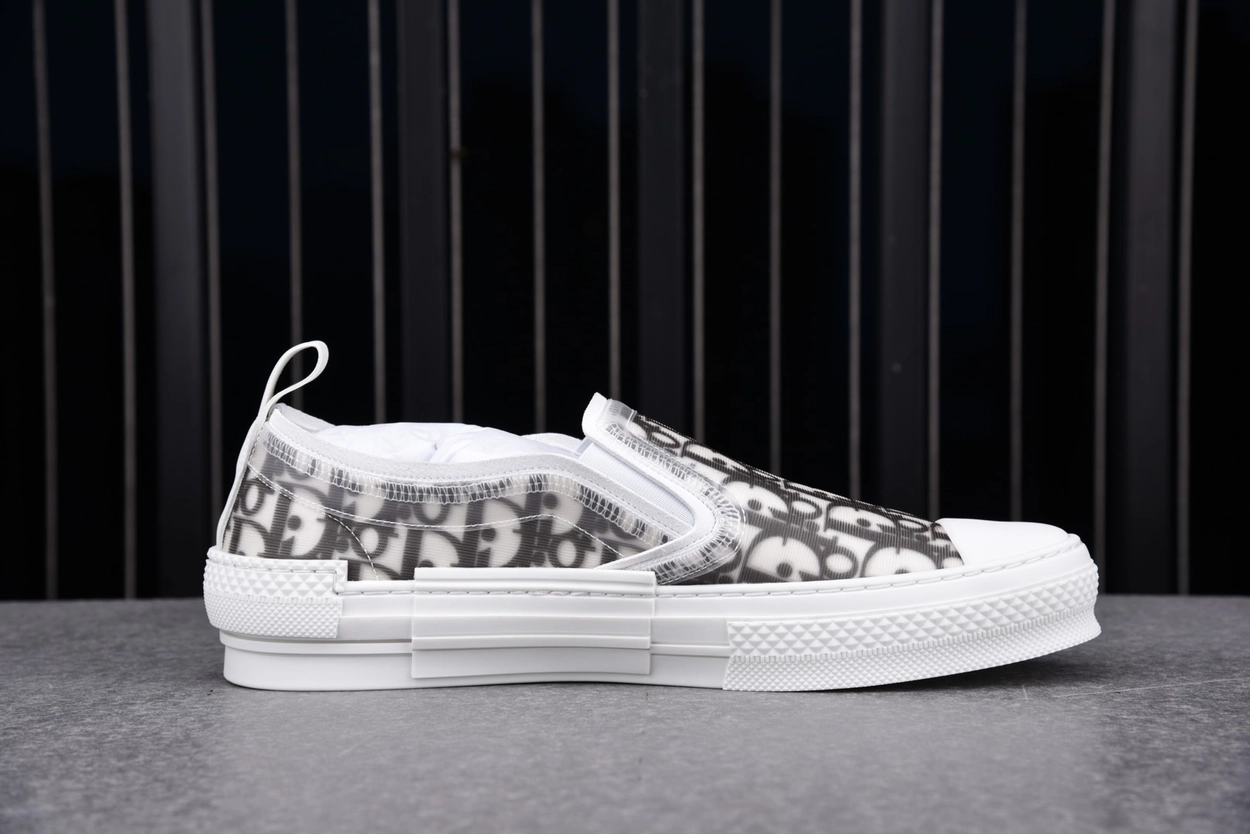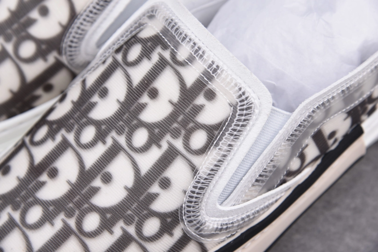 이 슬립온은 디올 오블리크 프린트가 인쇄된 반투명 TPU 소재로 구성되어 입체적이고 미래적인 인상을 주며, 옆면의 고무 패널과 백 루프 디테일은 실용성을 더합니다. 군더더기 없는 실루엣은 도회적이고 정제된 분위기를 연출합니다.