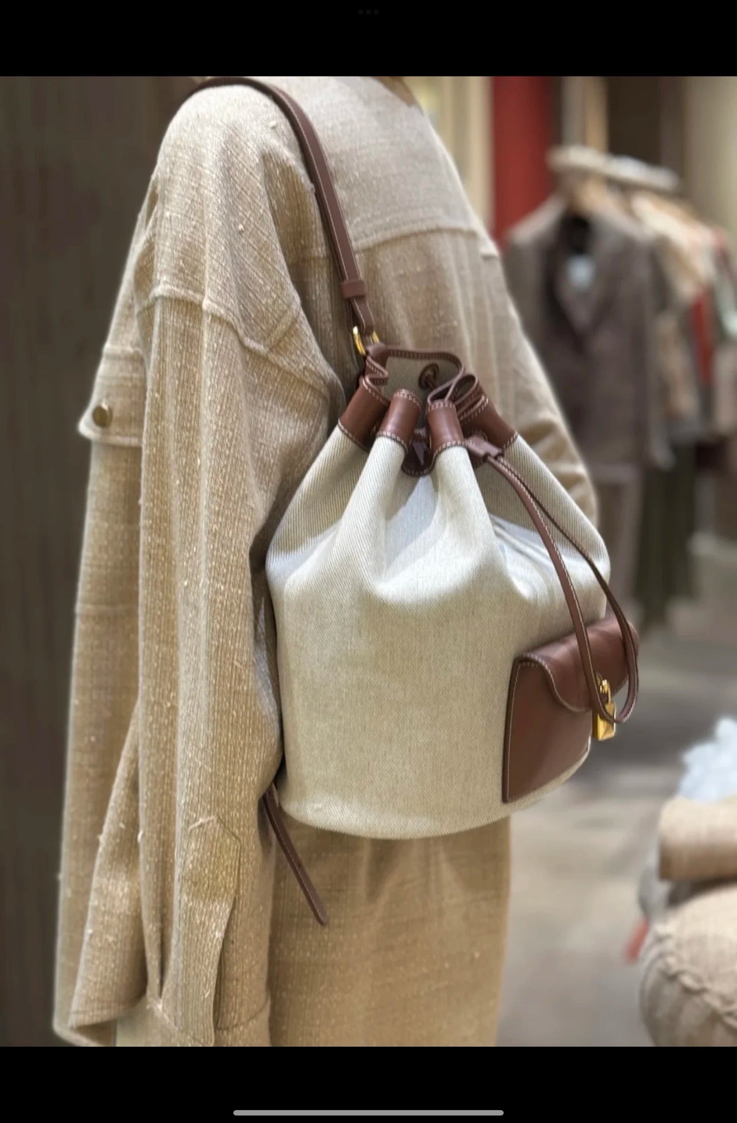 천연 코튼 소재에 송아지가죽 디테일이 더해져 가볍고 견고하며, 드로스트링 디자인으로 실용성과 스타일을 모두 만족시킵니다.