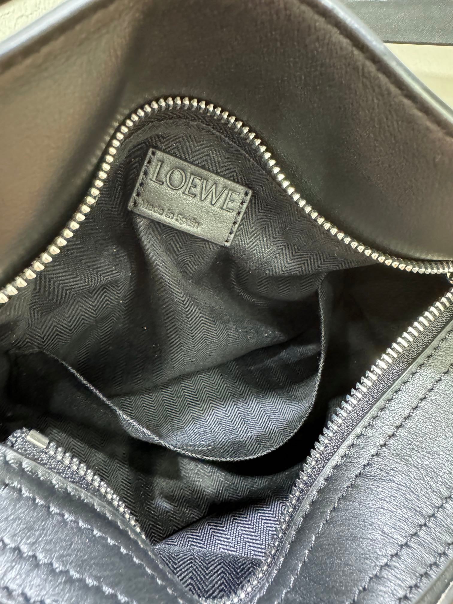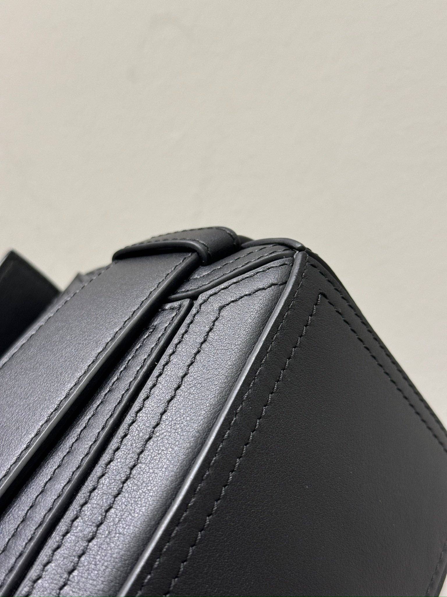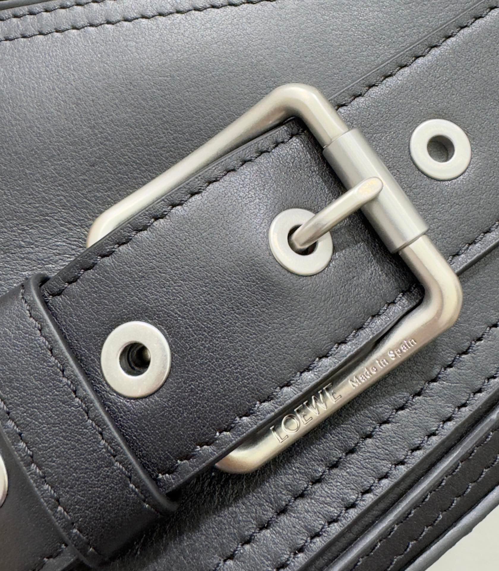 퍼즐백 특유의 분할된 기하학적 디자인은 로에베의 정체성을 잘 보여주는 요소입니다. 여기에 바이커 재킷에서 영감을 받은 지퍼, 버클, 금속 장식들이 더해져 역동적이고 대담한 분위기를 연출합니다. 블랙 컬러를 기본으로 한 유광 및 매트 텍스처 조합은 고급스러움을 강조하며, 다양한 룩에 매치하기 좋습니다.