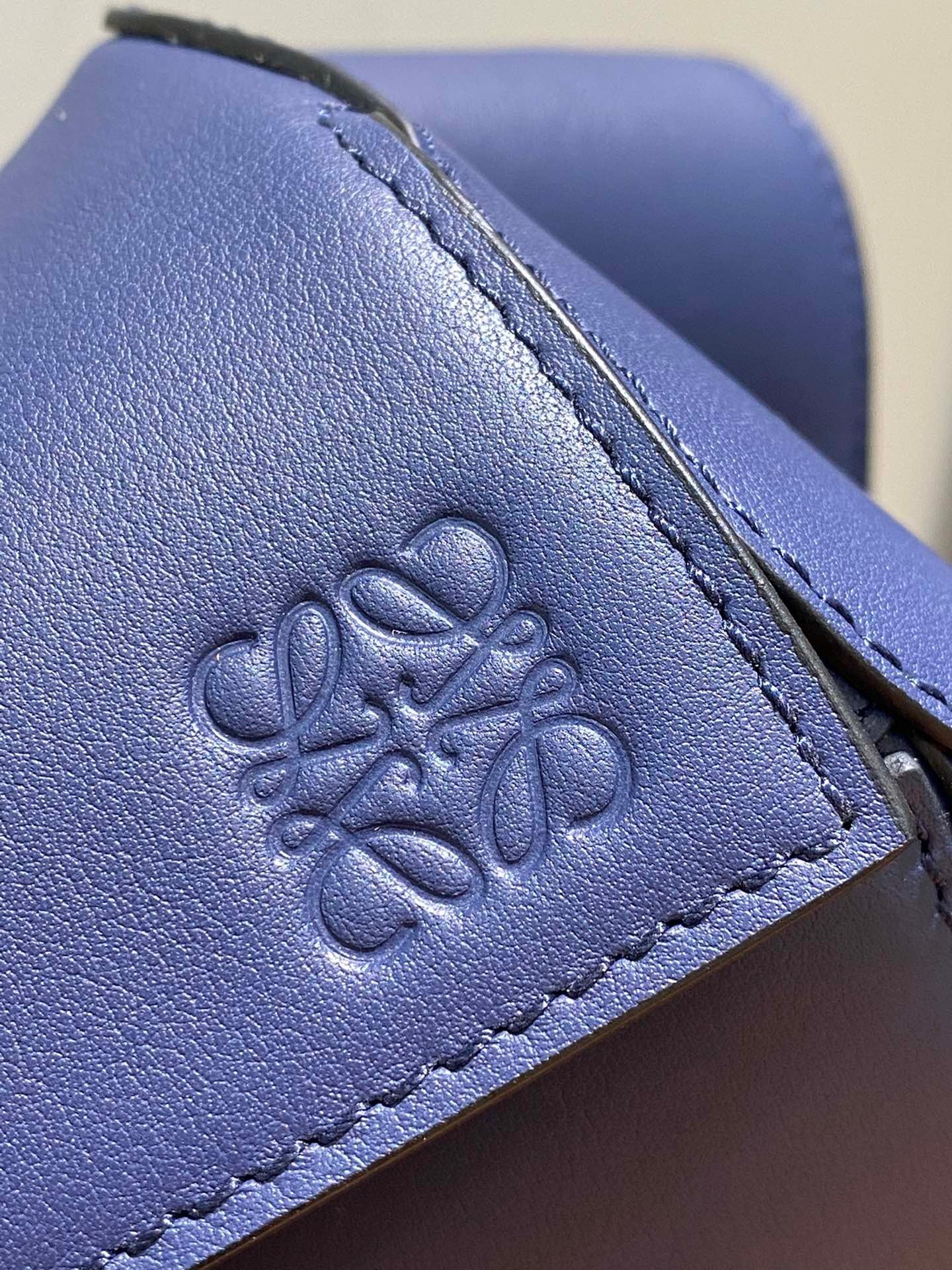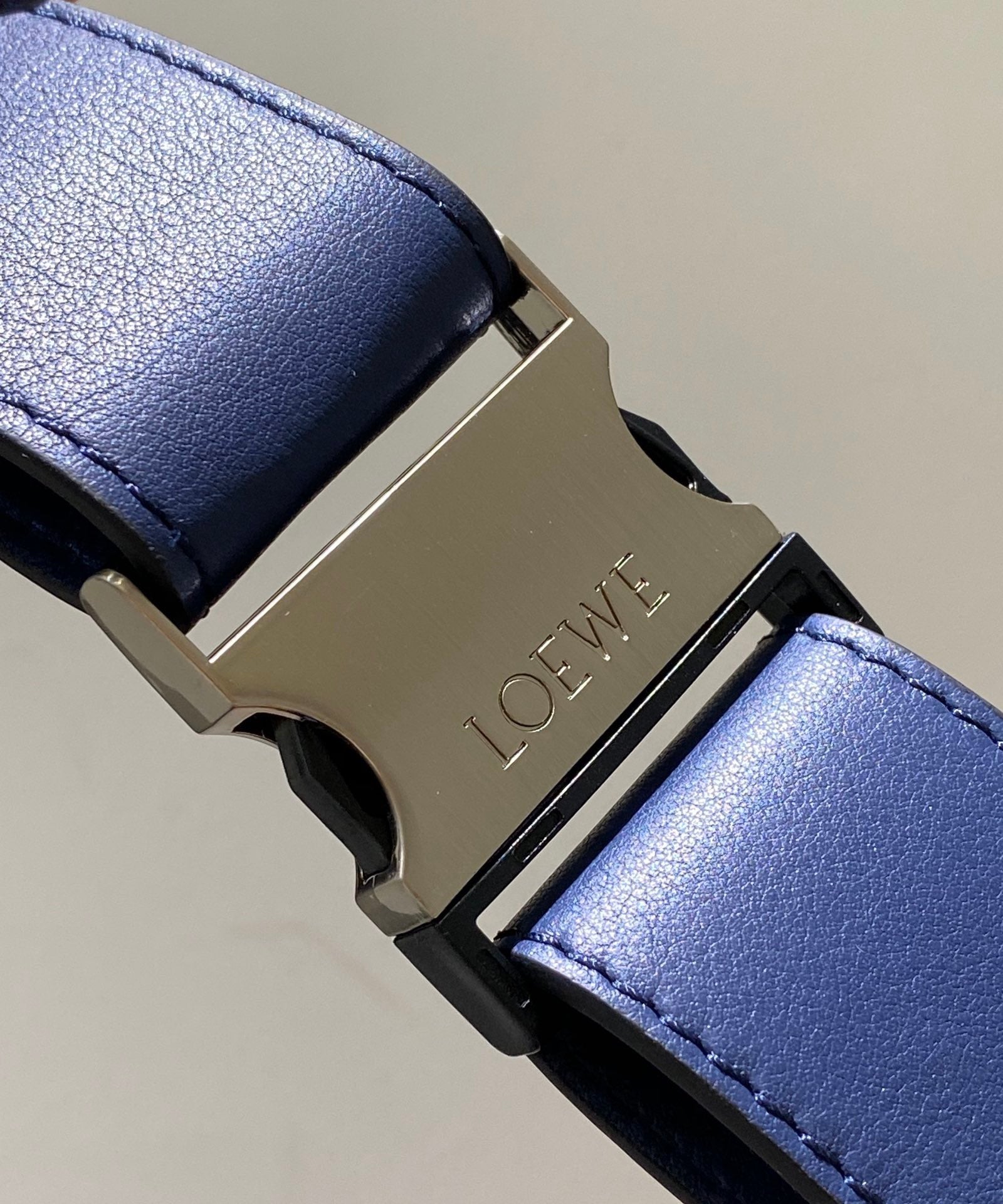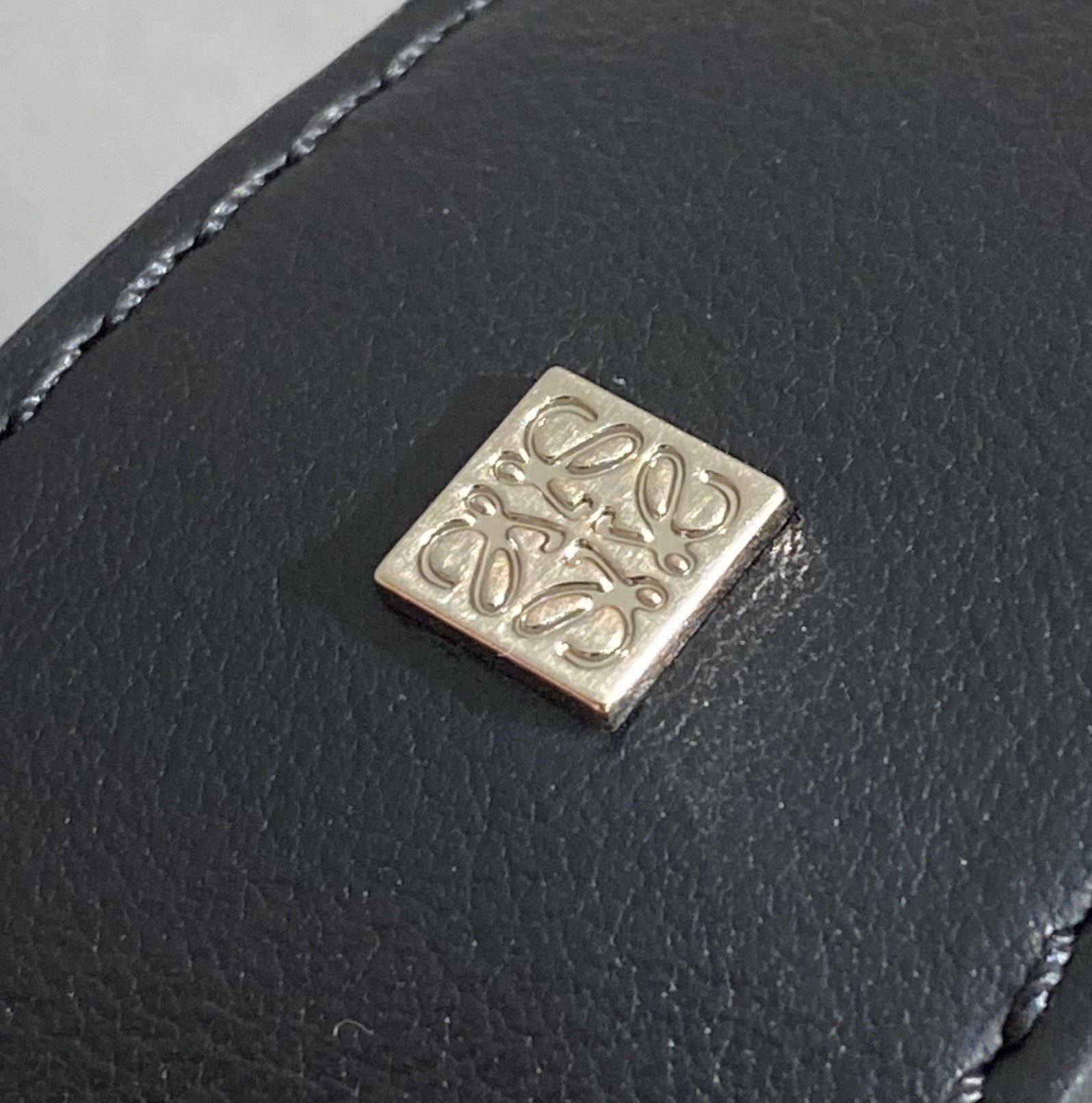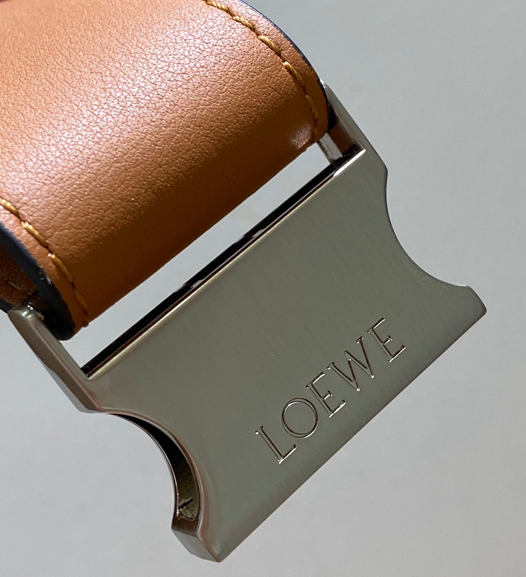 퍼즐백의 상징인 분할된 절개 라인이 유려하게 표현되어 있으며, 소형임에도 구조적인 실루엣이 돋보입니다. 송아지가죽으로 제작되어 부드럽고 고급스러운 텍스처를 제공하며, 허리 또는 어깨에 착용 가능한 스트랩으로 다양한 연출이 가능합니다. 정면에는 로에베의 아나그램 로고가 음각 또는 메탈 디테일로 디자인되어 브랜드 아이덴티티를 강조합니다.