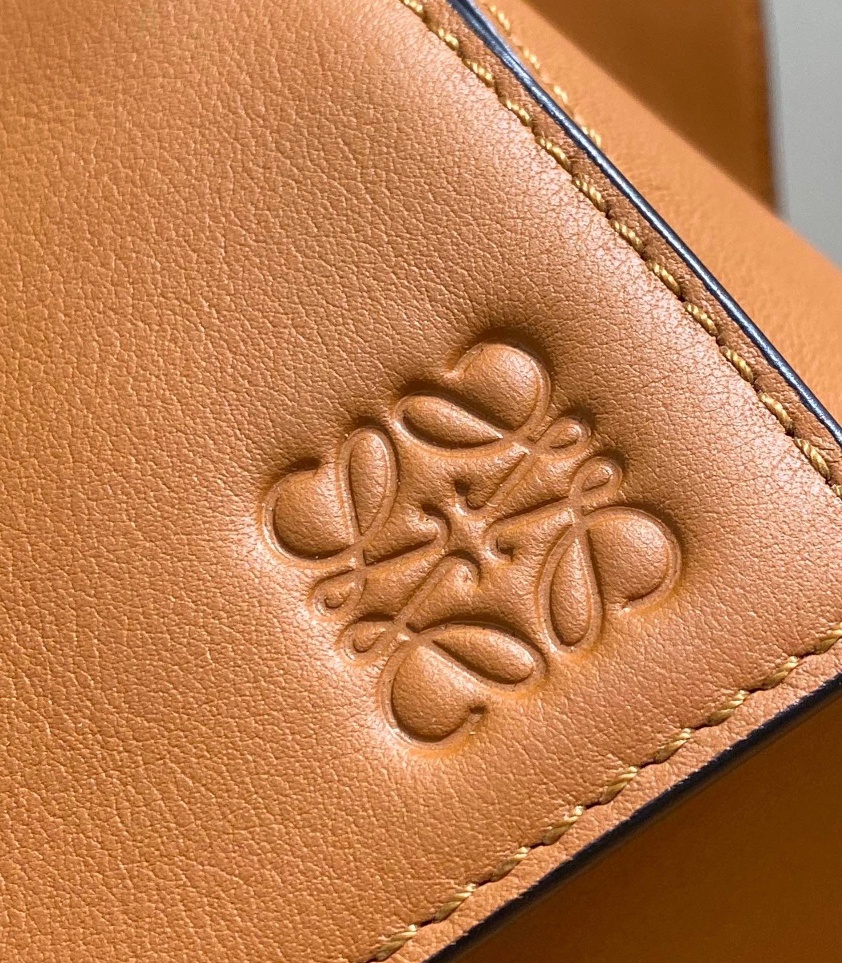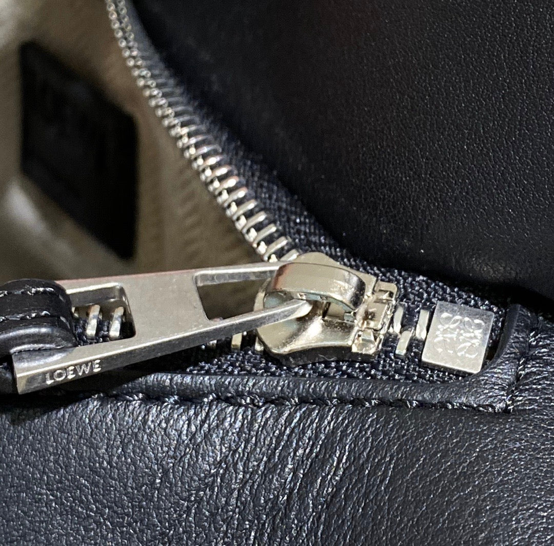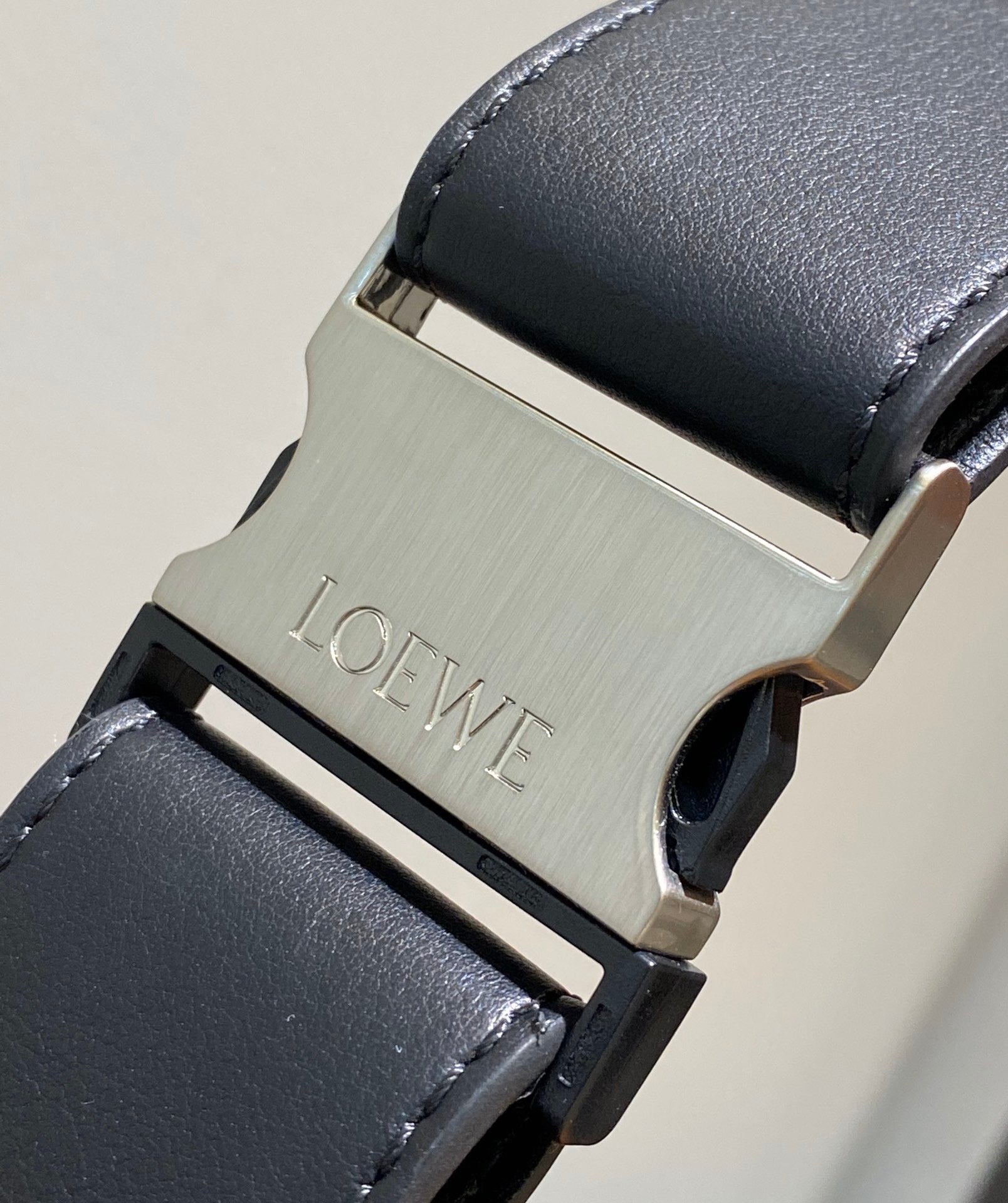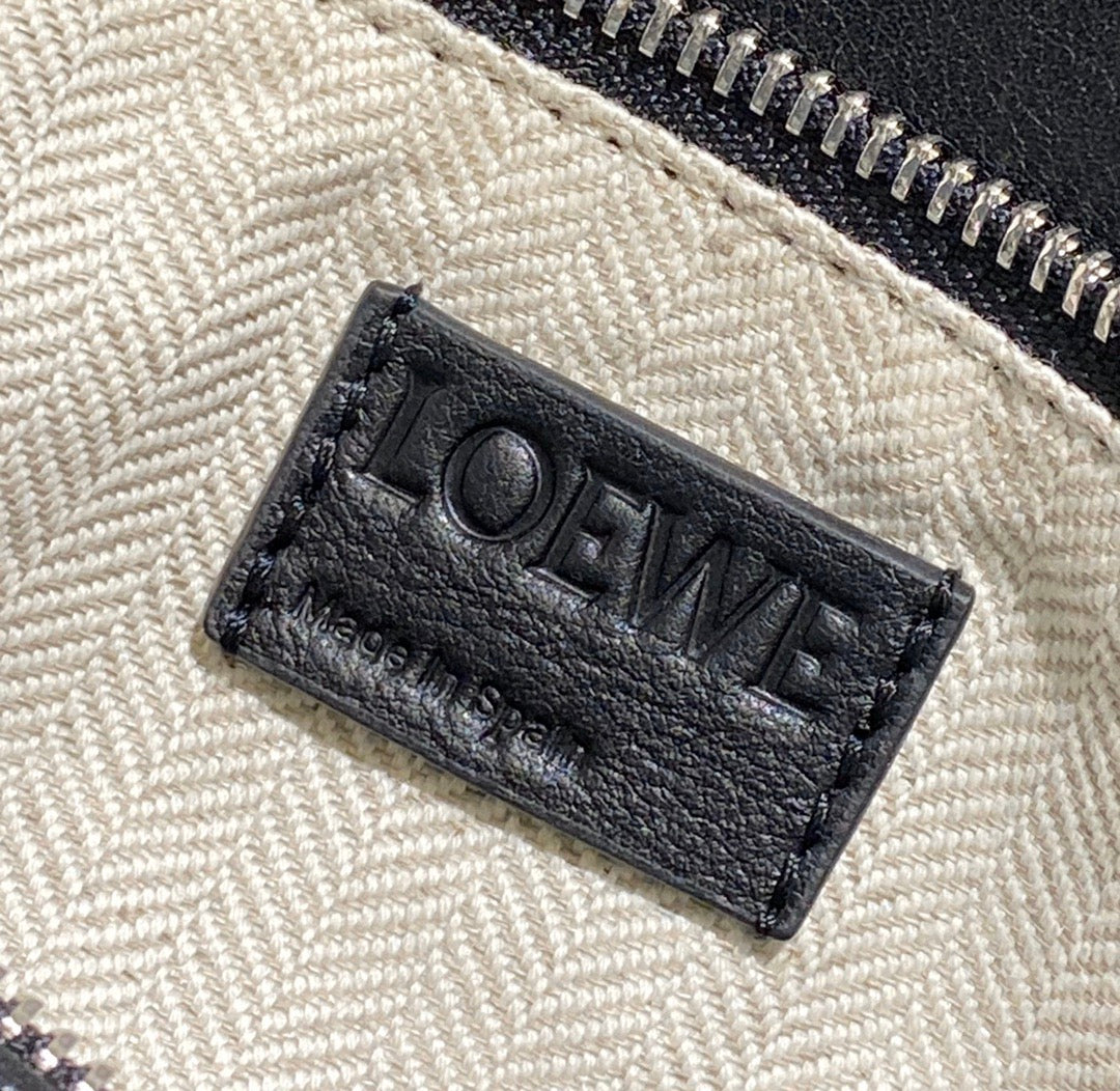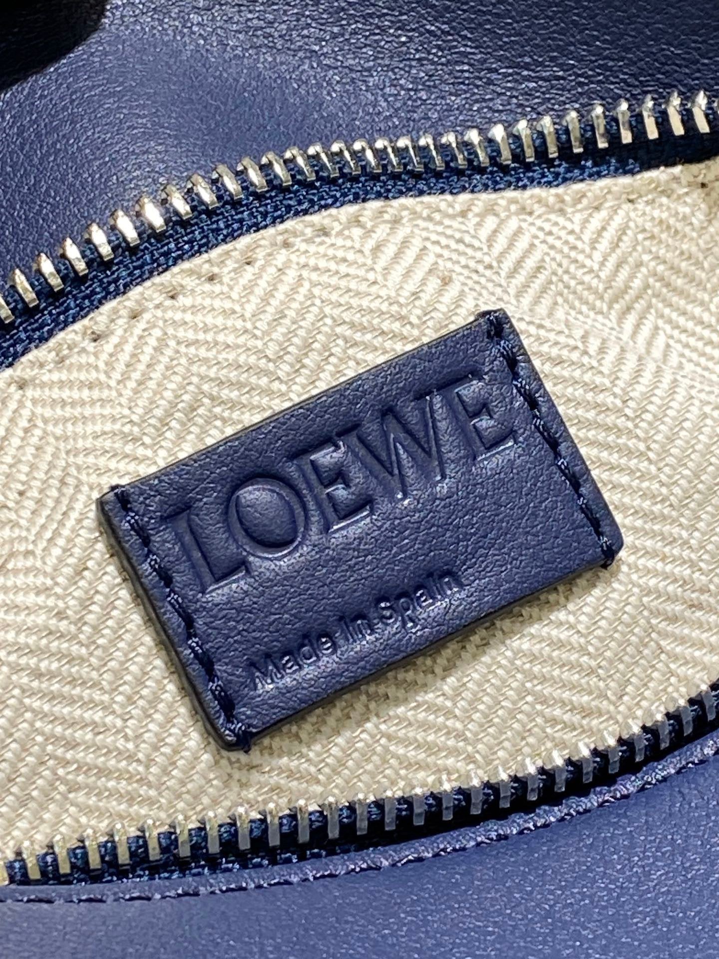 퍼즐백의 상징인 분할된 절개 라인이 유려하게 표현되어 있으며, 소형임에도 구조적인 실루엣이 돋보입니다. 송아지가죽으로 제작되어 부드럽고 고급스러운 텍스처를 제공하며, 허리 또는 어깨에 착용 가능한 스트랩으로 다양한 연출이 가능합니다. 정면에는 로에베의 아나그램 로고가 음각 또는 메탈 디테일로 디자인되어 브랜드 아이덴티티를 강조합니다.