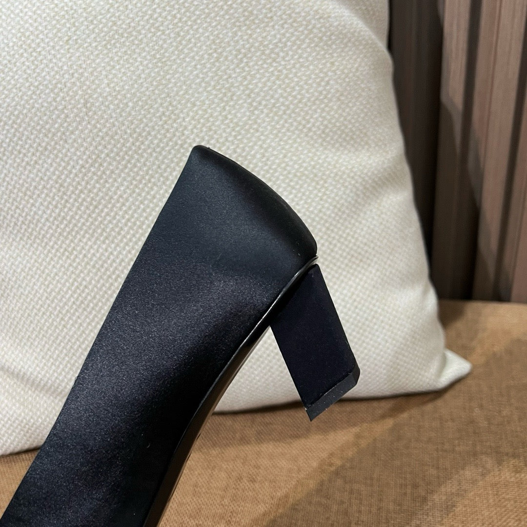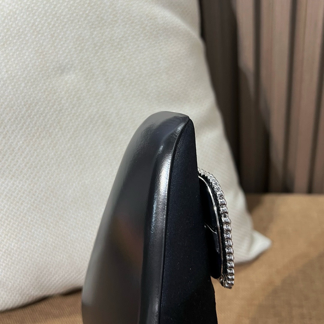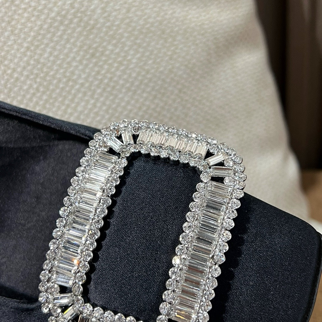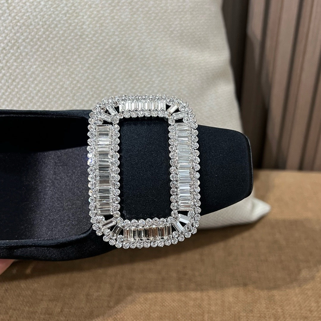 이 제품의 가장 큰 특징은 앞코에 장식된 크리스탈 버클입니다. 정사각형 형태의 버클 위에 촘촘하게 세팅된 고급 크리스탈은 빛을 받을 때마다 은은하고 세련된 광채를 발하며, 로저비비에 특유의 고급스러움을 완벽히 담아냅니다. 은은한 광택의 페이턴트 가죽 또는 새틴 소재와 조화를 이루며 격조 높은 실루엣을 완성합니다.