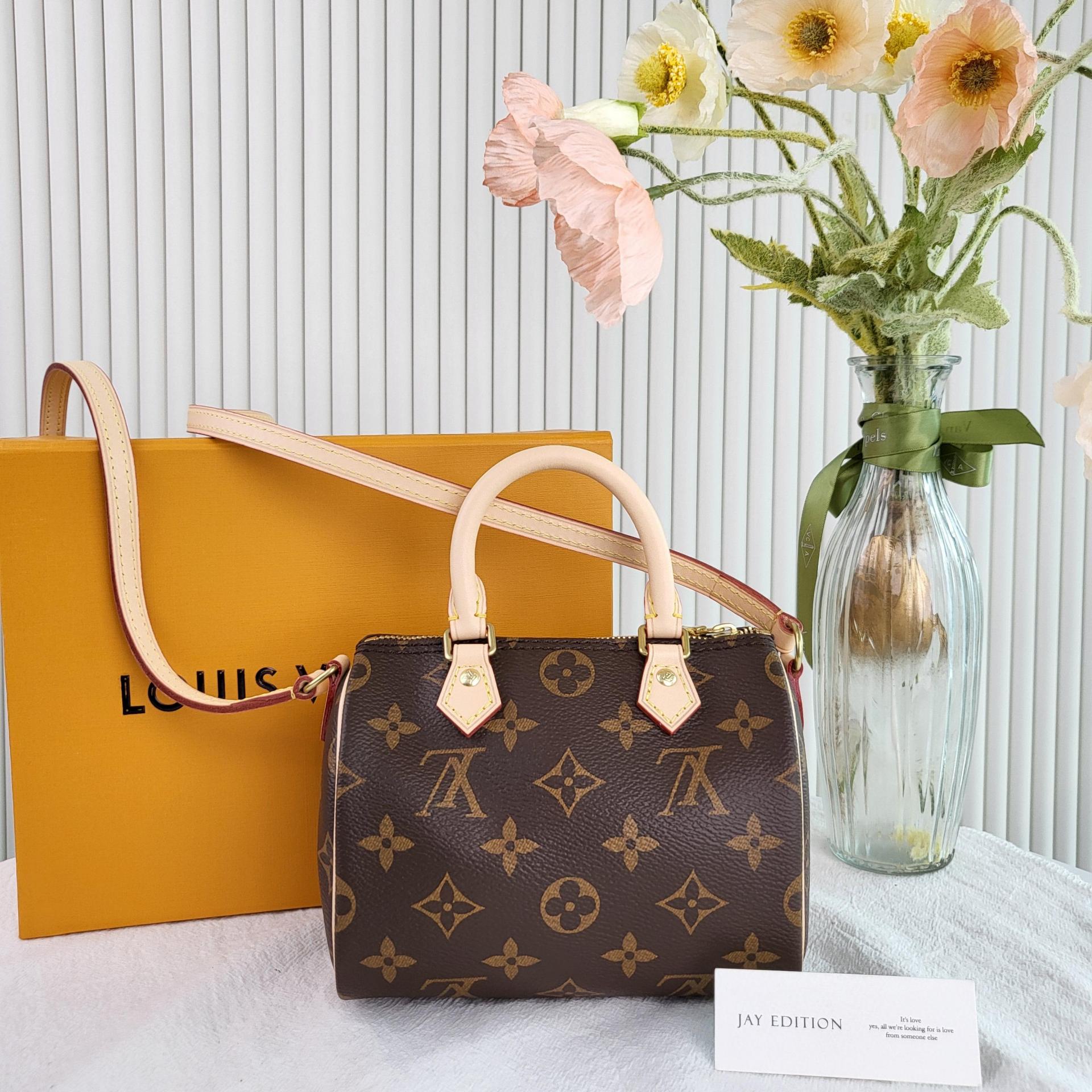 루이비통 나노 스피디 모노그램 미니(Louis Vuitton Nano Speedy Monogram Mini)는 루이비통의 상징적인 스피디 백을 축소한 여성용 미니 토트백으로, 클래식한 디자인과 컴팩트한 크기가 조화를 이루는 인기 아이템입니다. 작지만 완성도 높은 디테일로 데일리룩에 경쾌한 포인트를 더해줍니다.