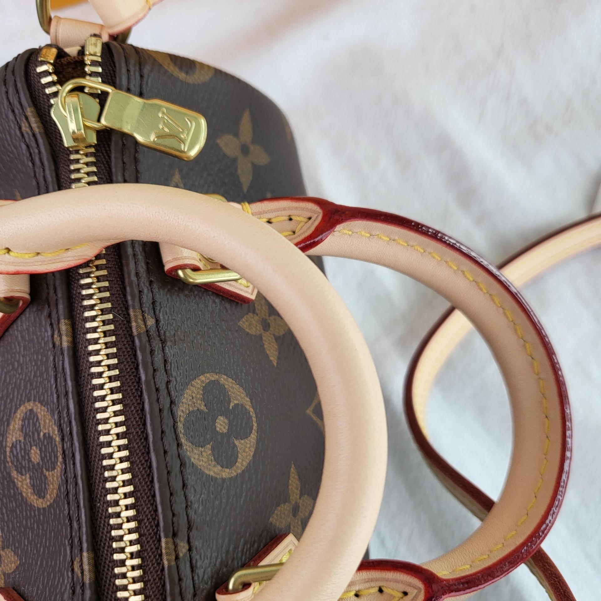 시그니처 모노그램 캔버스와 천연 가죽 트리밍으로 제작된 이 미니백은 스피디 특유의 둥근 실루엣과 더블 핸들, 지퍼 클로저가 그대로 적용되어 루이비통의 정체성을 느낄 수 있습니다. 작은 사이즈임에도 섬세한 마감과 견고한 구조가 특징입니다.