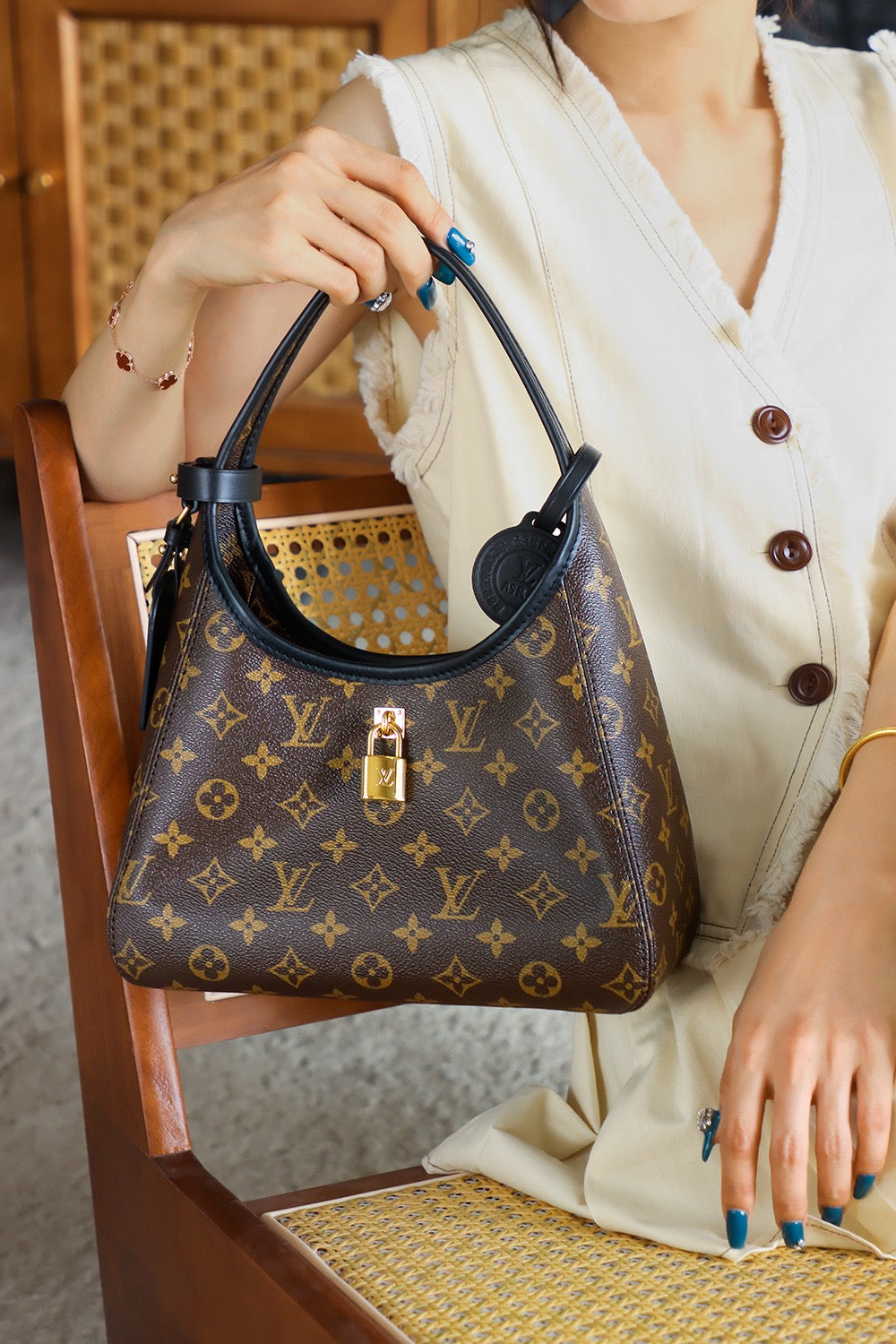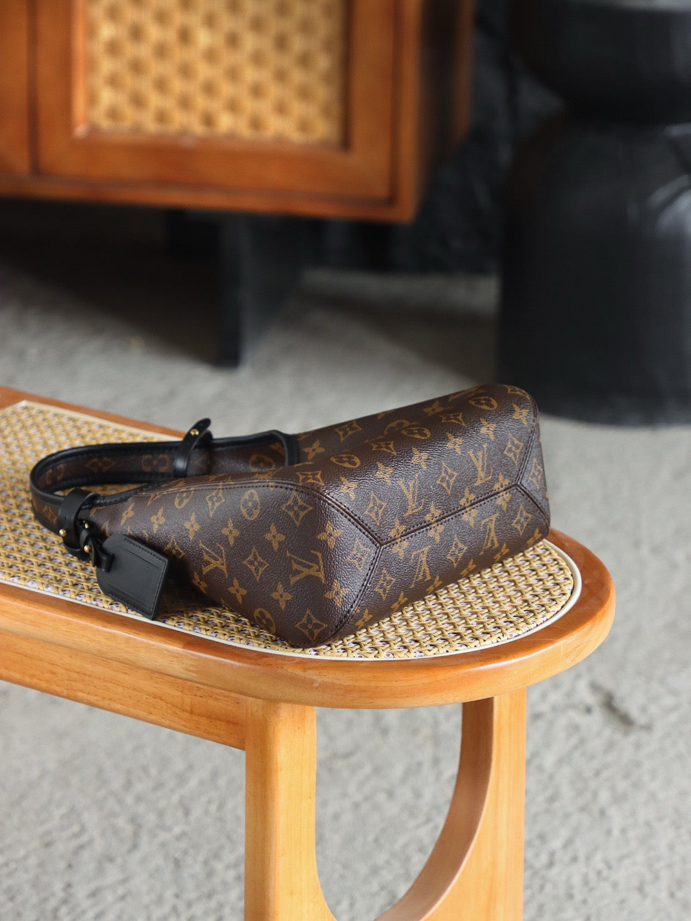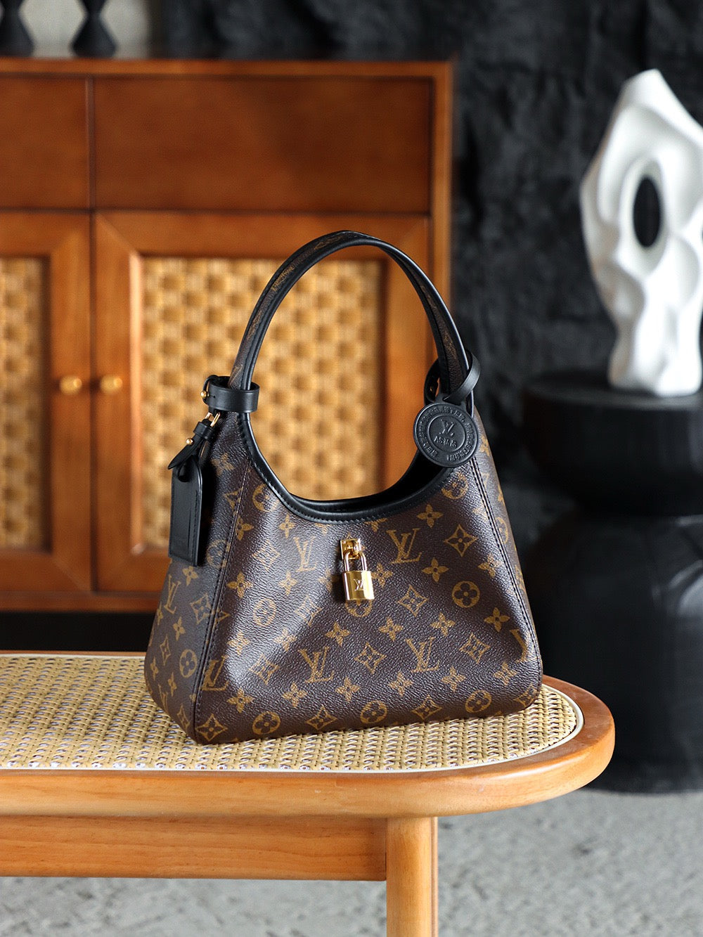 유연하게 떨어지는 곡선형 쉐입과 짧은 숄더 스트랩이 조화를 이루며, 미니멀한 외관에 시그니처 모노그램 앙프렝뜨 가죽이 고급스러운 질감을 전합니다. LV 로고가 은은하게 엠보싱 처리되어 브랜드의 감성을 절제된 형태로 표현합니다.