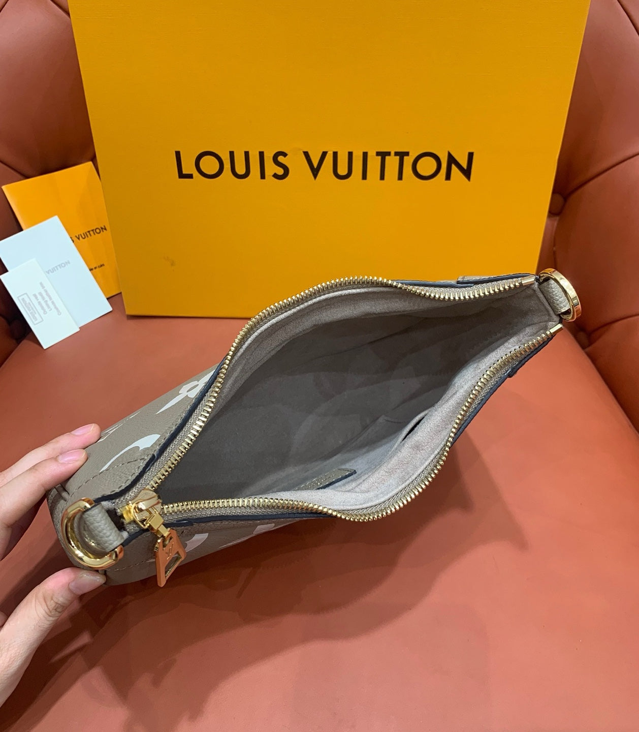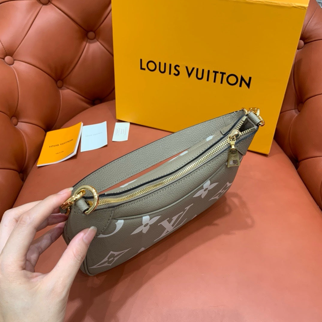 이 백은 반달형의 실루엣과 컴팩트한 크기가 특징입니다. 부드럽고 유연한 그레인드 송아지 가죽에 모노그램 앙프렝뜨 패턴을 엠보싱 처리해 입체감 있는 텍스처를 구현했으며, 루이비통 특유의 골드 톤 하드웨어가 고급스러운 디테일을 더합니다. 상단 핸들과 탈착 가능한 숄더 스트랩이 함께 구성되어 있어 다양한 스타일링이 가능합니다.