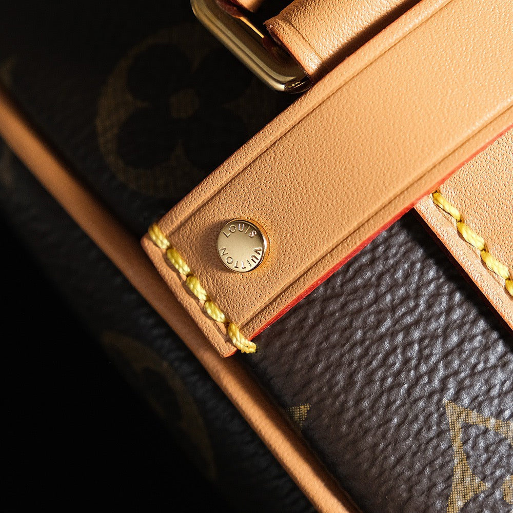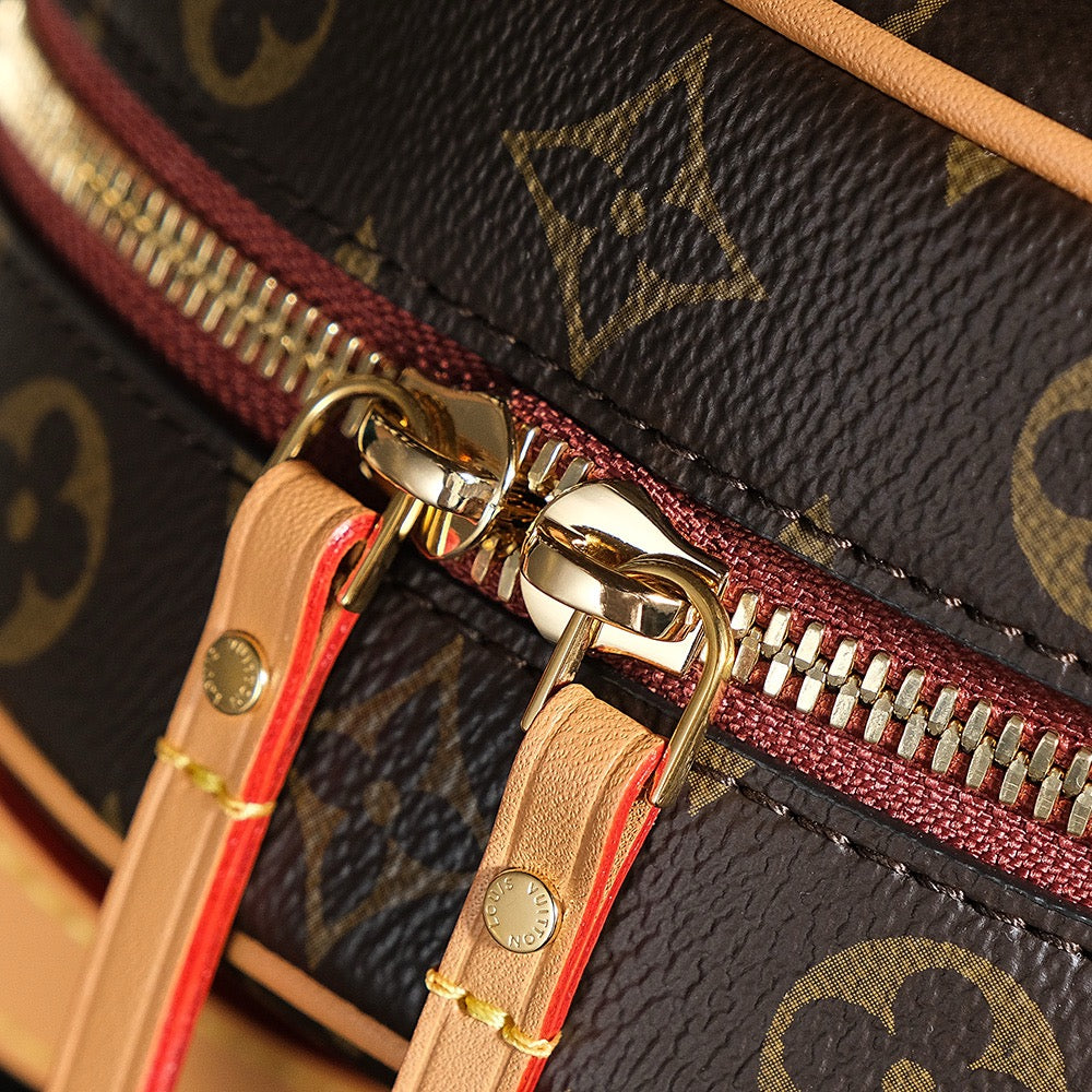 시그니처 모노그램 캔버스와 송아지 가죽 트리밍이 조화를 이루며, 둥글고 부드러운 라운드 쉐입이 시선을 사로잡습니다. 클래식한 트렁크 디테일과 LV 러기지 태그가 브랜드의 전통을 표현하며, 더블 지퍼 클로저와 가죽 탑 핸들로 실용성도 겸비했습니다.
