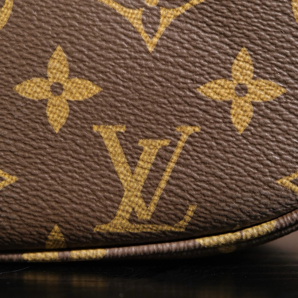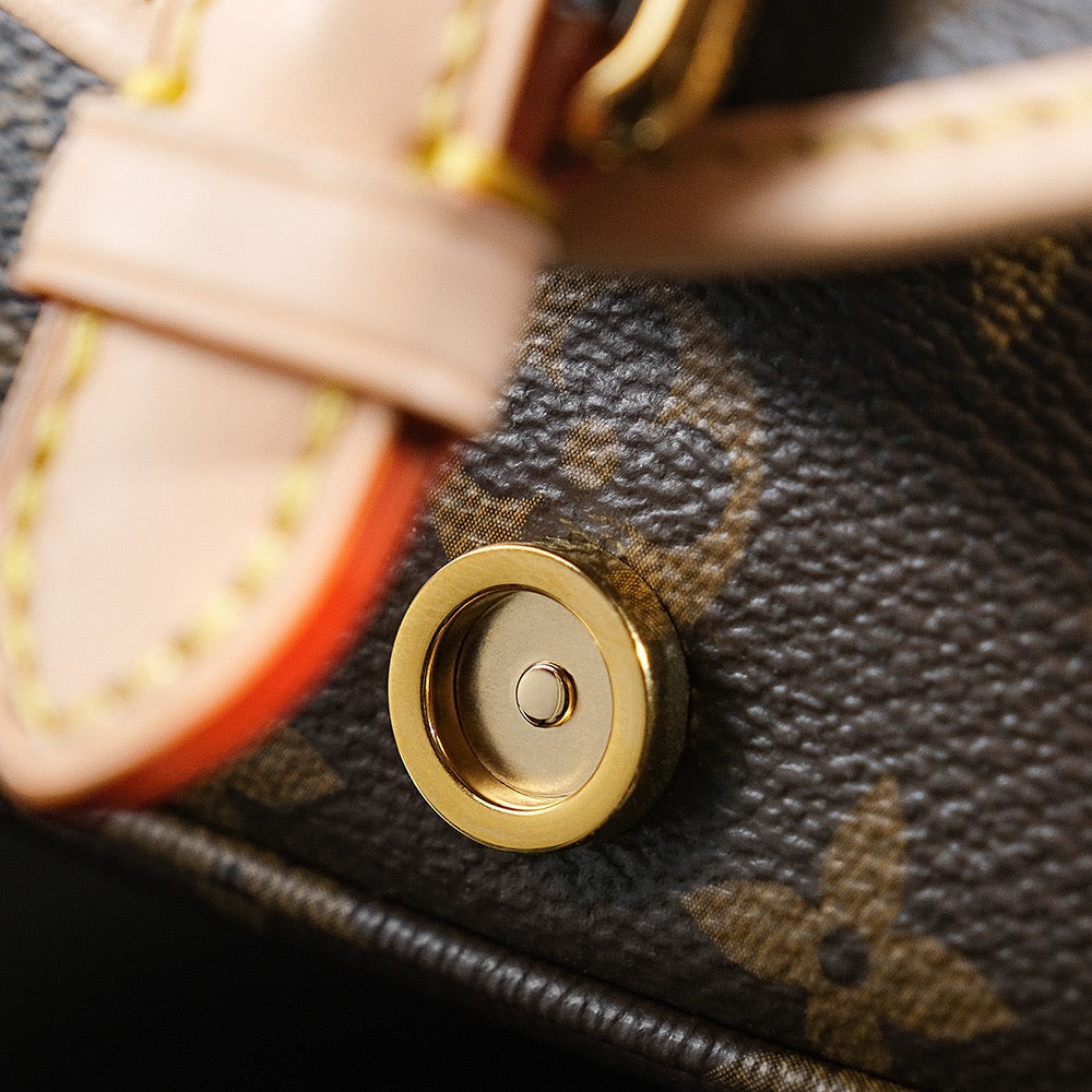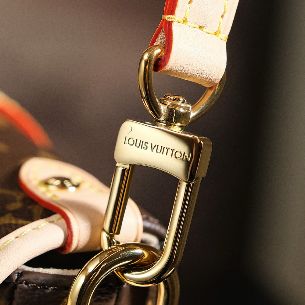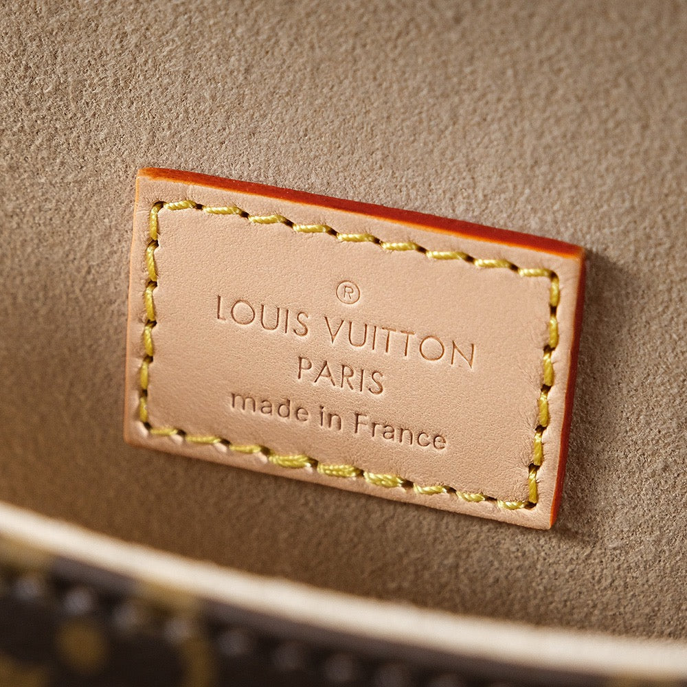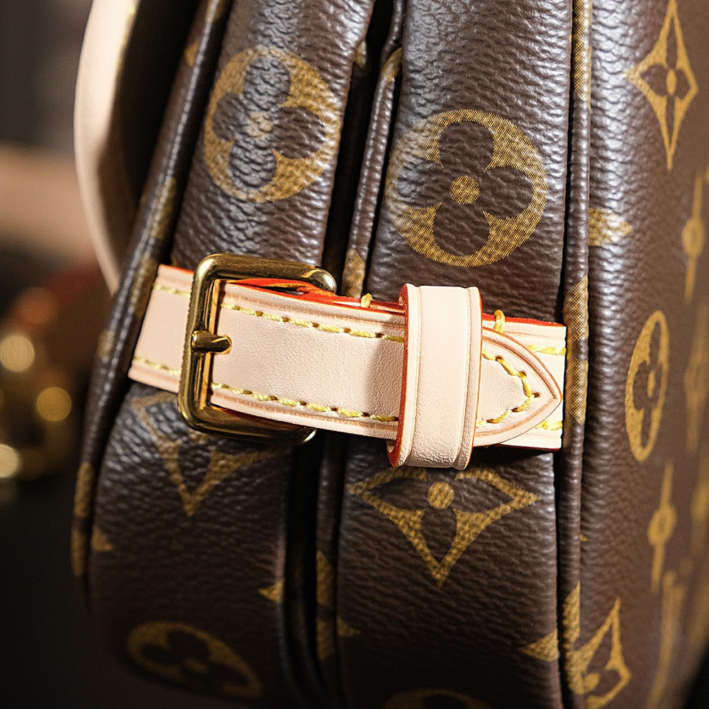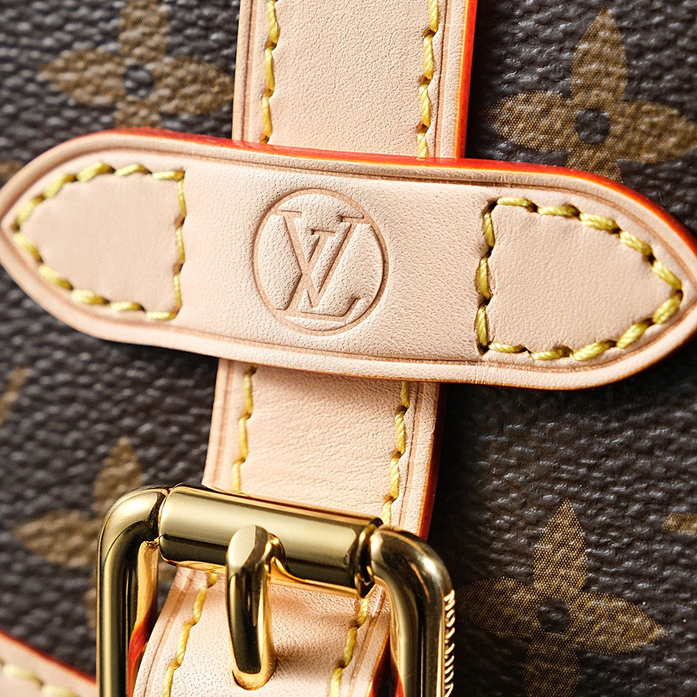 소뮈르 BB는 프랑스 승마 문화를 연상시키는 디자인으로, 전면과 후면이 대칭 구조로 구성된 독특한 쉐입이 특징입니다. 루이비통의 시그니처 모노그램 캔버스와 소가죽 트리밍이 고급스러움을 더하며, 양쪽에 위치한 버클 플랩 클로저는 유니크한 포인트가 됩니다.