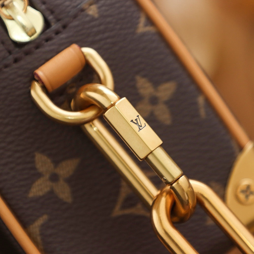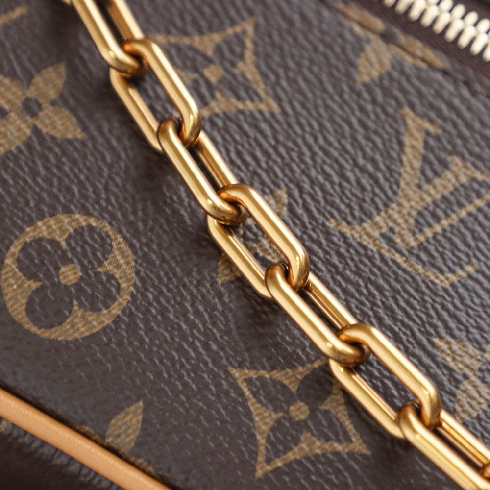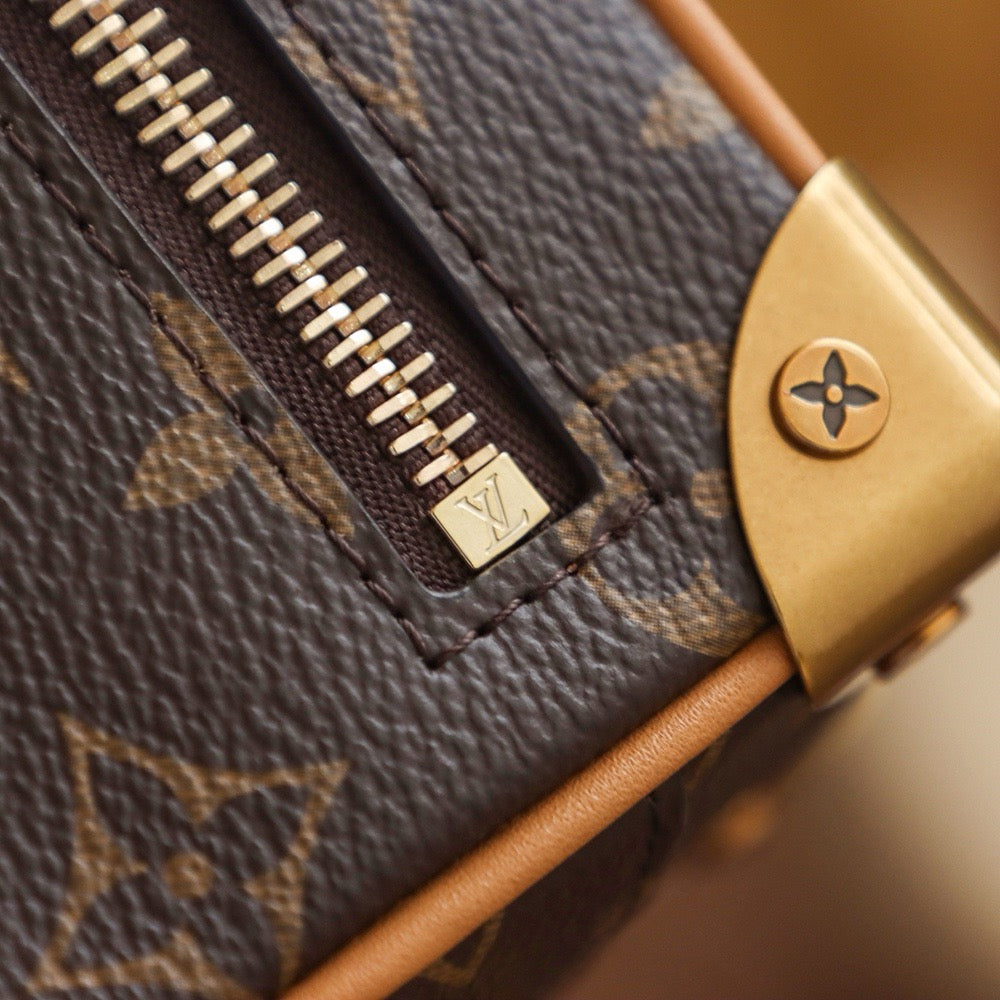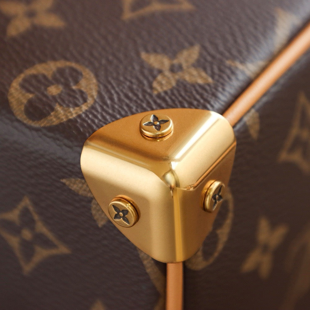 루이비통의 상징적인 하드 트렁크에서 영감을 받아, 소프트한 가죽 소재와 모서리의 금속 리벳 디테일이 결합된 디자인입니다. 모노그램 엠보싱 가죽 또는 캔버스 소재로 제작되며, 견고한 박스형 실루엣과 지퍼 클로저가 구조적인 매력을 강조합니다.