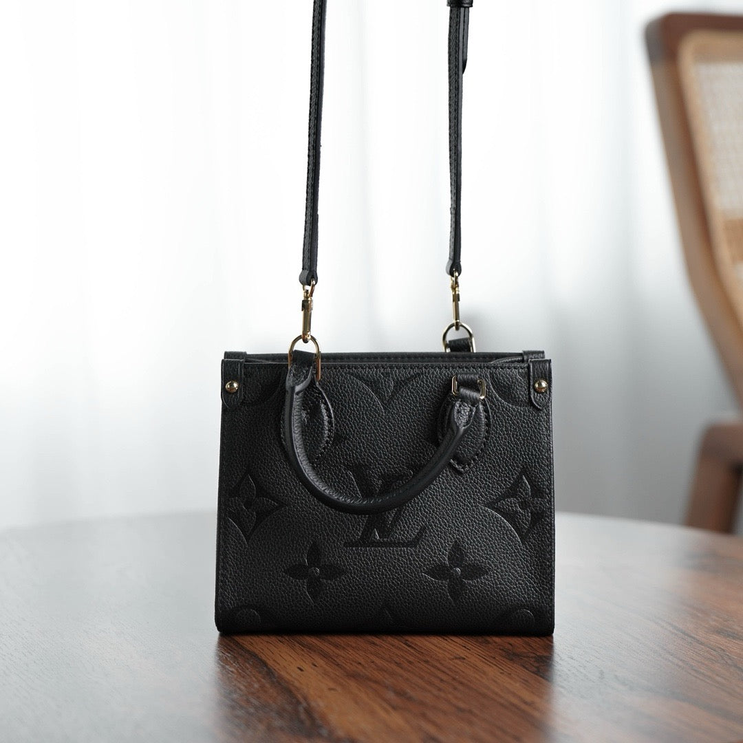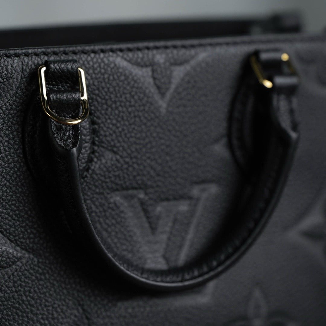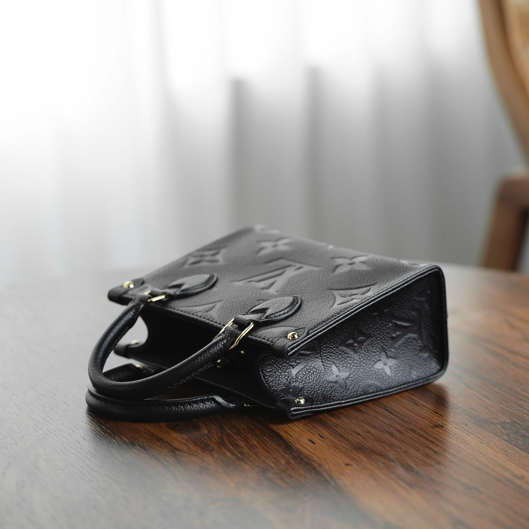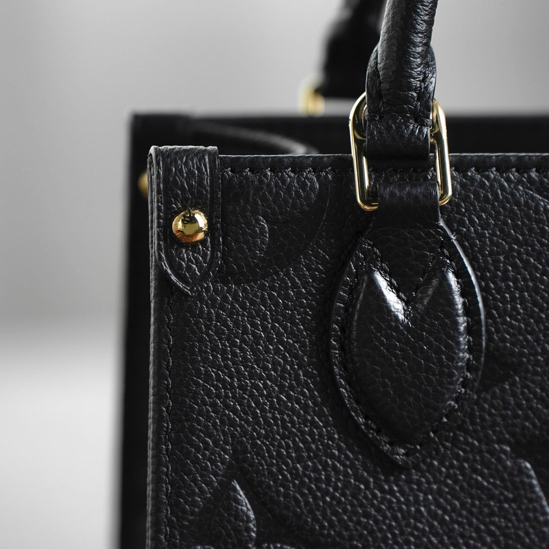 루이비통의 시그니처 토트백인 온더고 실루엣을 BB 사이즈로 축소하여 휴대성과 스타일을 동시에 갖춘 디자인입니다. 블랙 앙프렝뜨 가죽 위에 엠보싱 처리된 모노그램 패턴이 고급스러운 입체감을 더하며, 간결한 사각형 구조가 도시적인 무드를 완성합니다.