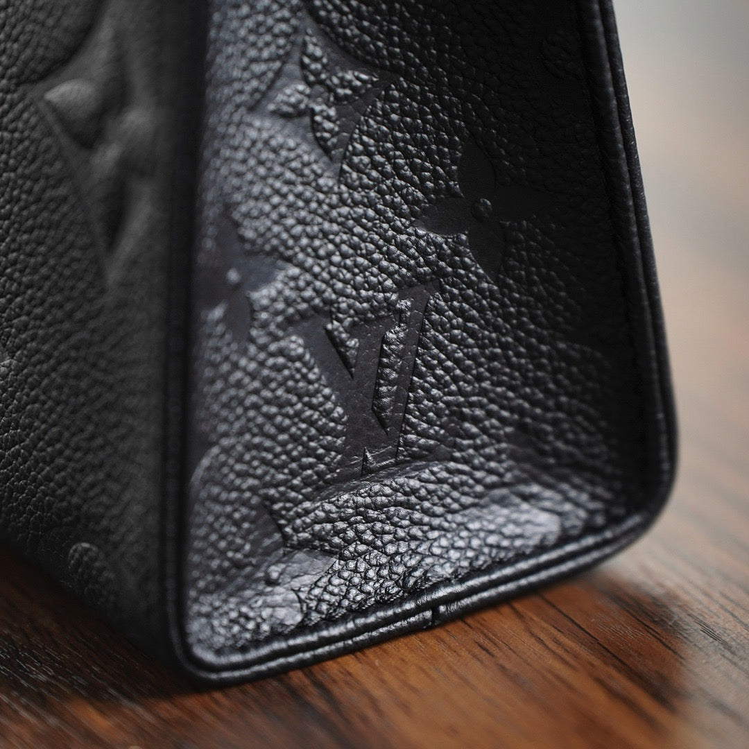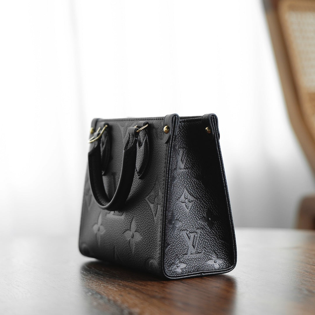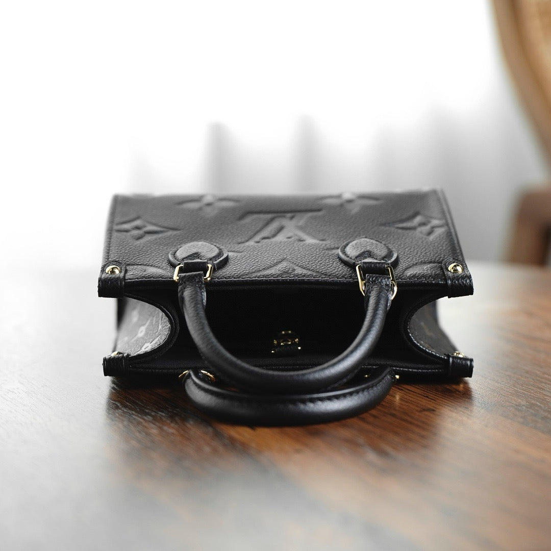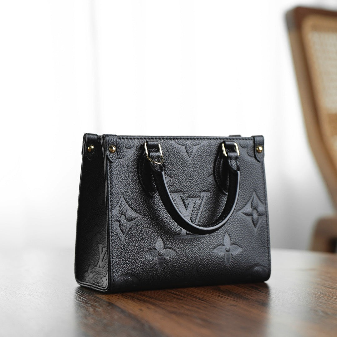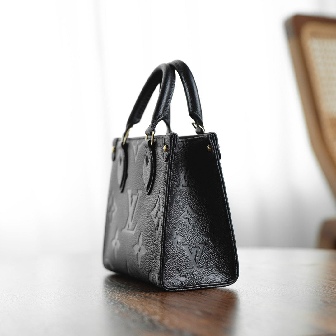 루이비통의 시그니처 토트백인 온더고 실루엣을 BB 사이즈로 축소하여 휴대성과 스타일을 동시에 갖춘 디자인입니다. 블랙 앙프렝뜨 가죽 위에 엠보싱 처리된 모노그램 패턴이 고급스러운 입체감을 더하며, 간결한 사각형 구조가 도시적인 무드를 완성합니다.