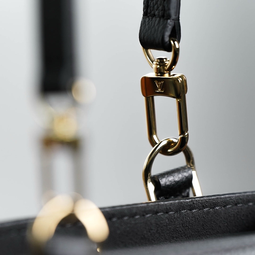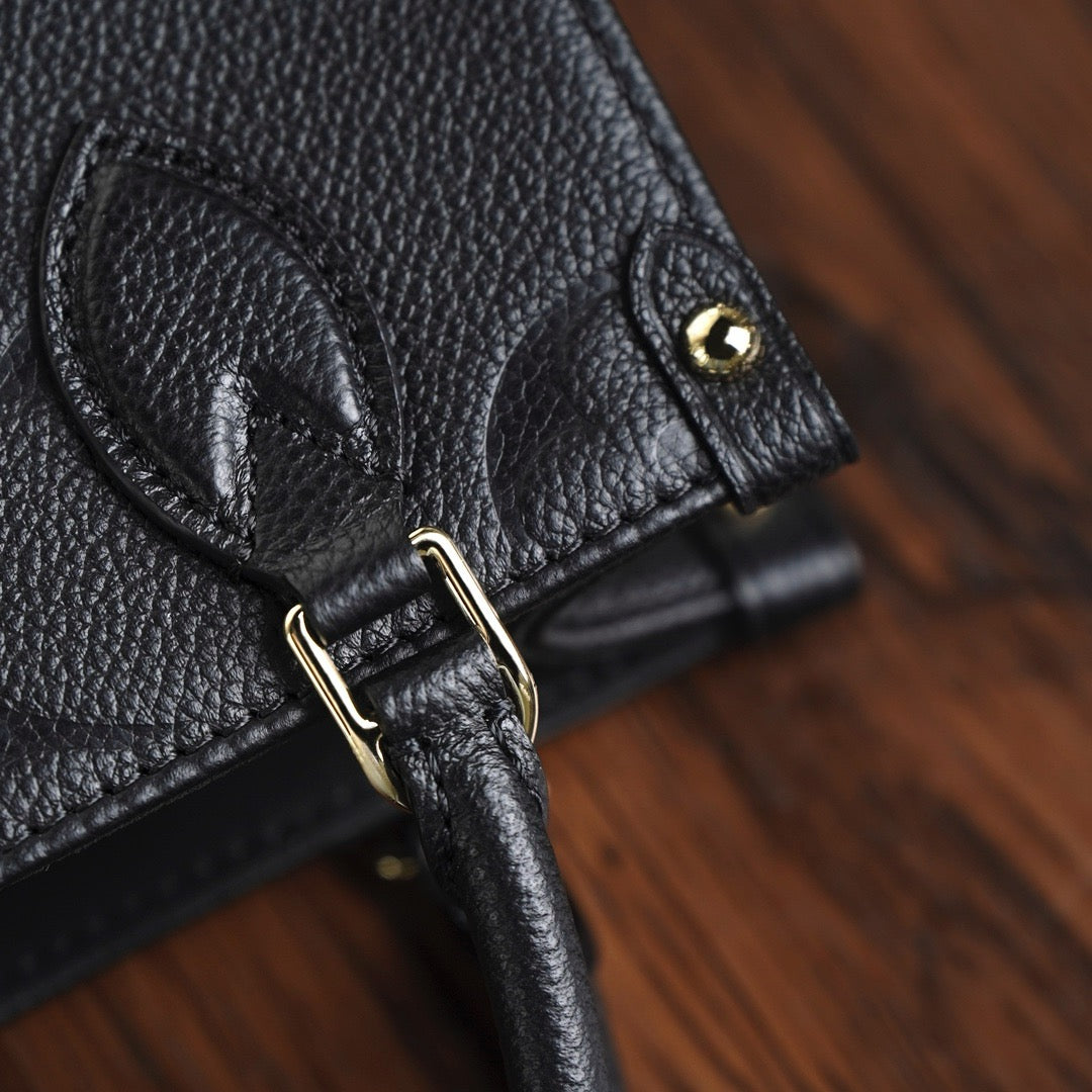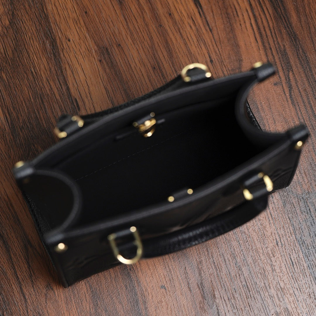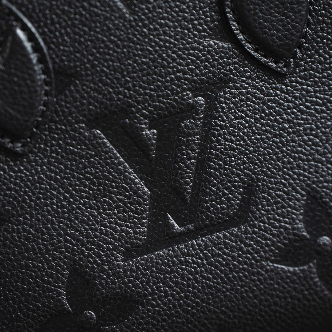 루이비통의 시그니처 토트백인 온더고 실루엣을 BB 사이즈로 축소하여 휴대성과 스타일을 동시에 갖춘 디자인입니다. 블랙 앙프렝뜨 가죽 위에 엠보싱 처리된 모노그램 패턴이 고급스러운 입체감을 더하며, 간결한 사각형 구조가 도시적인 무드를 완성합니다.
