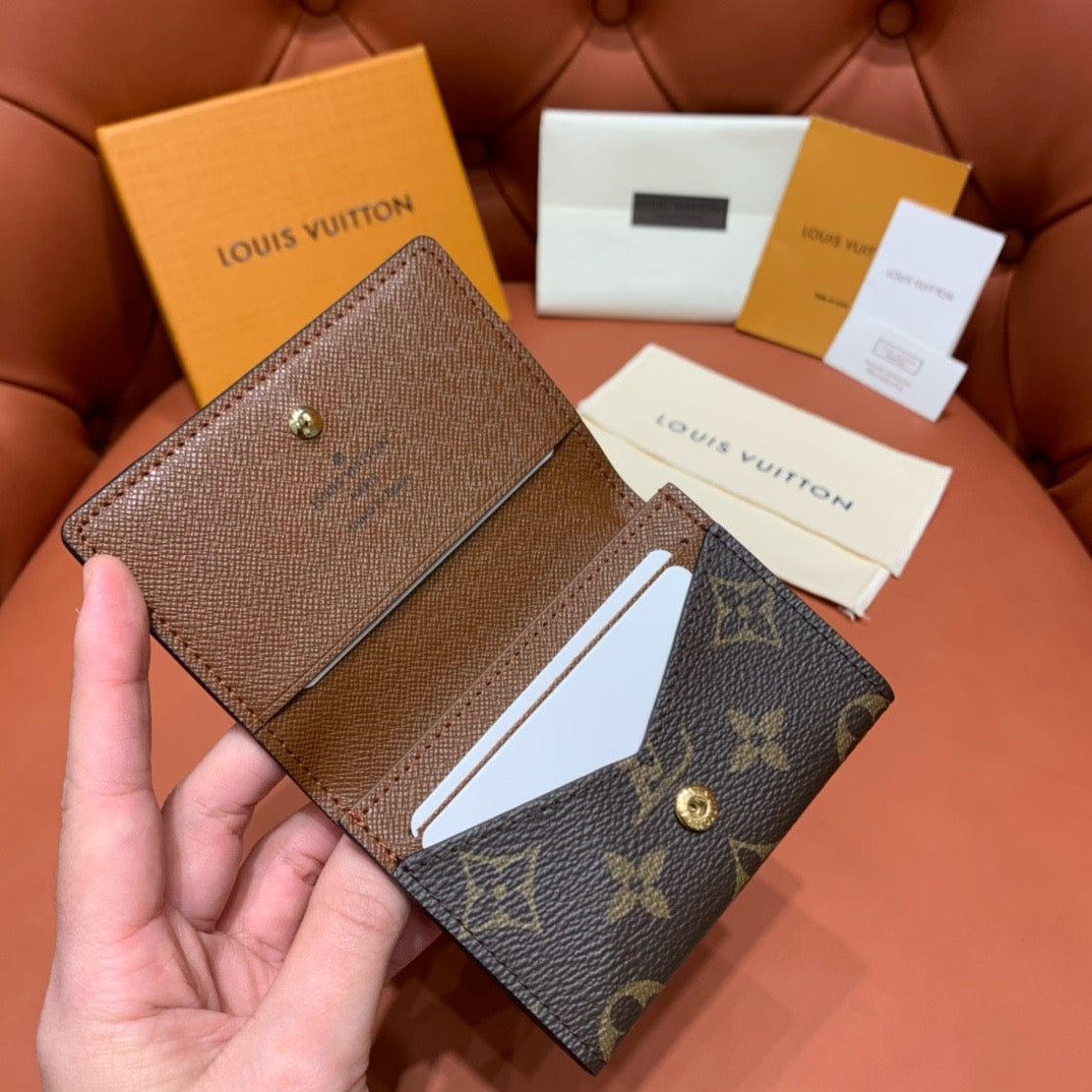 루이비통 엔벨로프 카르트 드 비지트는 봉투를 연상시키는 플랩 디자인과 정교한 스냅 버튼 클로저가 특징입니다. 앙프렝뜨 가죽 또는 모노그램 캔버스 등 다양한 소재로 출시되며, 작지만 강한 인상을 주는 포켓 사이즈의 제품입니다.