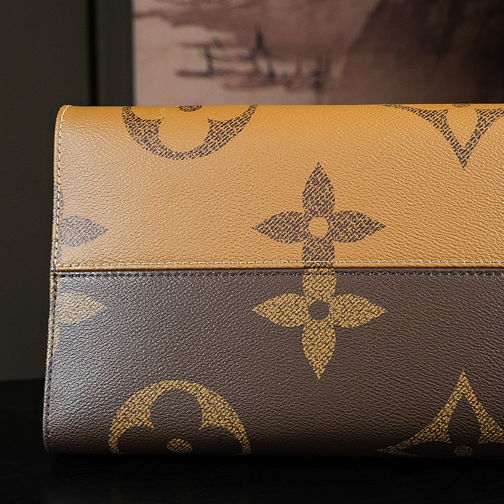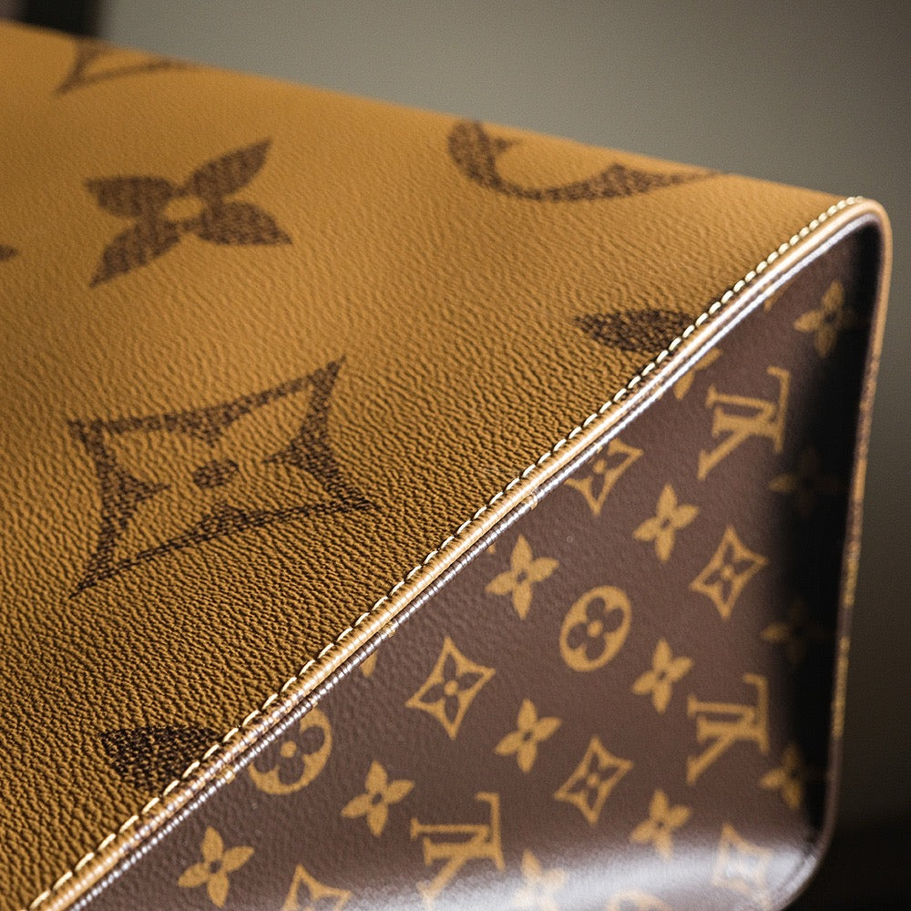 GM 사이즈는 루이비통 온더고 라인 중 가장 큰 크기로, 여행용 캐리어처럼 넓은 수납공간이 특징입니다. 모노그램과 리버스 모노그램이 조화를 이루는 디자인은 시각적으로도 유니크하며, 상단의 가죽 더블 핸들과 탈부착 가능한 롱 스트랩이 함께 구성되어 다양한 착용이 가능합니다.