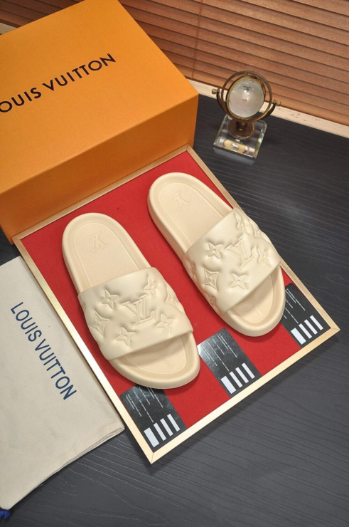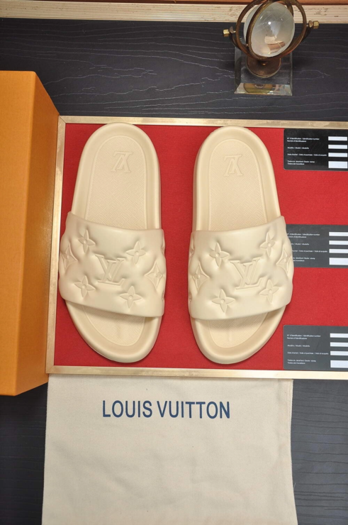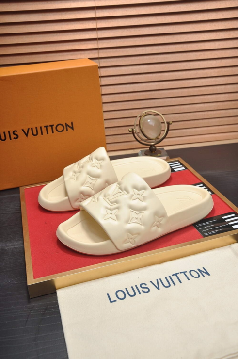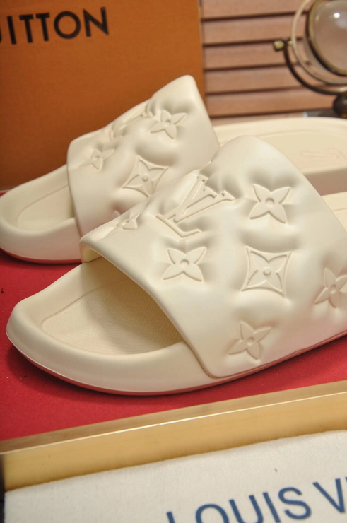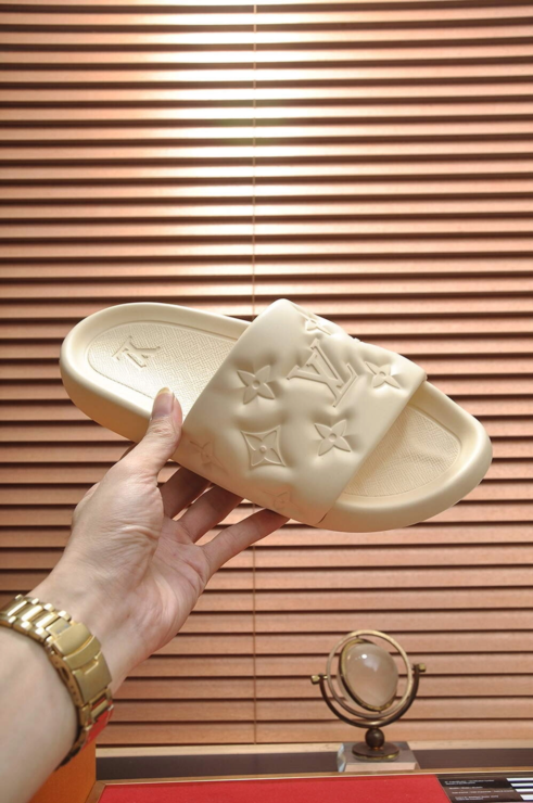심플한 오픈토 형태의 뮬 슬리퍼로, 스트랩 전면에는 루이비통의 모노그램 플라워 또는 LV 이니셜이 양각 처리되어 브랜드 정체성을 강조합니다. 군더더기 없는 실루엣으로 다양한 스타일에 쉽게 매칭되며, 물에 젖어도 손쉽게 관리할 수 있어 여름 시즌에 특히 유용합니다.