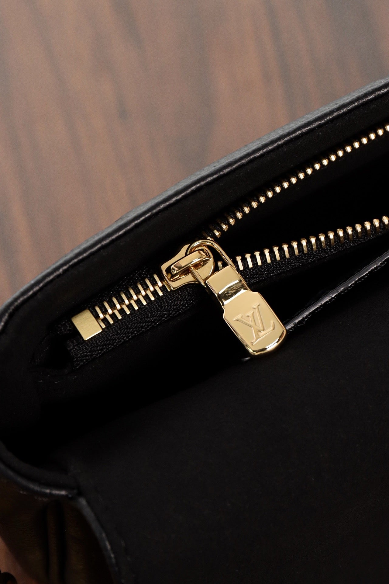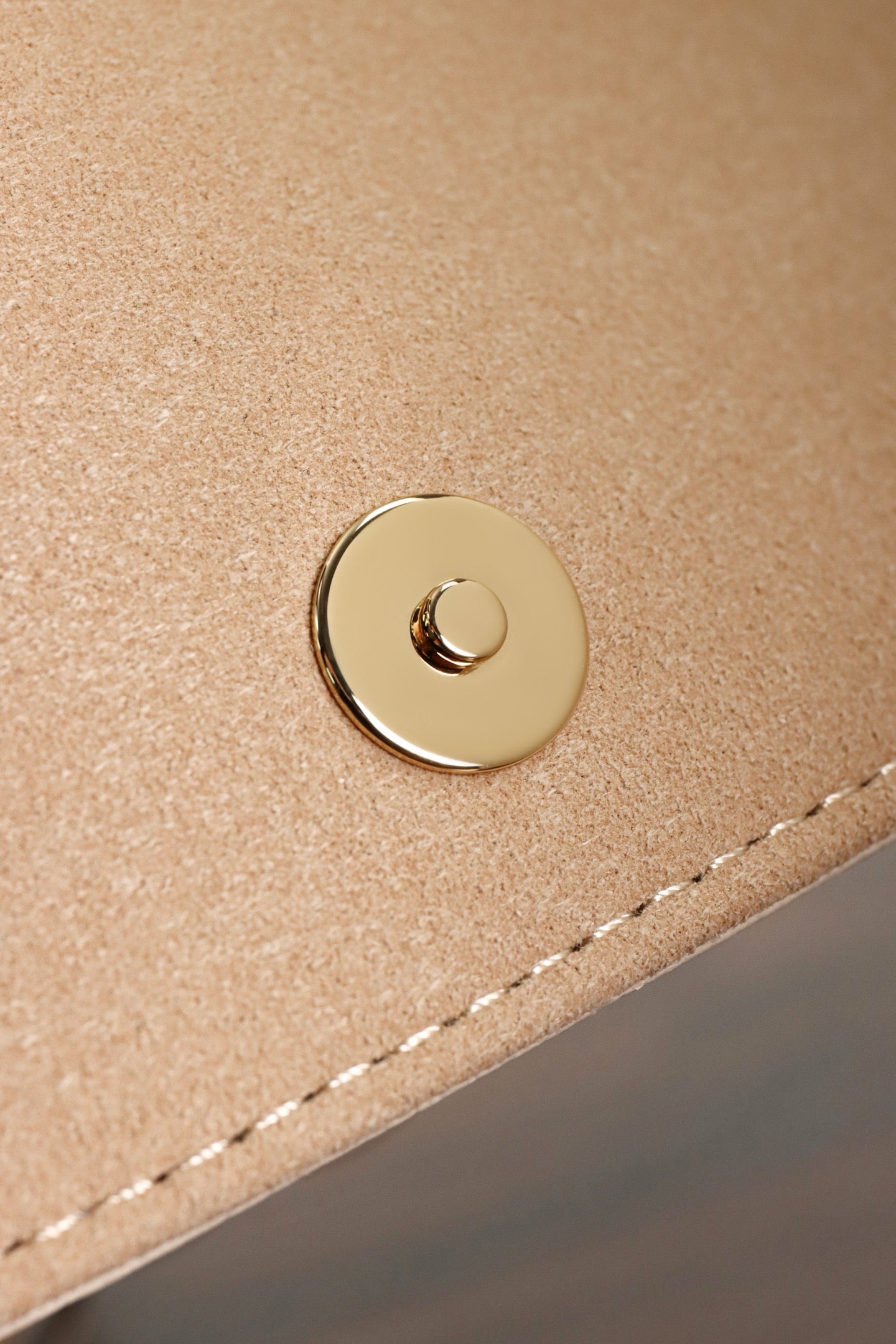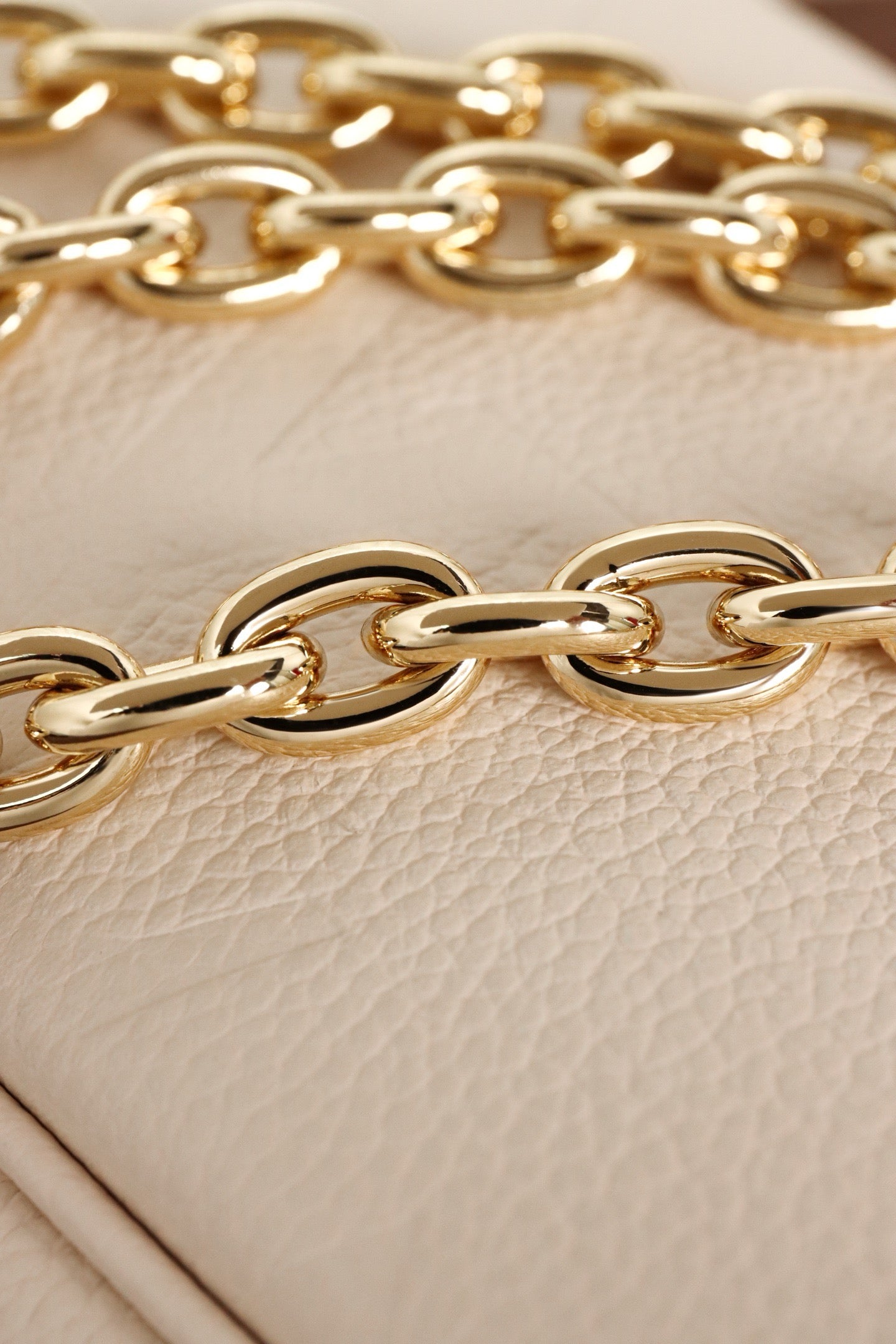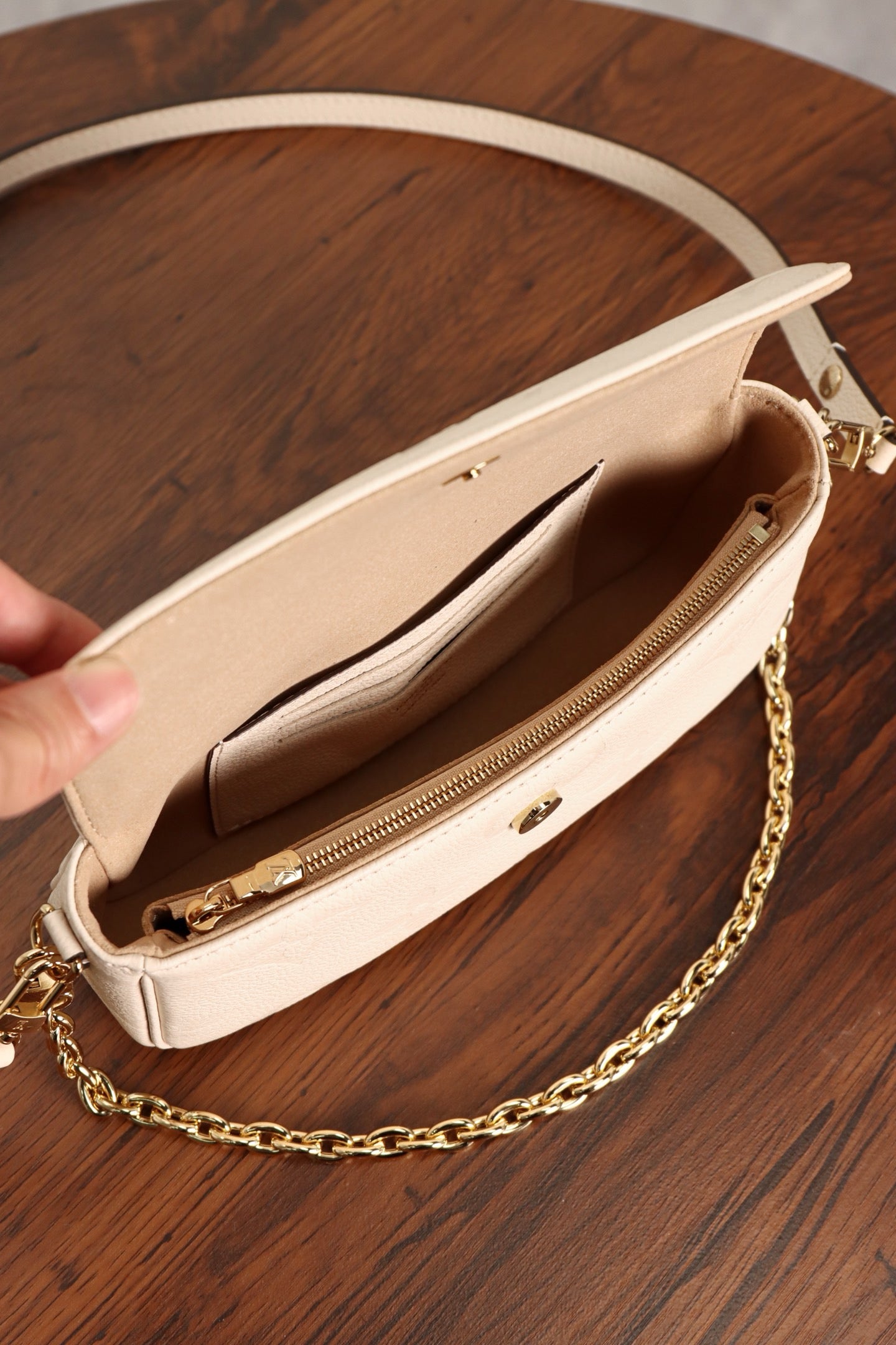 곡선이 강조된 반달형 플랩과 마그네틱 클로저가 적용되어 간편하게 여닫을 수 있으며, 크림 컬러 가죽에 엠보싱된 모노그램 패턴이 세련되고 페미닌한 무드를 더합니다. 골드 체인 스트랩이 우아한 포인트로 작용하며, 어떤 스타일에도 조화롭게 어울립니다.