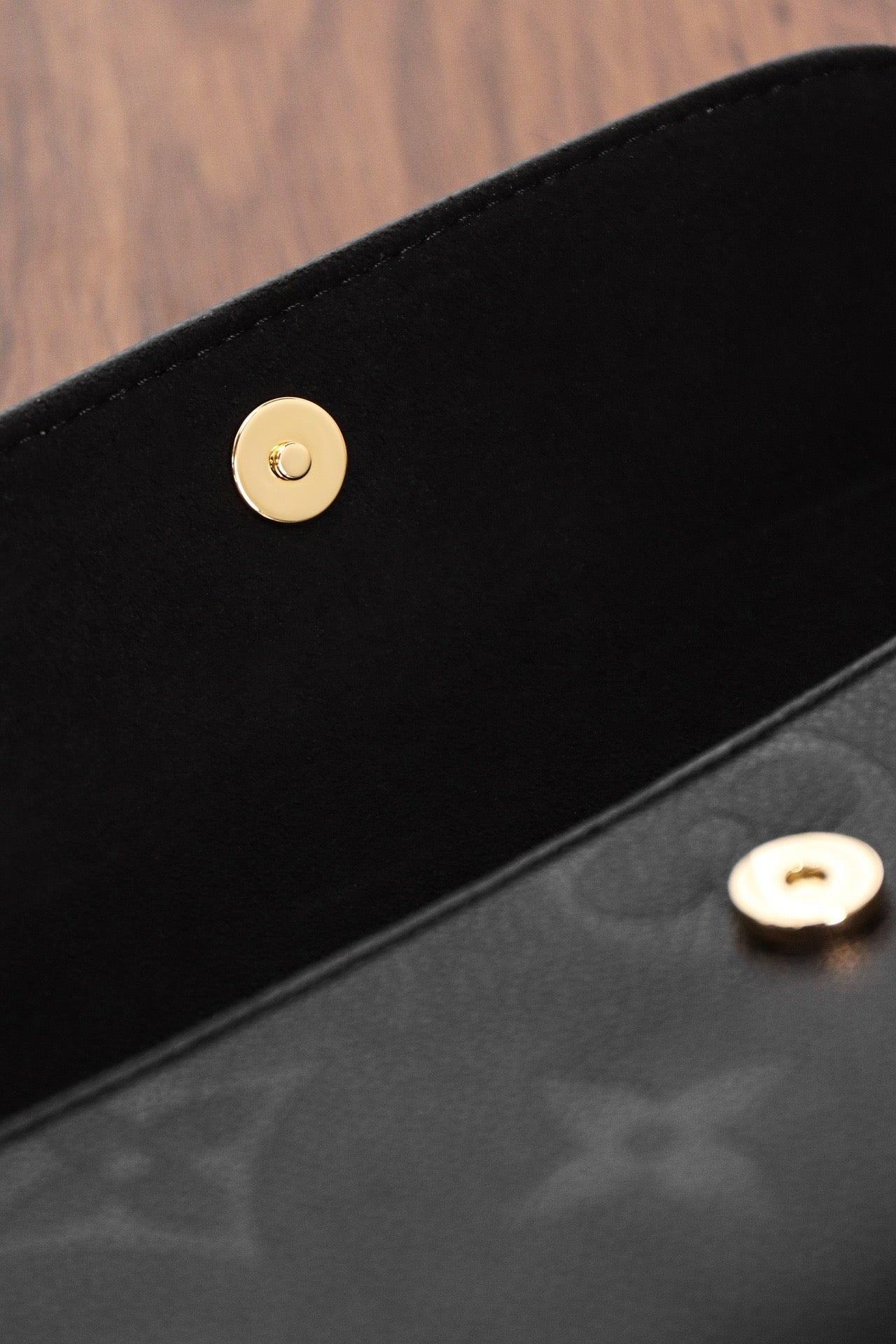 카드 슬롯, 지퍼 포켓, 플랫 포켓이 포함된 내부는 지갑 대용으로도 활용 가능하며, 립스틱이나 미니 향수 등의 소지품도 수납 가능합니다. 탈부착 가능한 체인 스트랩이 포함되어 숄더, 크로스, 클러치 등 다양한 스타일로 연출할 수 있습니다.