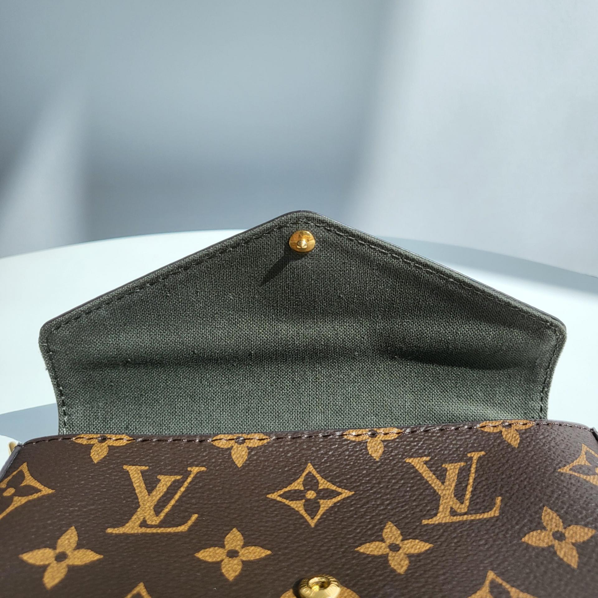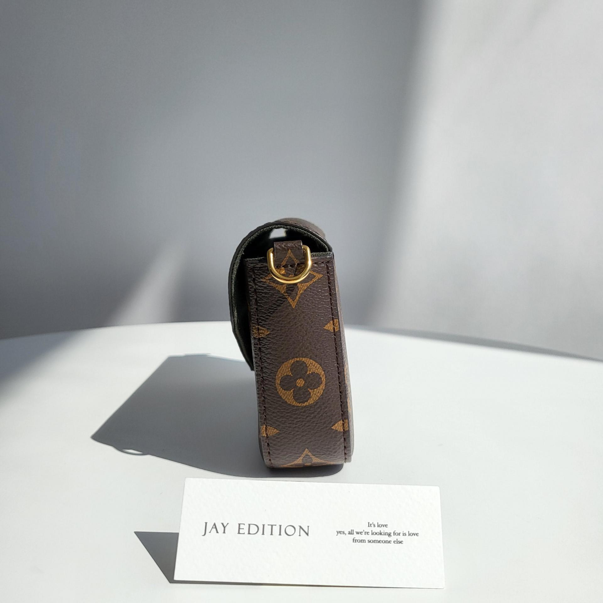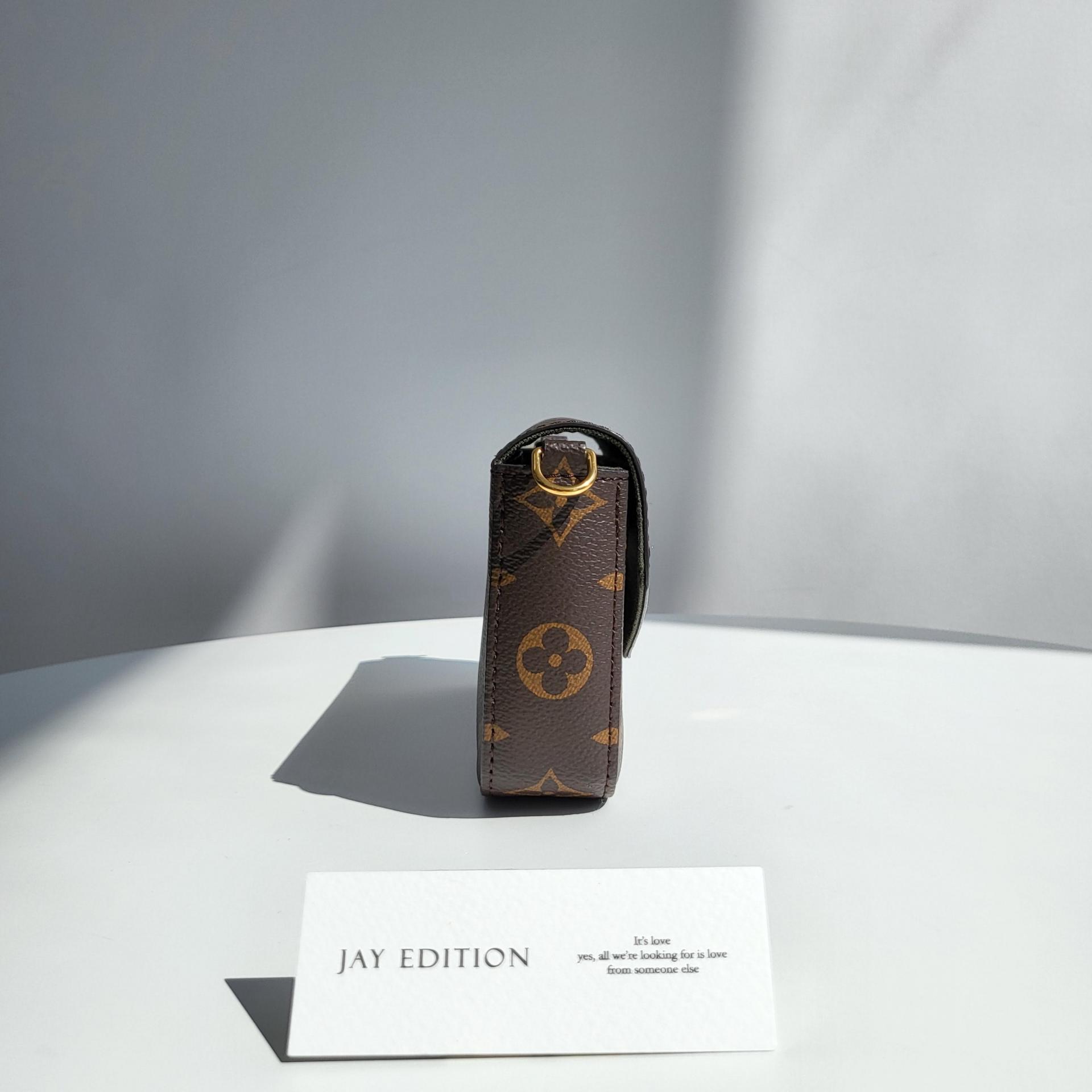 모노그램 캔버스 또는 앙프렝뜨 가죽 소재로 제작되며, 내부에는 탈부착 가능한 지퍼형 파우치와 카드 슬롯 인서트가 포함되어 있어 지갑 대용으로도 활용 가능합니다. 전면 LV 로고 또는 골드 하드웨어 장식이 포인트를 더합니다.