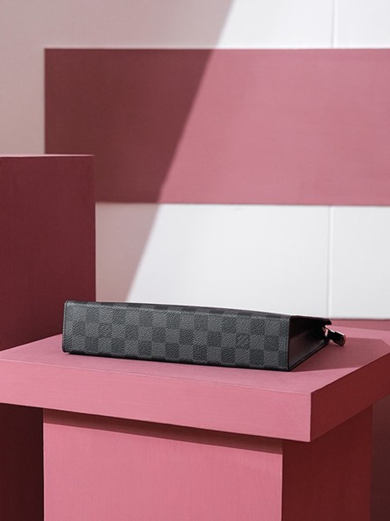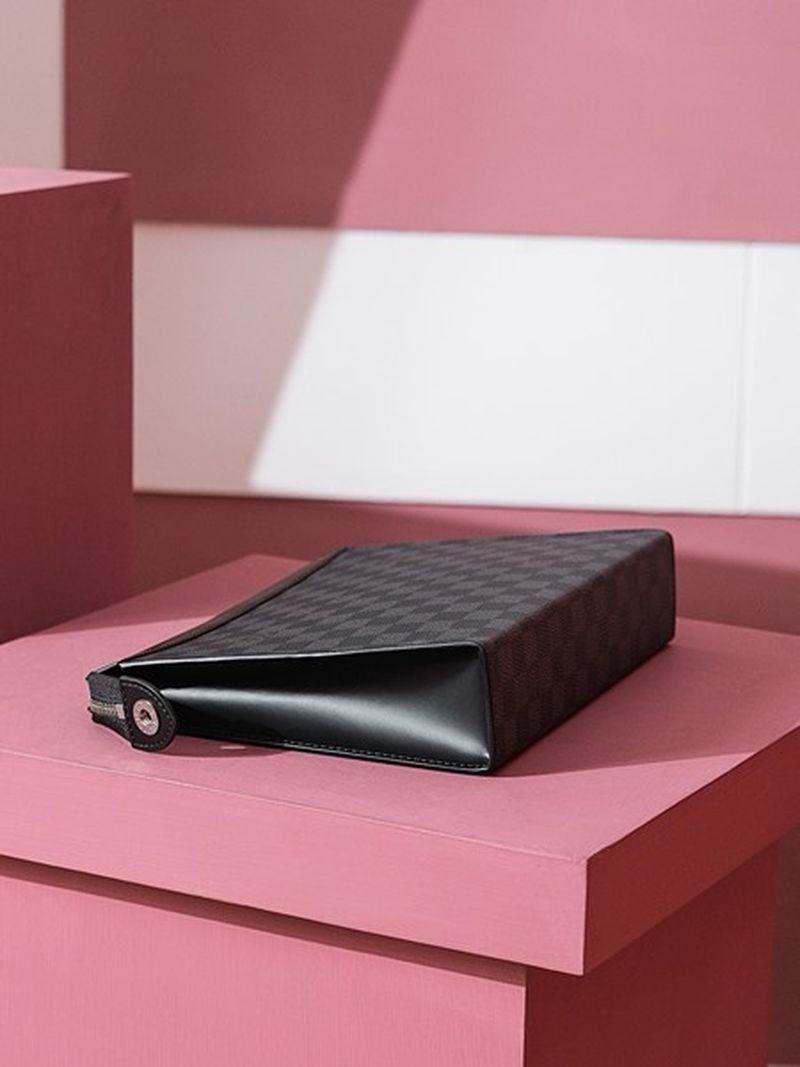 포쉐트 보야주는 이름 그대로 파우치형 클러치백으로, 외출 시 간편한 소지품을 정리하기에 이상적인 제품입니다. 다미에 캔버스 특유의 격자무늬 패턴이 정제된 분위기를 자아내며, 깔끔한 직사각형 실루엣으로 어떤 복장에도 잘 어울립니다.