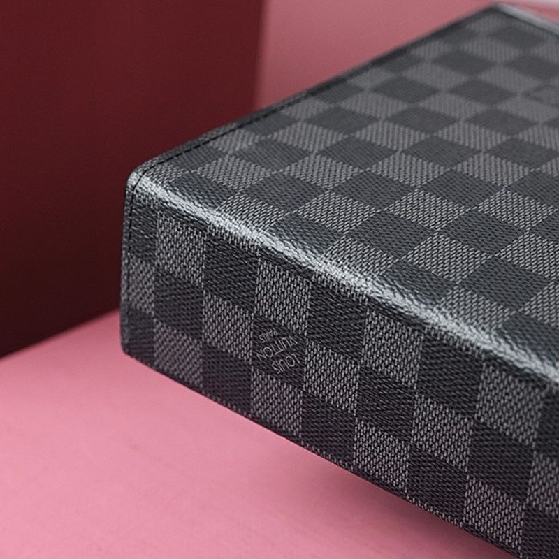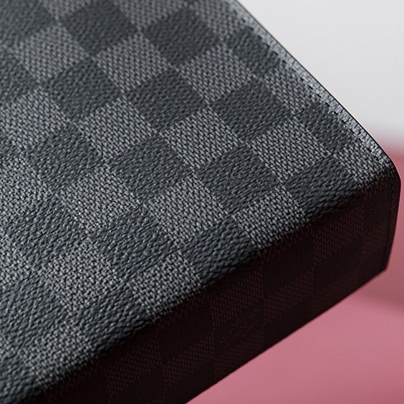 다미에 캔버스는 루이비통의 대표적인 패턴 중 하나로, 내구성이 뛰어나고 오염에 강한 소재입니다. 내부는 텍스타일 안감으로 마감되어 있으며, 평면 포켓과 카드 슬롯 등 실용적인 수납 구성이 특징입니다. 지퍼 클로저로 안전하게 소지품을 보관할 수 있습니다.