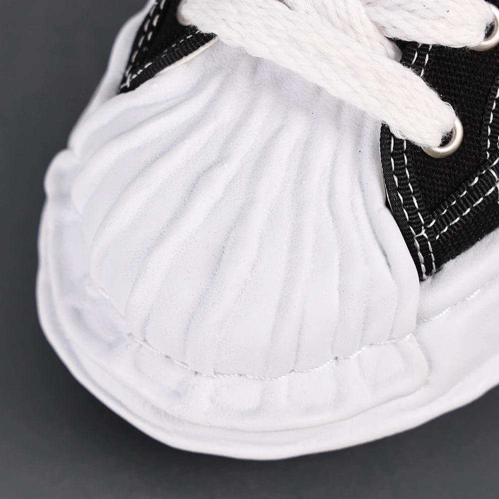 이 스니커즈는 브랜드 시그니처인 OG 솔이 적용된 디자인으로, 비정형적이고 독특한 곡선 형태의 고무 밑창이 특징입니다. 핸드메이드 감성을 담은 아웃솔은 예술적인 분위기를 자아내며, 전체적으로 블랙 캔버스 소재와 화이트 솔의 강렬한 대비가 모던하면서도 감각적인 인상을 줍니다. 심플하면서도 존재감 있는 디자인이 돋보입니다.