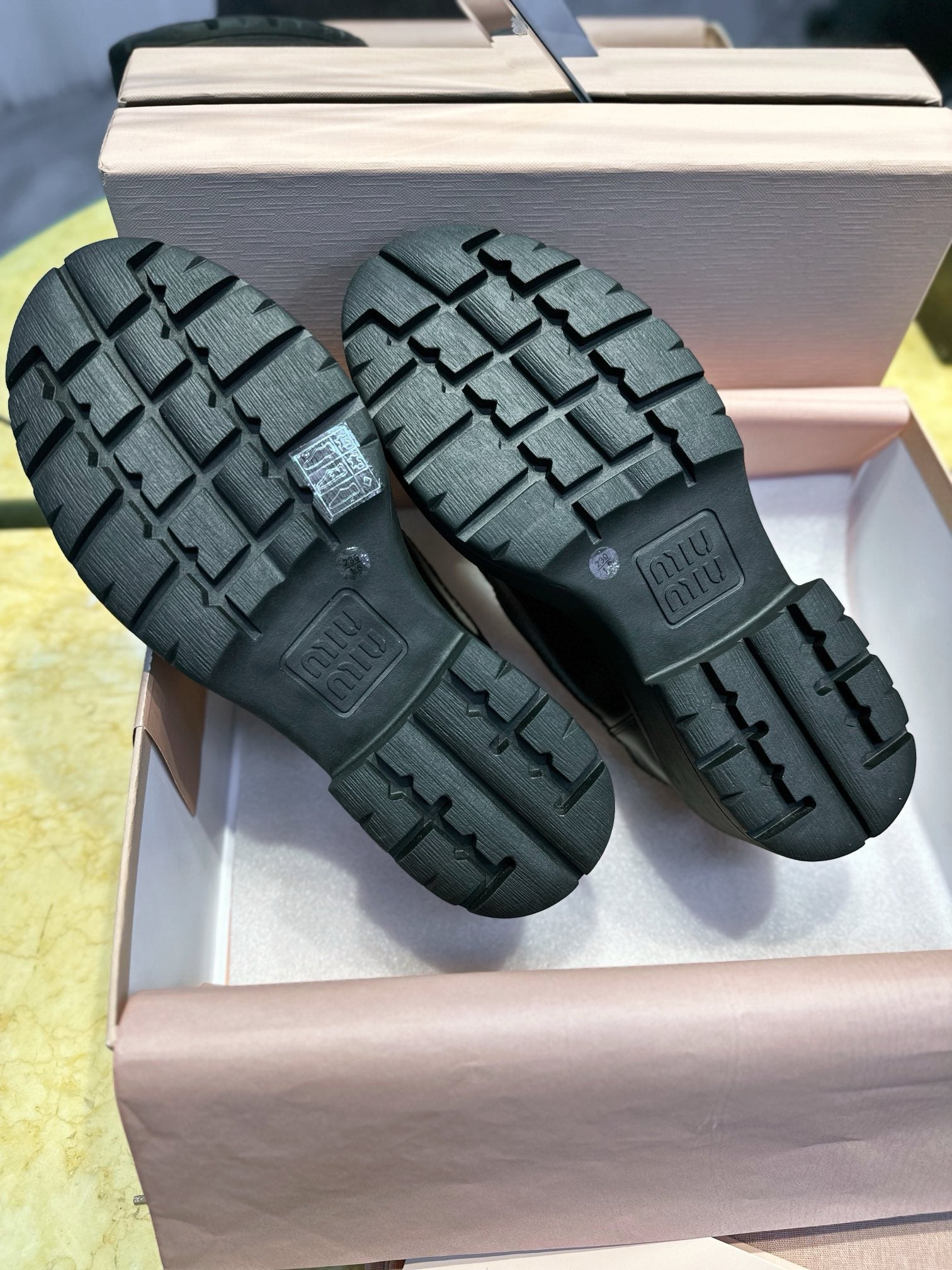 이 슈즈는 부드러운 송아지 가죽 또는 유광 브러쉬드 가죽으로 제작되어 고급스러운 광택과 내구성을 자랑합니다. 날렵한 앞코와 클래식한 레이스업 클로징이 전통적인 멋을 살리며, 미우미우 특유의 섬세한 라인과 스티치 디테일이 더해져 현대적인 느낌을 줍니다.
