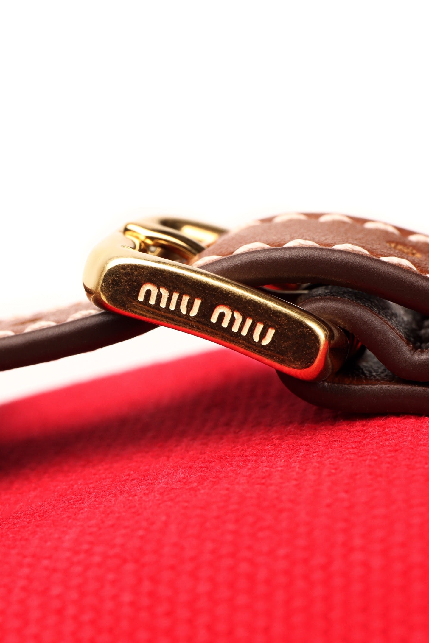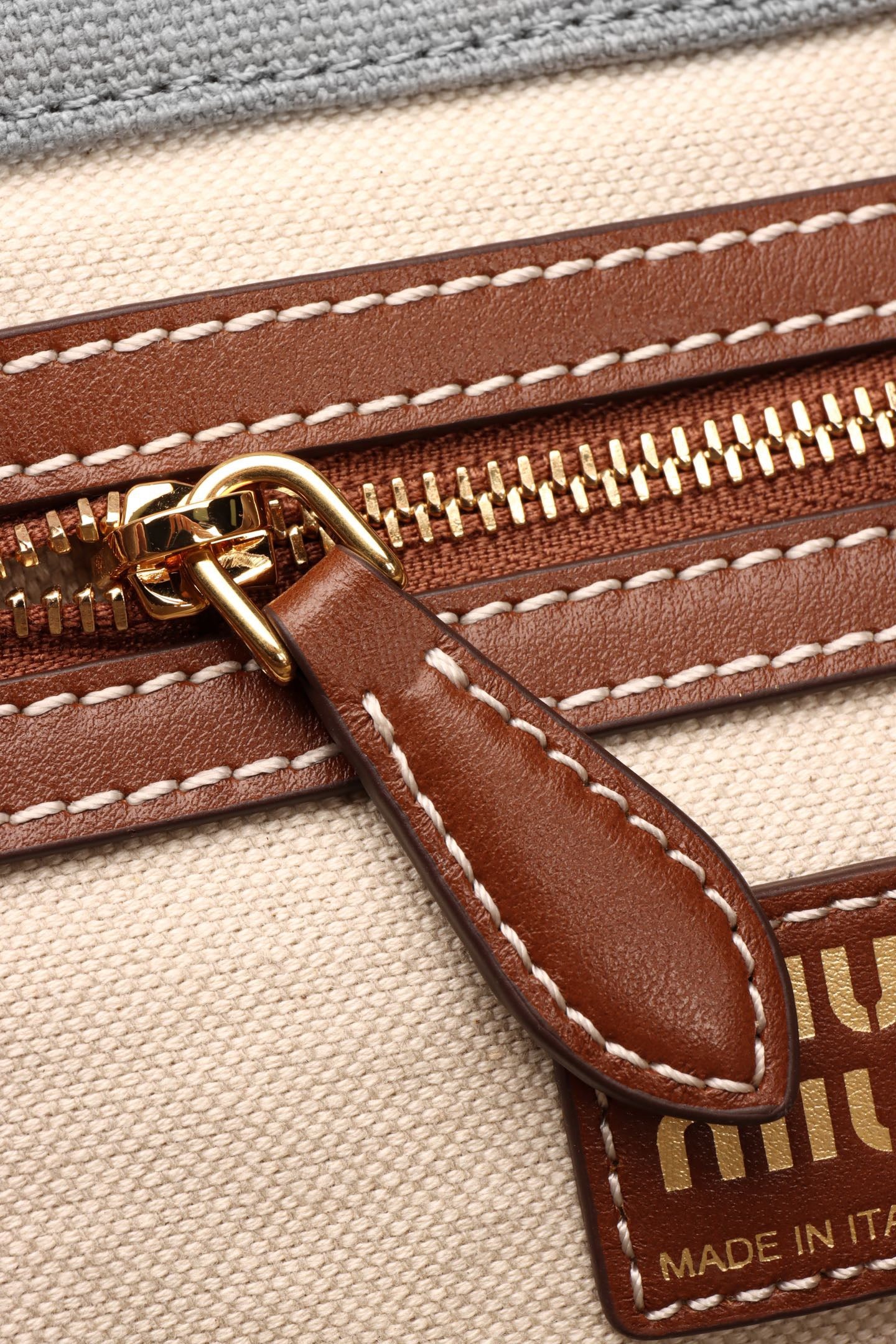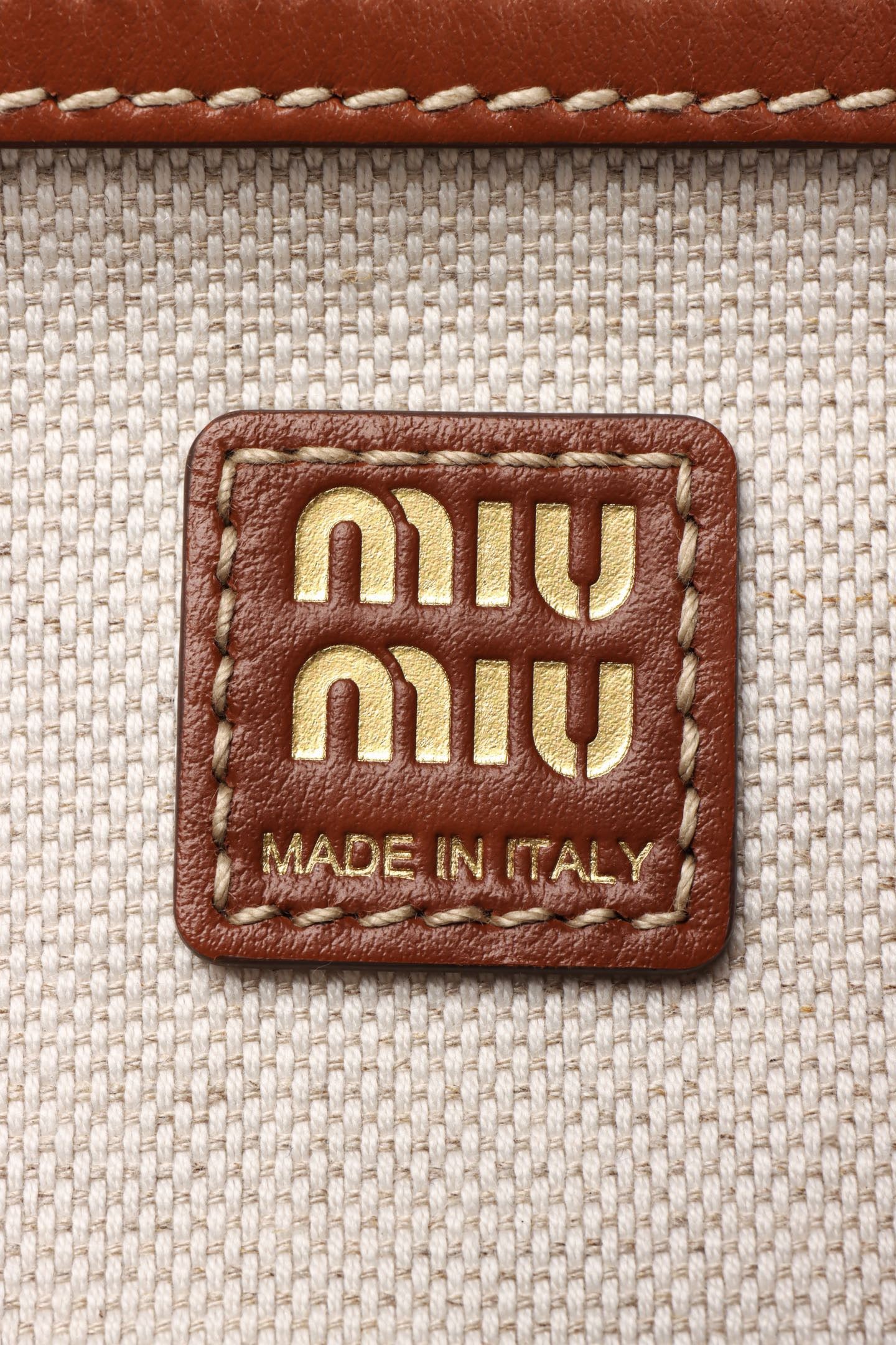 고밀도 코튼 캔버스에 소가죽 디테일이 더해진 디자인으로, 구조적인 플랩 클로저와 앤티크 골드 톤 하드웨어가 고급스러운 포인트를 더합니다. 전면 지퍼 포켓과 측면 플랩 포켓이 있어 실용적인 수납이 가능하며, 전면 플랩에는 각인된 미우미우 로고가 배치되어 브랜드 아이덴티티를 강조합니다.