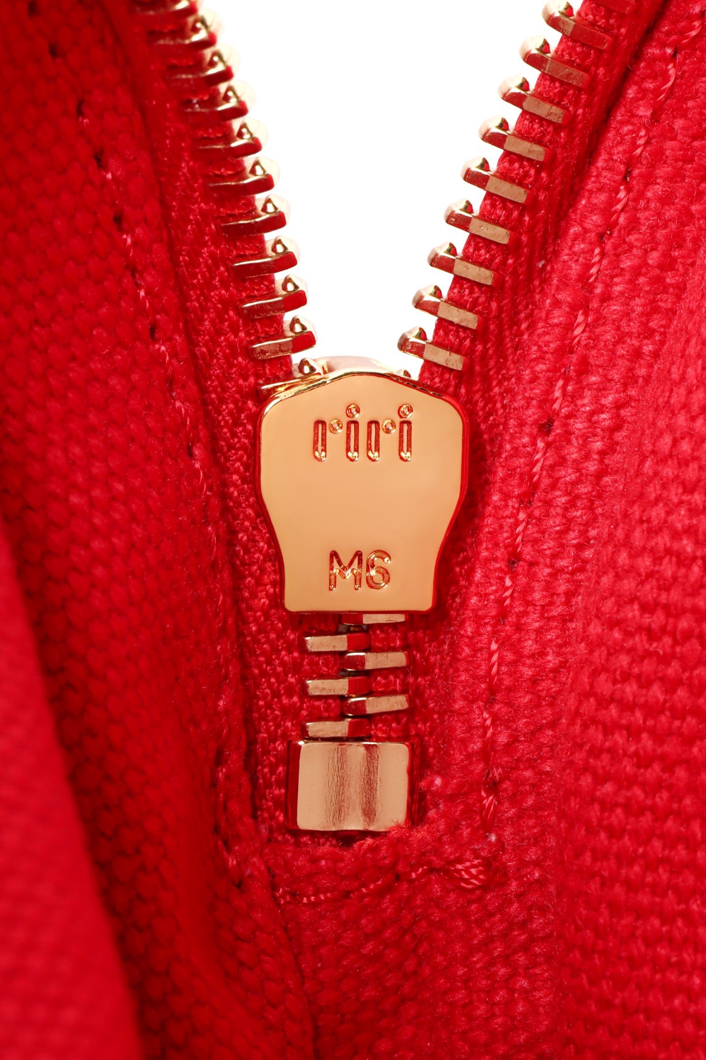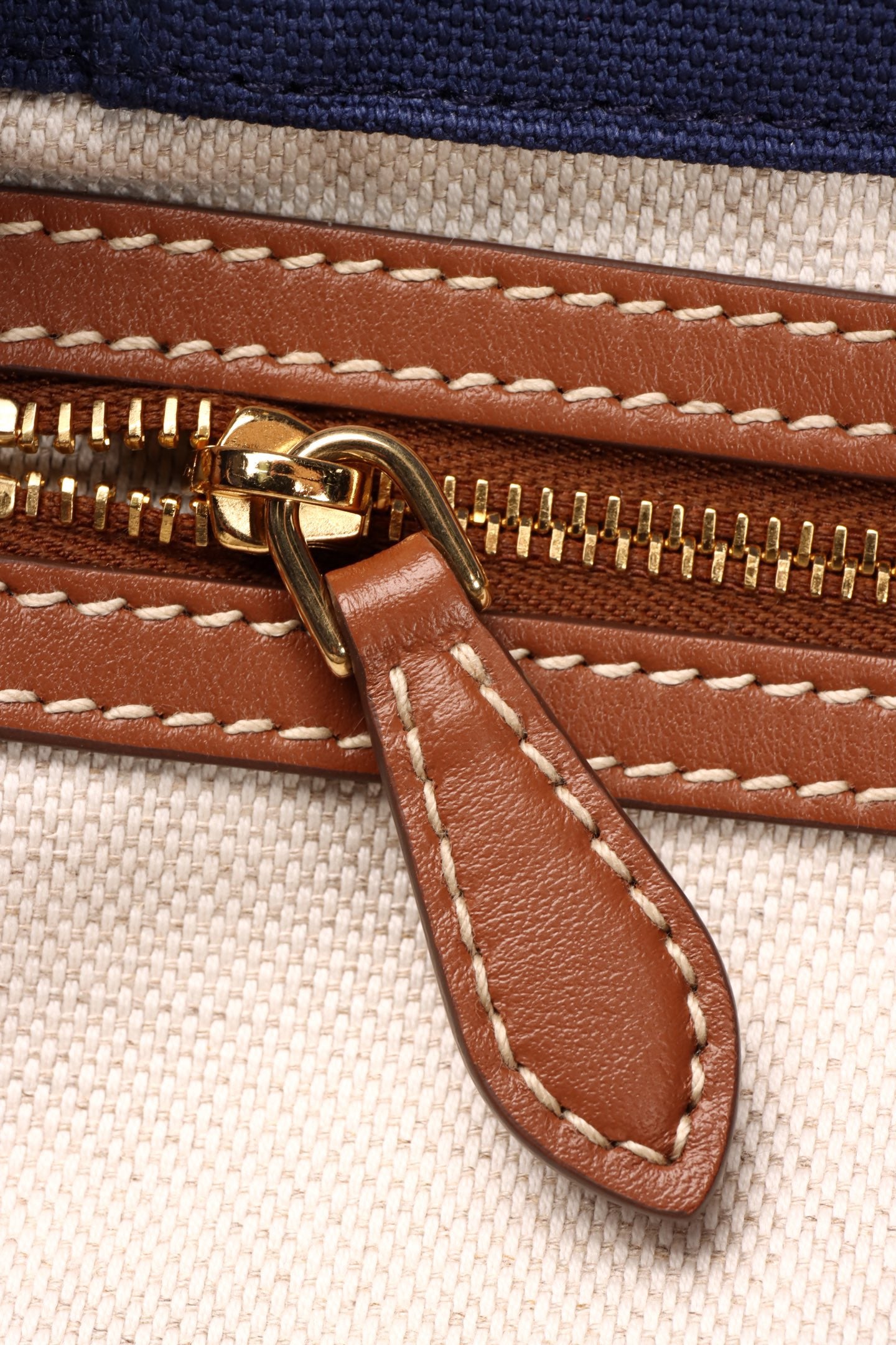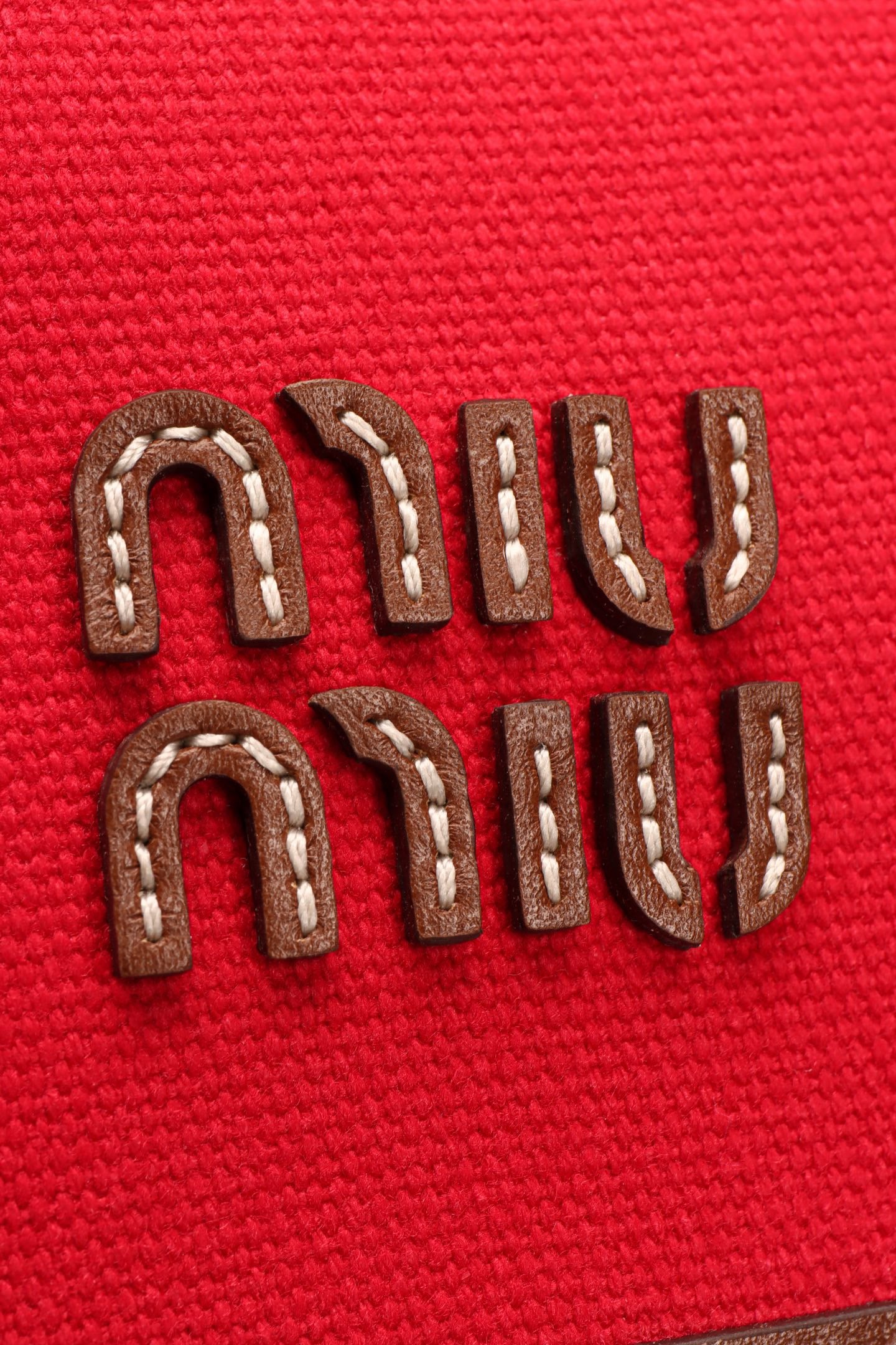 고밀도 코튼 캔버스에 소가죽 디테일이 더해진 디자인으로, 구조적인 플랩 클로저와 앤티크 골드 톤 하드웨어가 고급스러운 포인트를 더합니다. 전면 지퍼 포켓과 측면 플랩 포켓이 있어 실용적인 수납이 가능하며, 전면 플랩에는 각인된 미우미우 로고가 배치되어 브랜드 아이덴티티를 강조합니다.