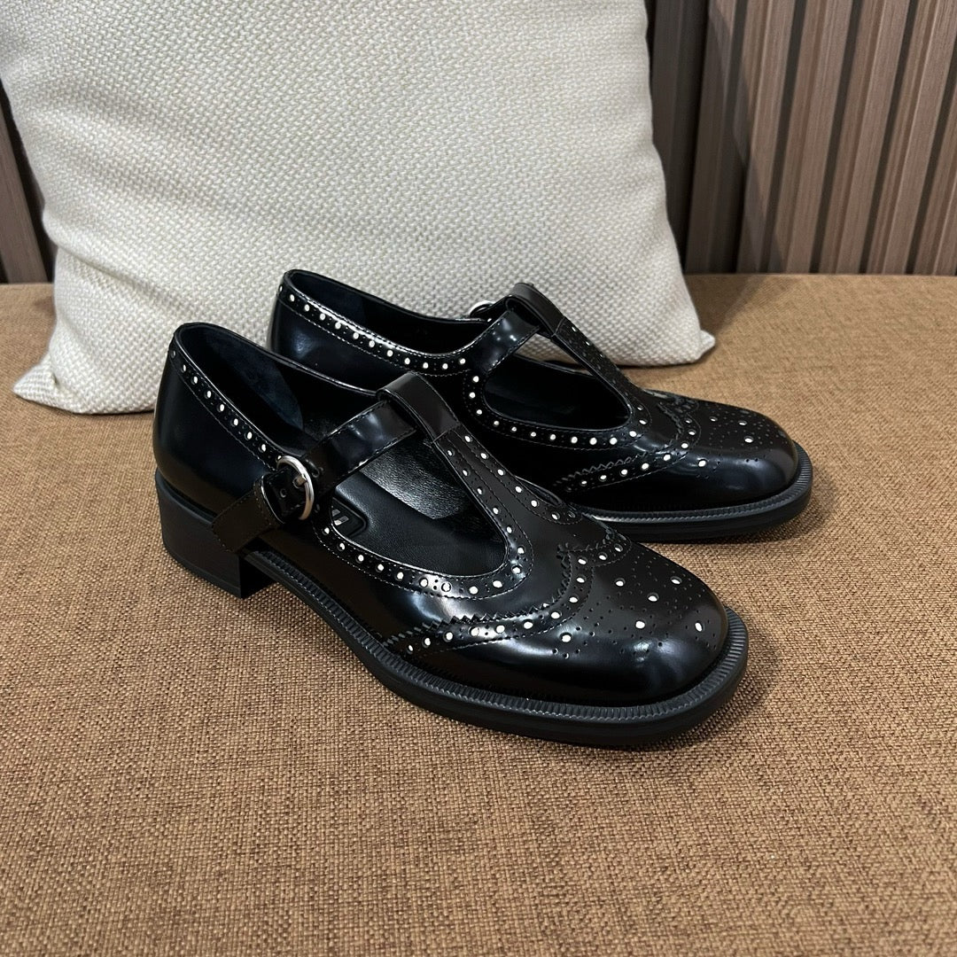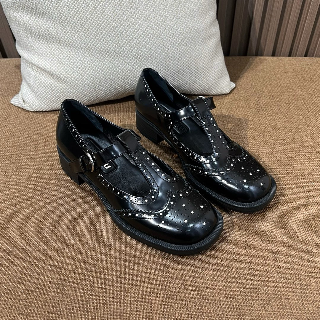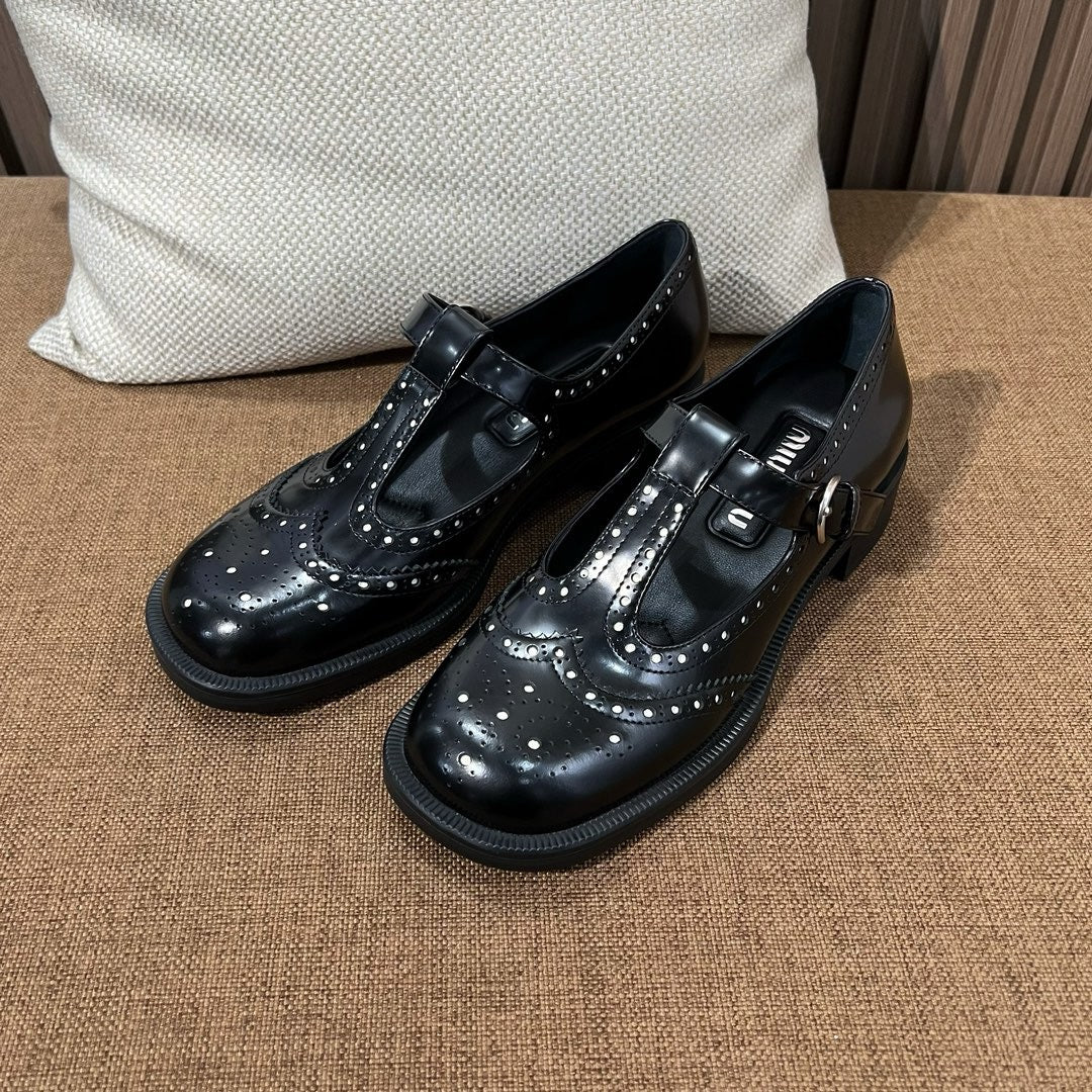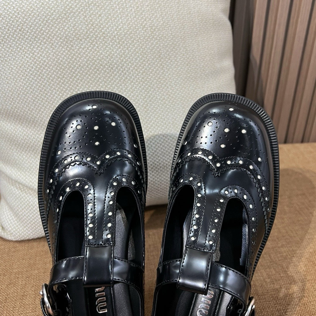 미우미우 브러쉬드 레더 티 스트랩 브로그 슈즈(Miu Miu Brushed Leather T-Strap Brogue Shoes) - 클래식과 페미닌의 조화