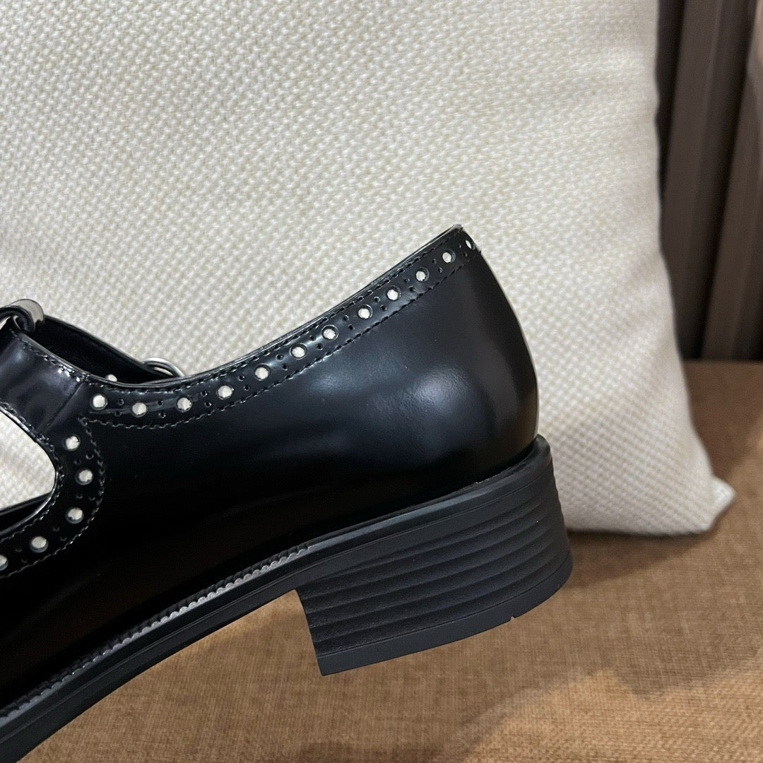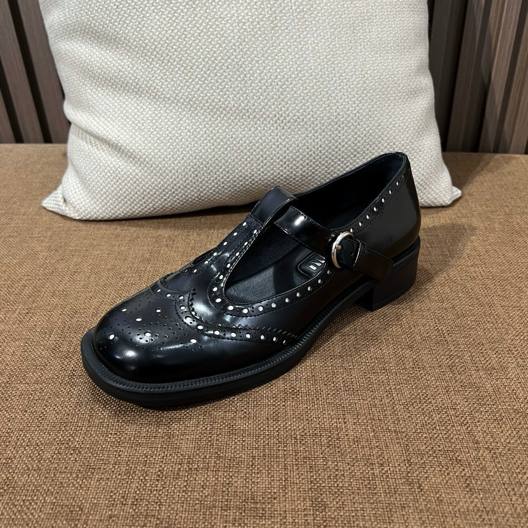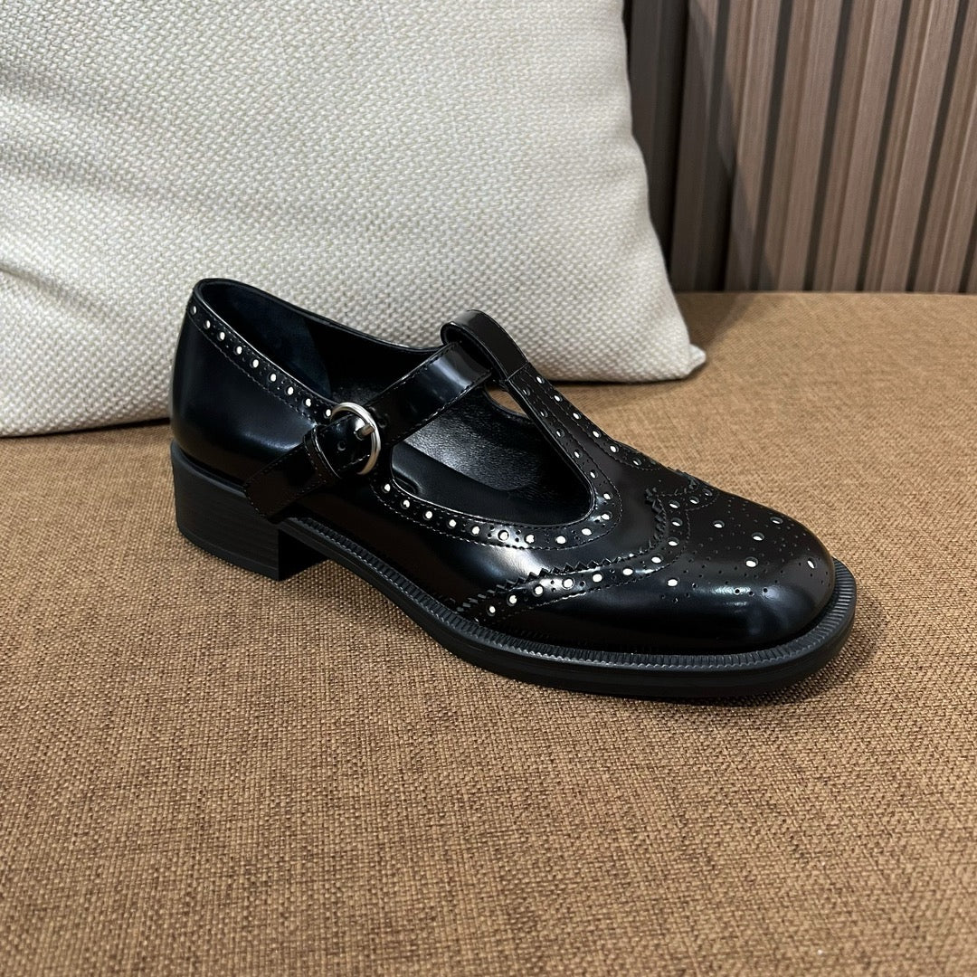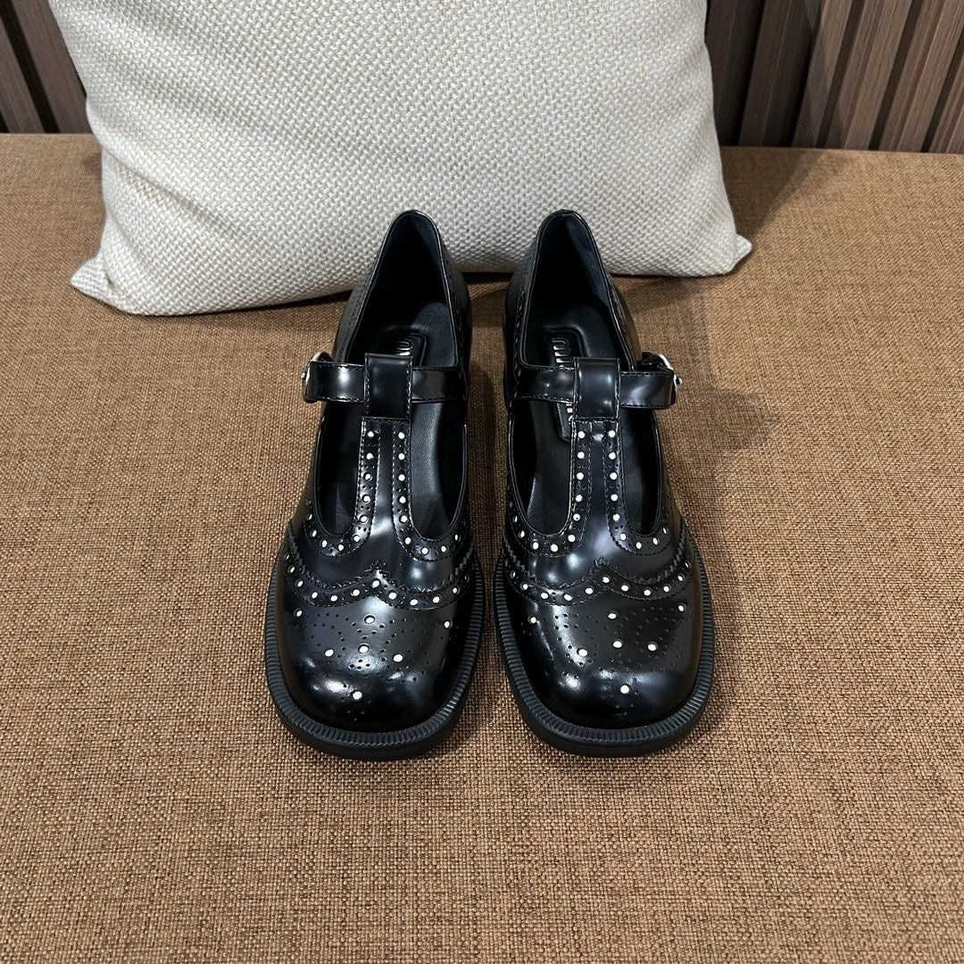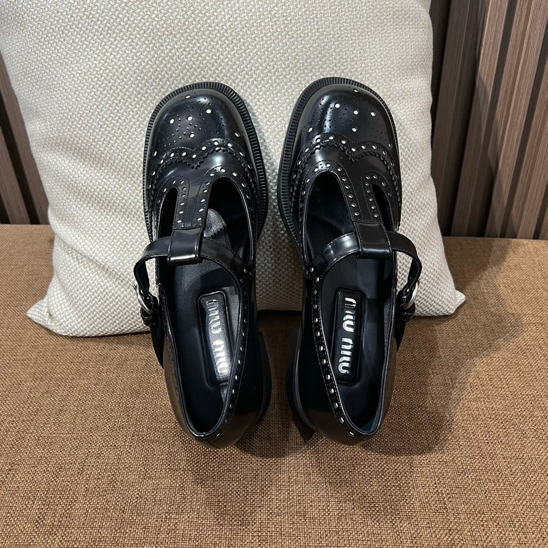 미우미우 브러쉬드 레더 티 스트랩 브로그 슈즈(Miu Miu Brushed Leather T-Strap Brogue Shoes) - 클래식과 페미닌의 조화